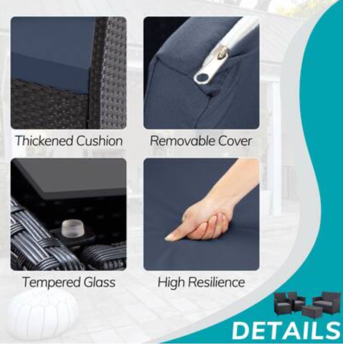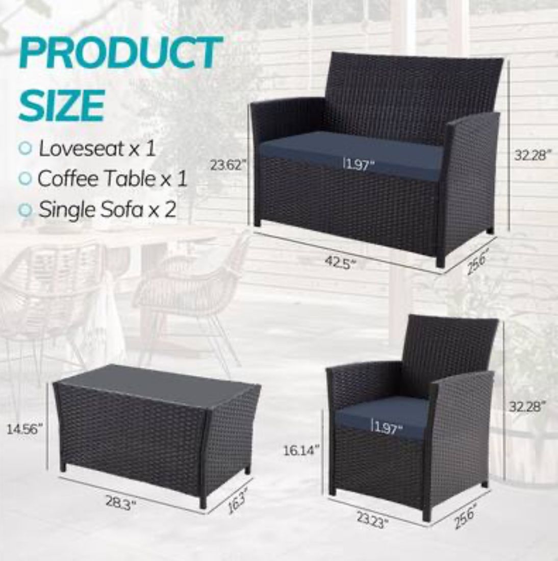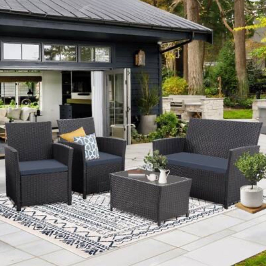 VenmoNEW IN BOX! 4-Piece Set Outdoor Patio Sofa with 4-piece sofa set with coffee table. black wicker rattan with blue cushions. Two seater sofa, two chairs and coffee table with glass top