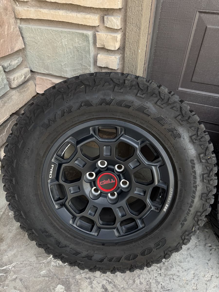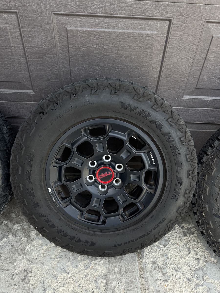 VenmoSelling my take offs from my tundra TRD pro. These are genuine BBS TRD pro wheels that come with the tundras and sequoias. These are 18x8 with 6x139.7 bolt pattern, so they should work with the new 4Runners and tacomas with proper lugs. Price is for the TRD pro wheels, tires are just a bonus. These go for over $1k a piece new. They come with 285/65r18 Goodyear wrangler ultra terrain AT tires that have about 7k miles. 2 of the tires have a little more wear on the outside of the tire due to improper alignment but tred is still full on the rest of the tire.