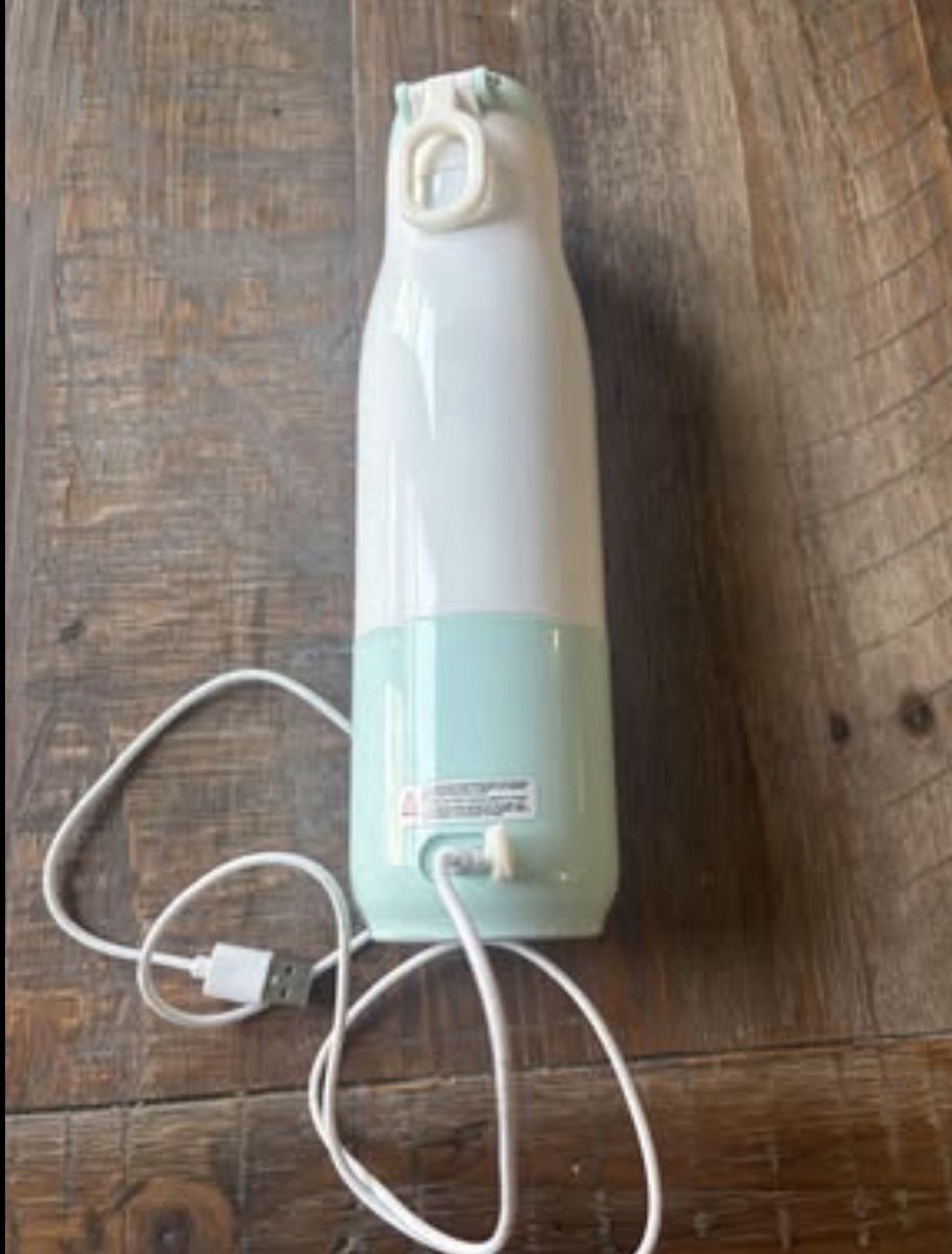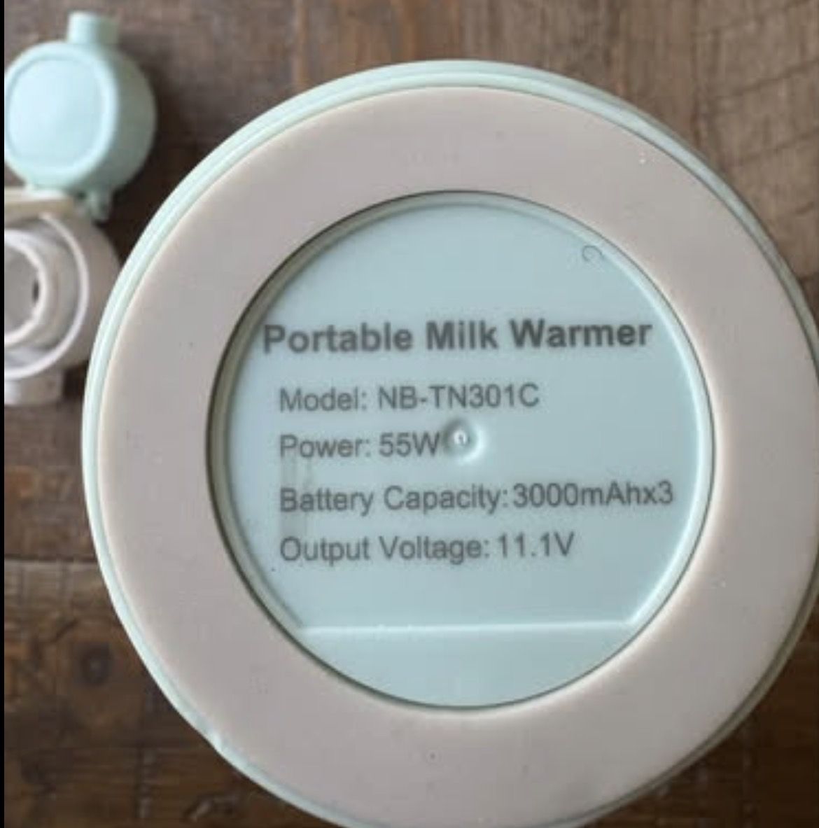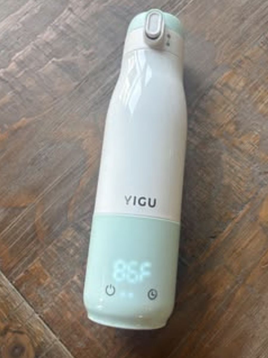 YIGU portable bottle warmer. Liquid heating amount up to 12 oz. Uses a lithium battery that charges fully within 3 hours. Can heat up up up to 5 oz of liquid, 8 times on one charge and/or maintains liquid temp up to 20 hours. Heats liquids anywhere from 77-104F in around 2 minutes time. Inside is food grade stainless steal and charger is included.