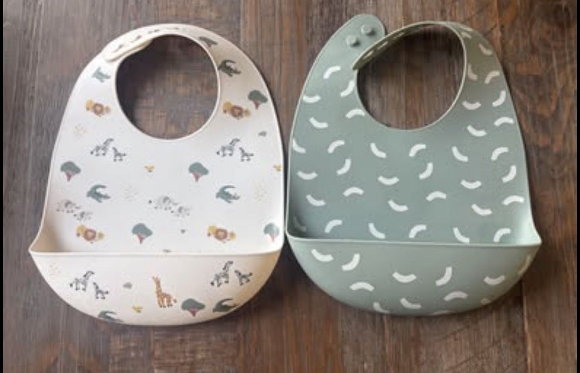 2 Silicone bibs with food catcher - silicone is food grade, BPA free, PVC & phthalate free, adjustable neck closure, dishwasher safe. Items bought from Target