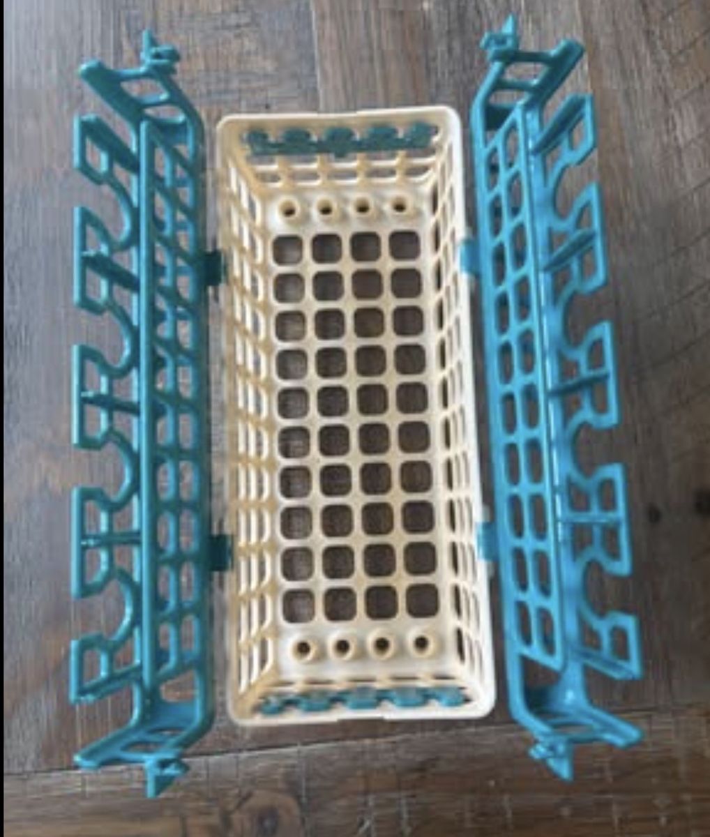 Oxo dishwasher basket for bottle parts and accessories. Teal and white colored. Dishwasher safe, 6 oz capacity, accommodates up to 8 bottle nipples and accessories.