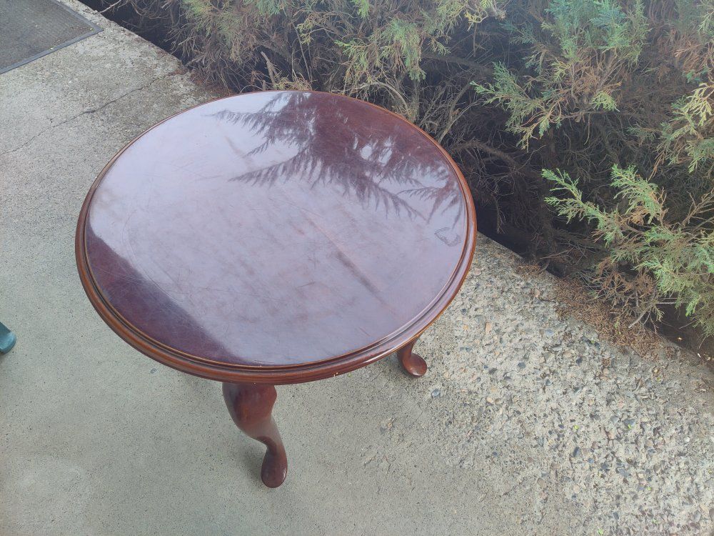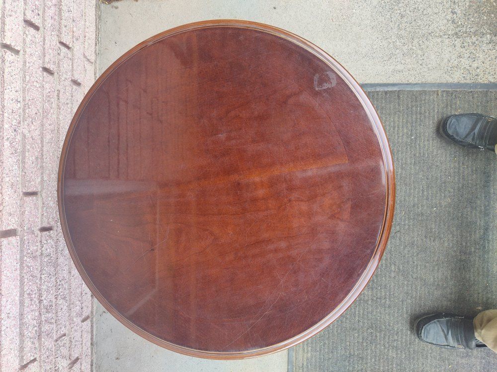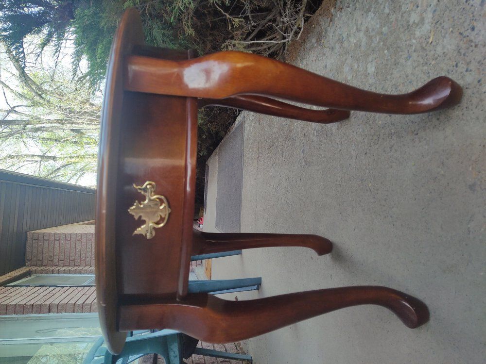 Small table with a faux drawer, just for looks. 24" in diameter and 21" tall. Let me know if you have questions or need more photos. Overall in good shape, could be cleaned up a bit and have the screws tightened..