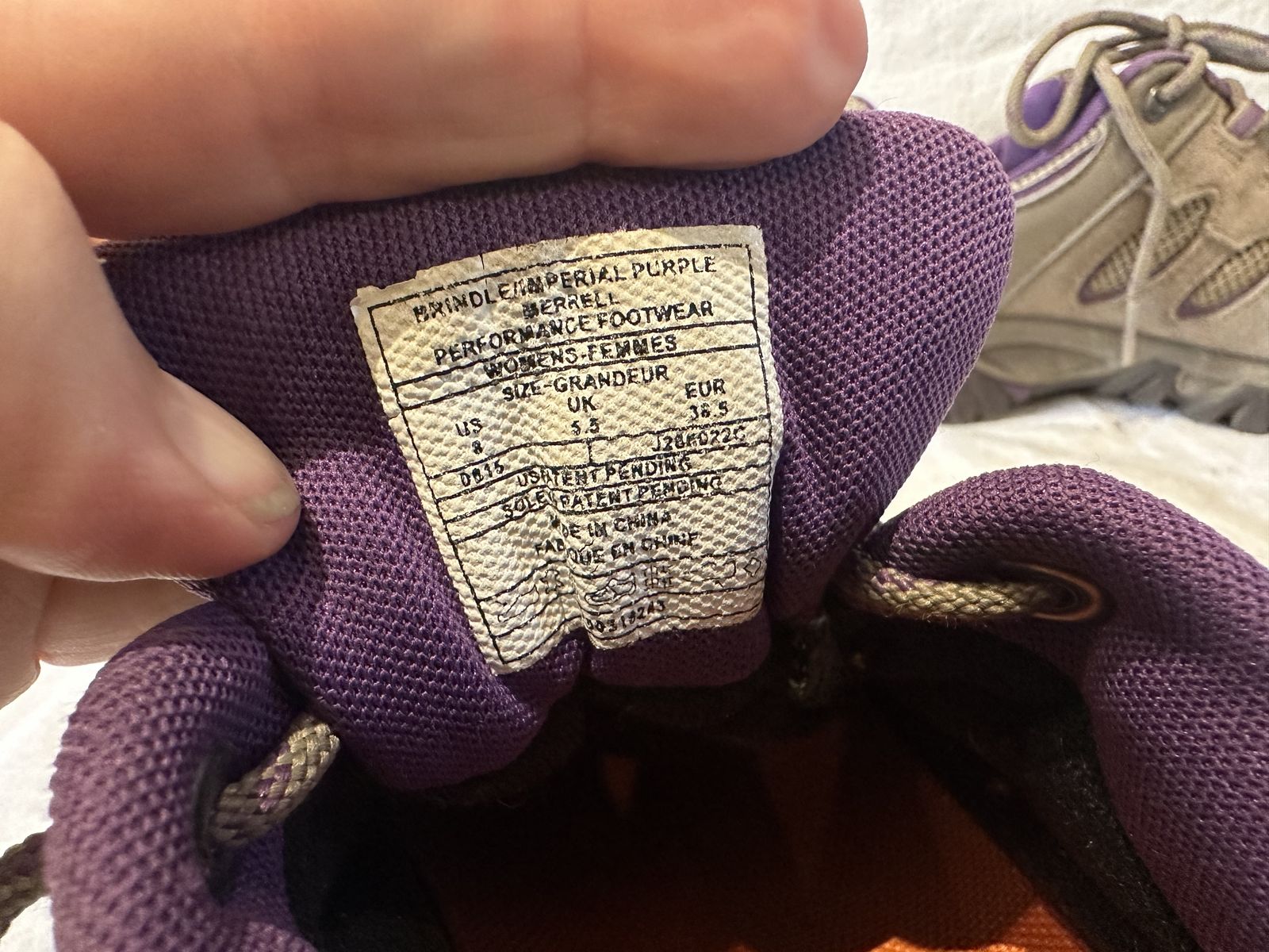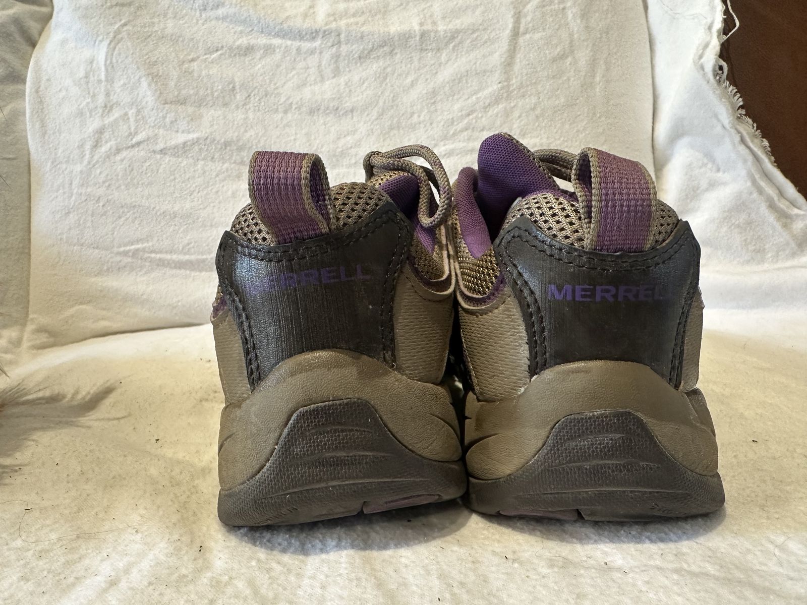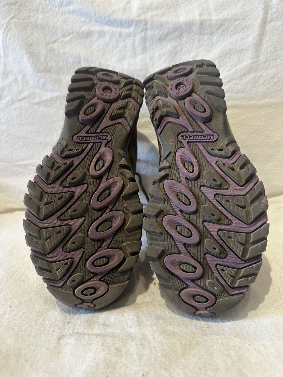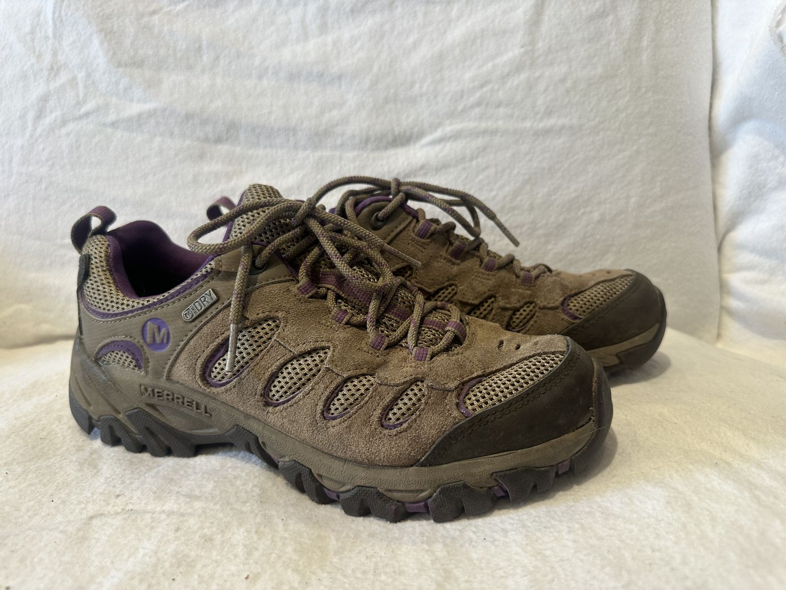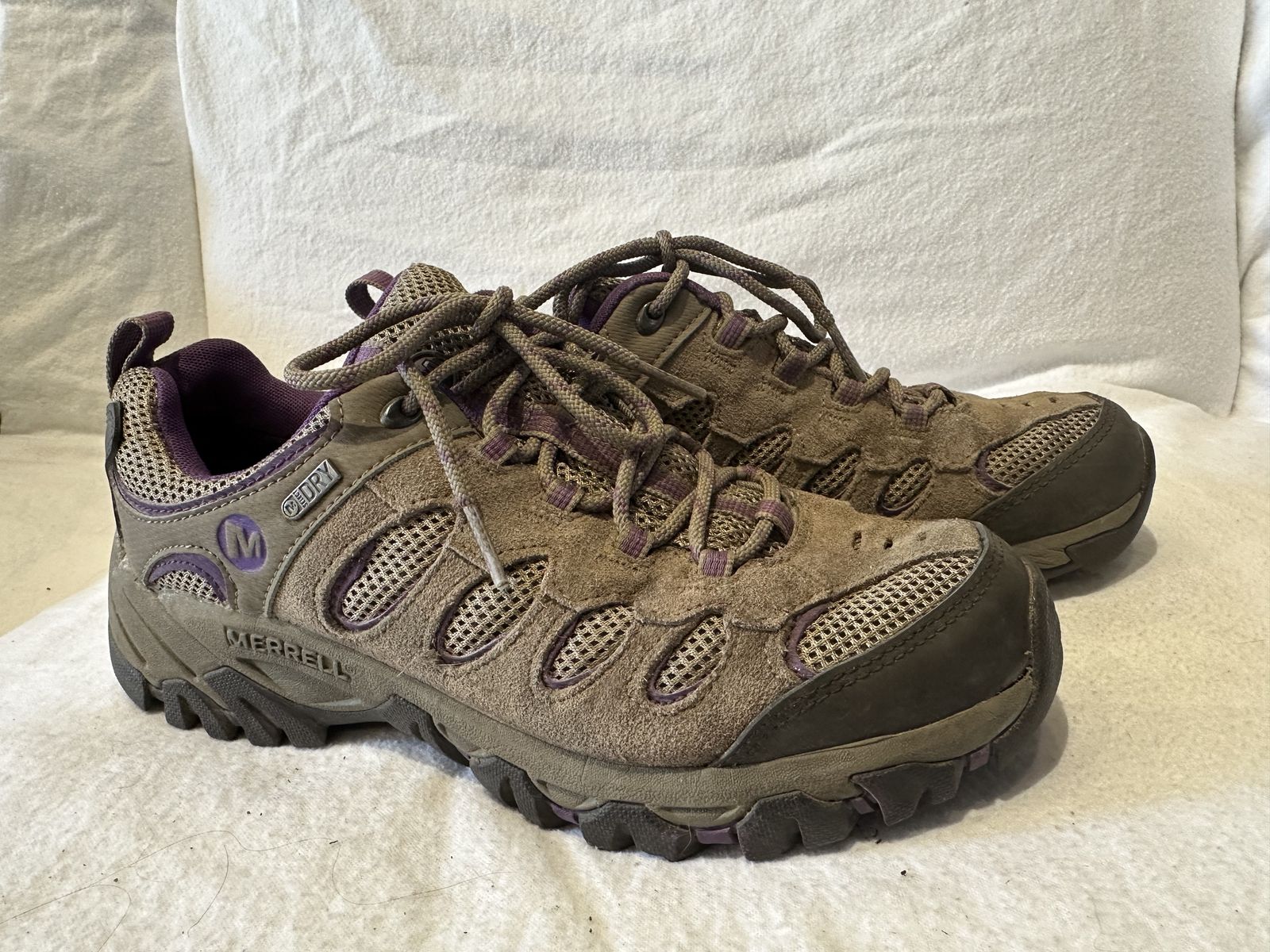 Merrell women’s size 8 beige/purple waterproof hiking shoes. These are called brindle with imperial purple. They are waterproof and in lightly used condition. See photos for details. I take cash or Venmo, but cash is preferred. Text is best. 801-201-4446. Check out my other ads for additional sizes and styles.