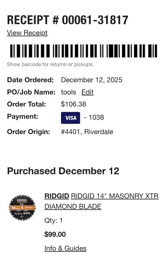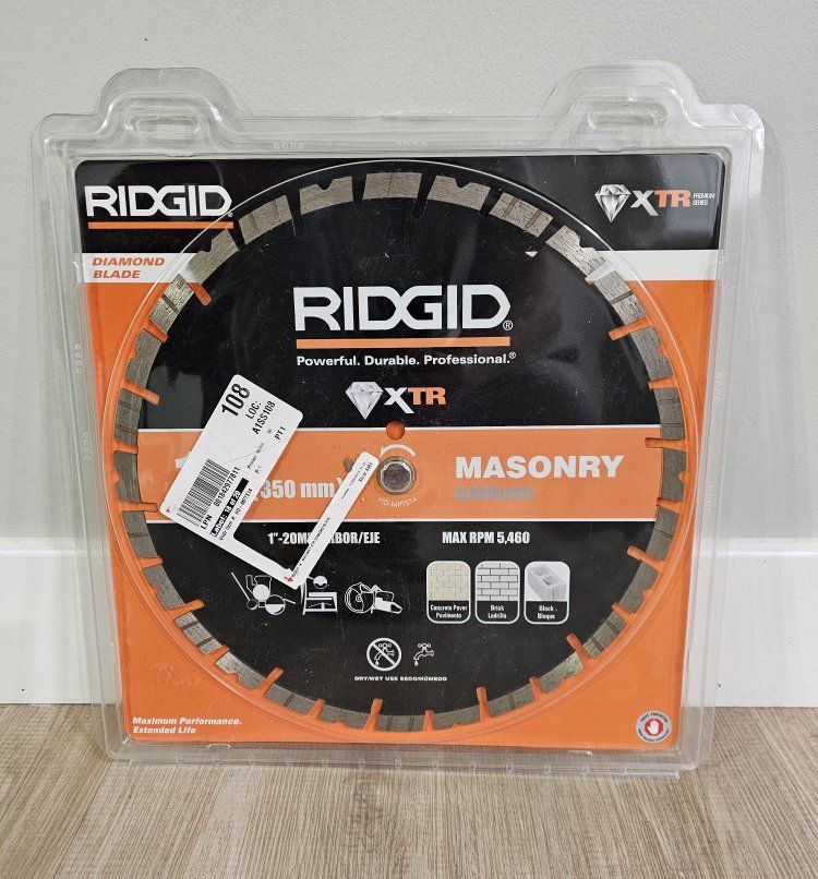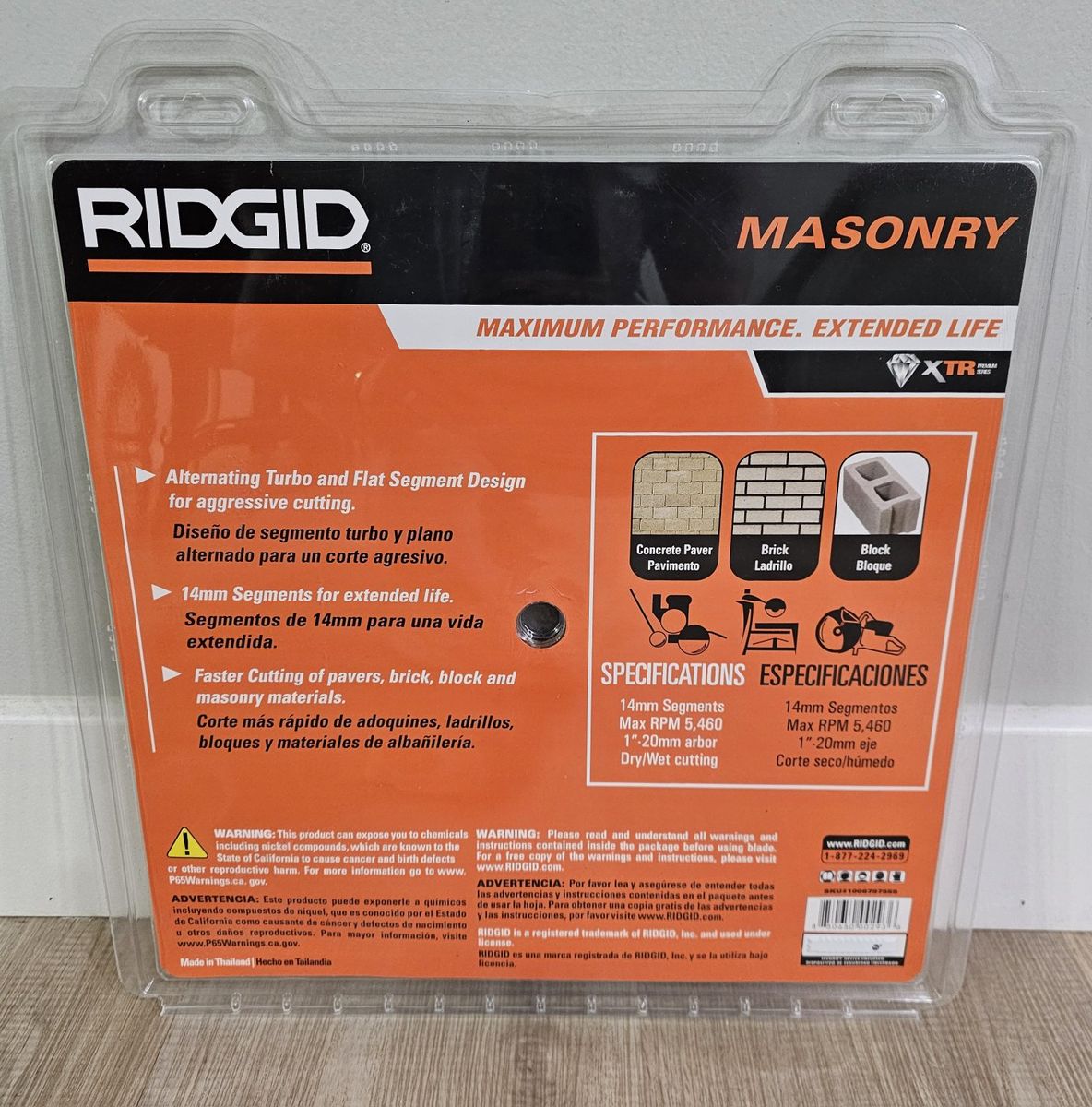 14 in. Masonry Diamond Blade Purchased for $106.38 each from HOME DEPOT I'm outside of my return window. My loss your gain. See photos for proof of purchase. About This Product RIDGID Masonry Diamond Blades are manufactured with the contractor in mind. These blades are engineered to provide superior cutting speed on a wider variety of materials. The alternating turbo and flat segments cut faster and more aggressive with outstanding performance on both hard and abrasive masonry, concrete, hard brick, pavers, block and stone. The abrasive resistant undercut segments protect the core against damage from the harshest of materials. Use this blade on 14 in. masonry saws, high-speed power saws and low-horsepower walk-behind saws with 1 in. arbor, 20 mm adapter included.