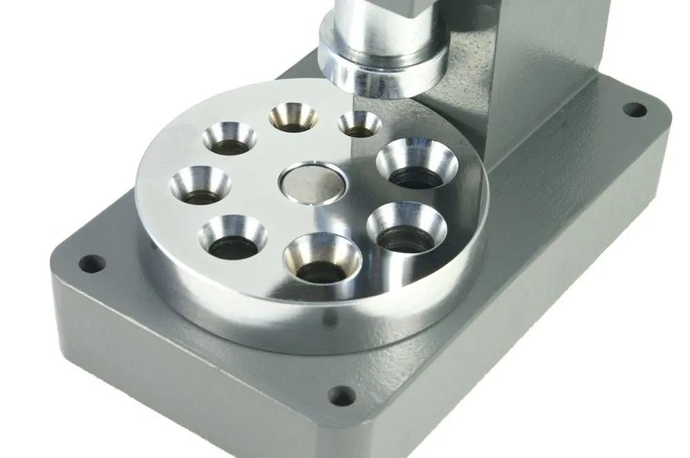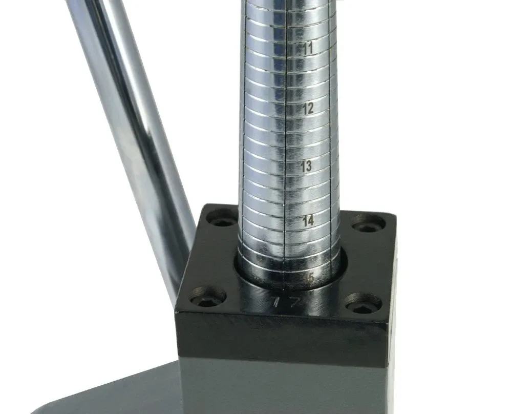 High quality ring stretcher and reducer resizes ring bands from size 1-15 (US sizes). The highly polished 6-spline mandrel is graduated in 1/4 sizes for smoothly and accurately enlarging rings and the smooth-finished reversible base plate has 16 reduction dies. This compact model measures 18 x 4.5 x 7.5” (39.5 x 11.5 x 19.0 cm).