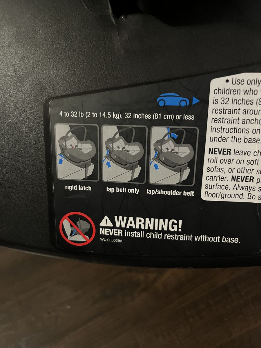 It's good from 4 to 32 lbs and 32 inches or less. It can only be installed facing backwards and with the base. The base has adjustable rigid latch system but also works with the seatbelt. It's the lightest carseat available, only 5.3 lbs.