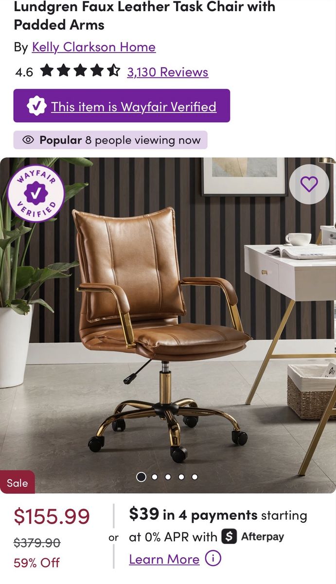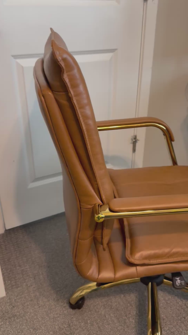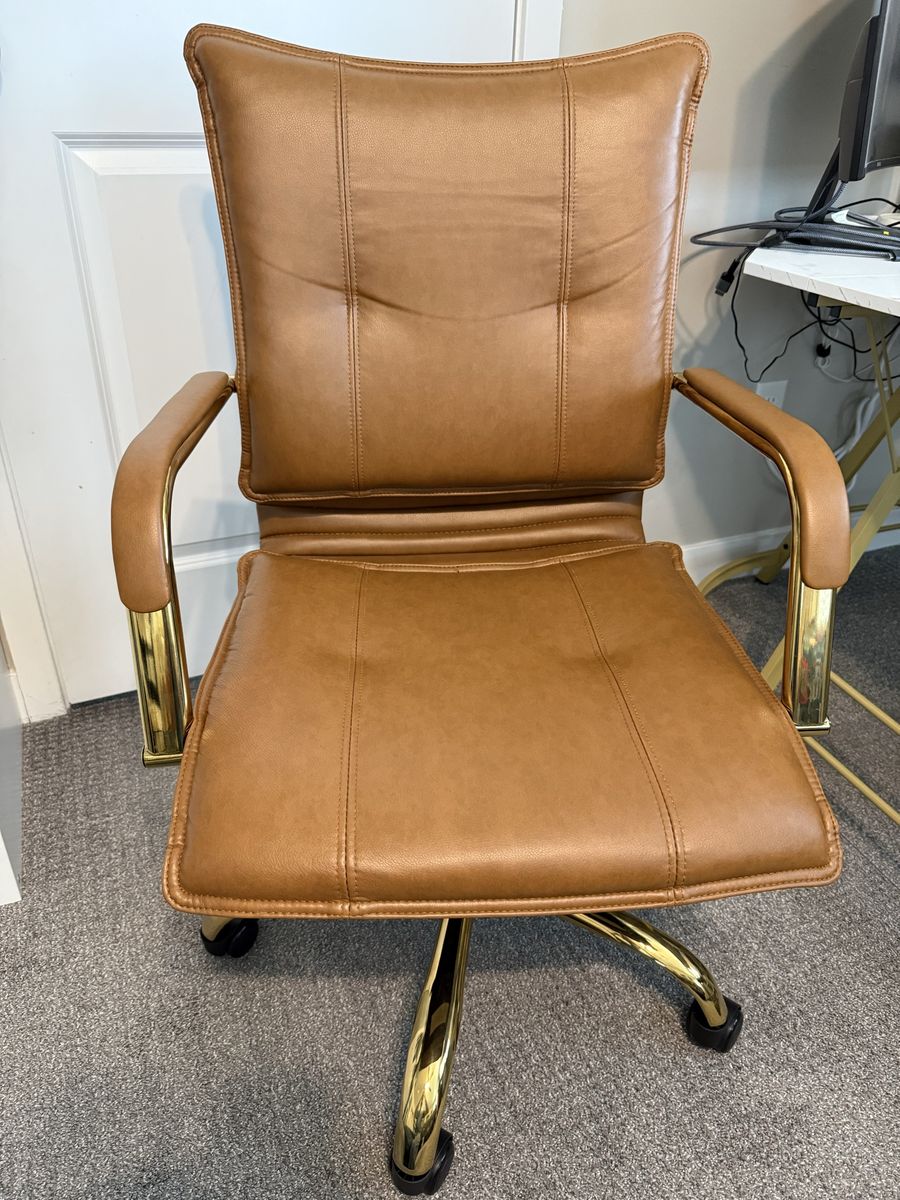 ZelleUsed less than a year. Bought it new. Still in great condition. Color is camel brown with gold legs and arms.