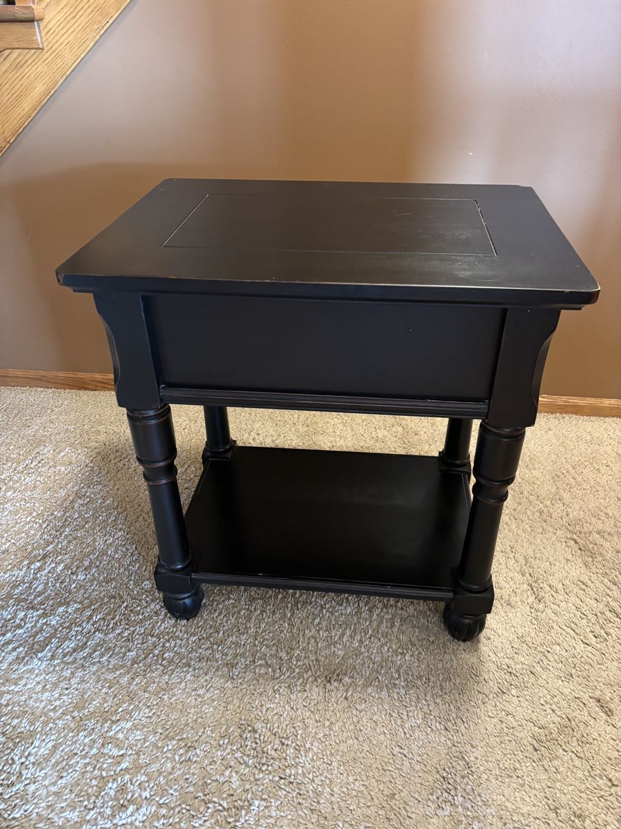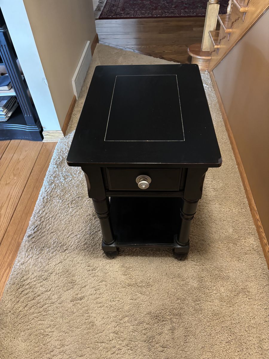 Solid, sturdy and lots of detail. Has a small drawer. 24” wide 25” deep 27” tall Good condition. Located in Bluffdale