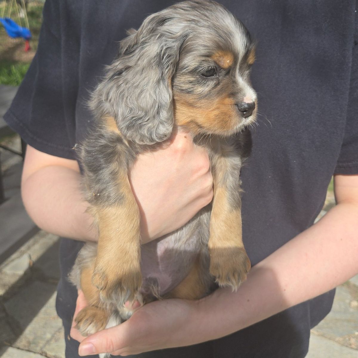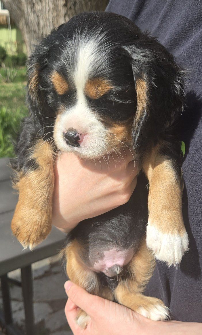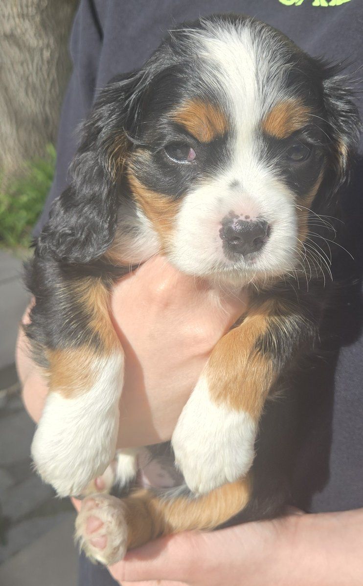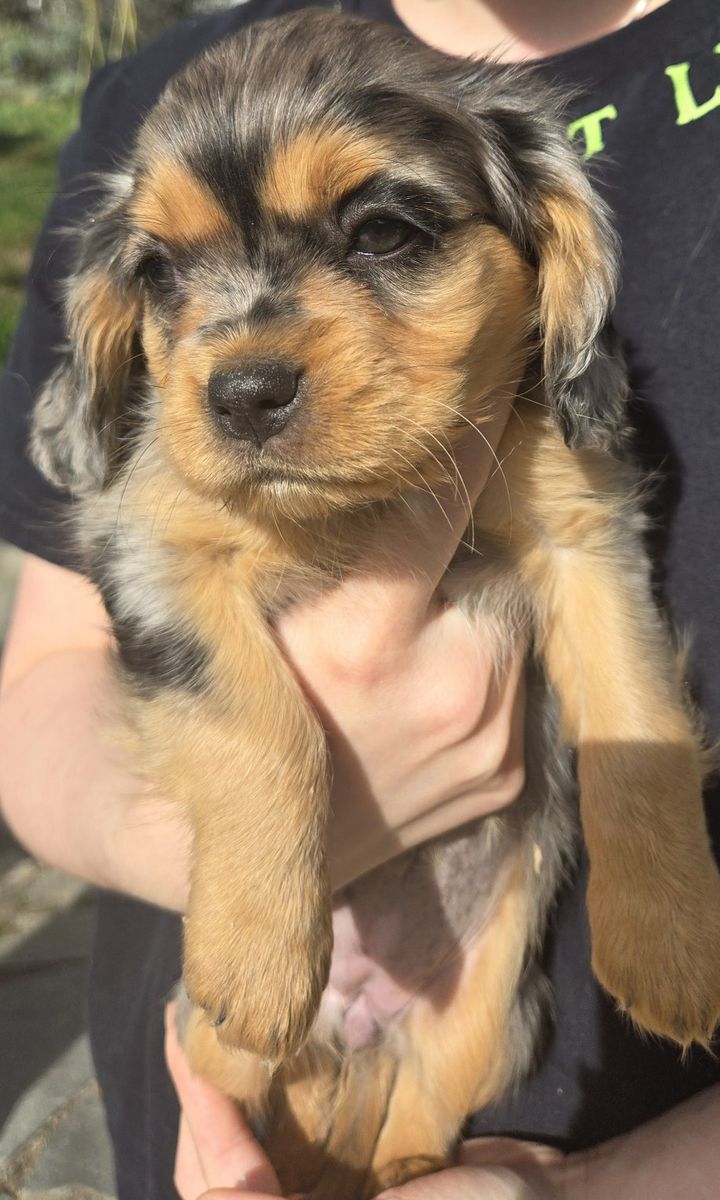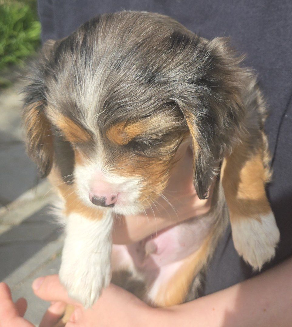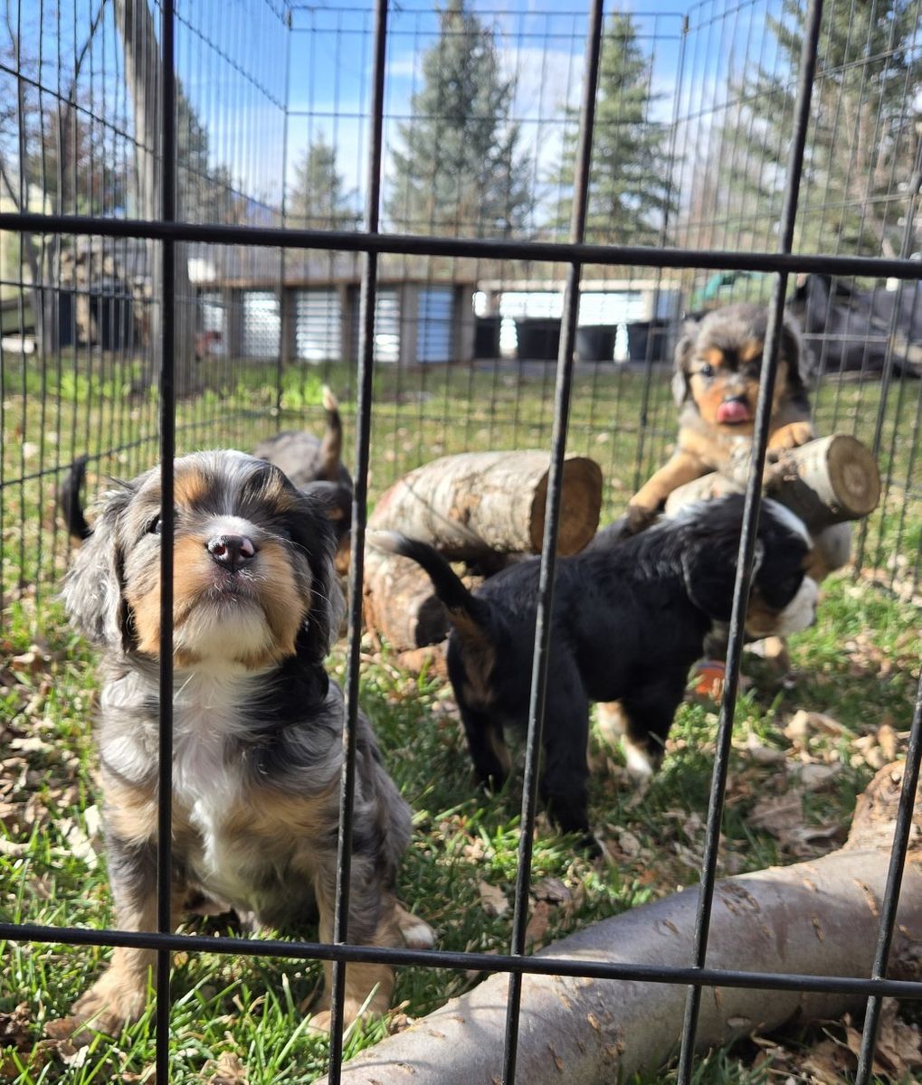 Aussalier puppies are a cross between a King Charles Cavalier and a Mini Australian Shepherd . They are intelligent ,loving, and playful. Have curly soft coats and come in various colors including blue merle black and tan ,and tri color. They weigh 9 -20lbs .They love games hiking walks and cuddling on the couch $ 700.00 dew claws have been removed and they have received there first shots and wormer