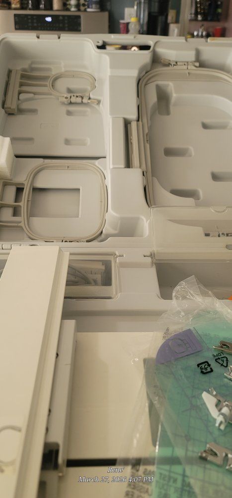 babylock elegante' embroidery machine. Comes with hem and regular sewing arm plus separate embroidery arm and embroidery frames. EZ thread needle, extra needles, thread, etc.