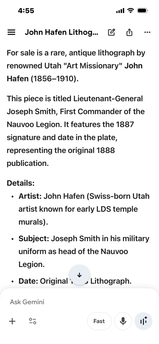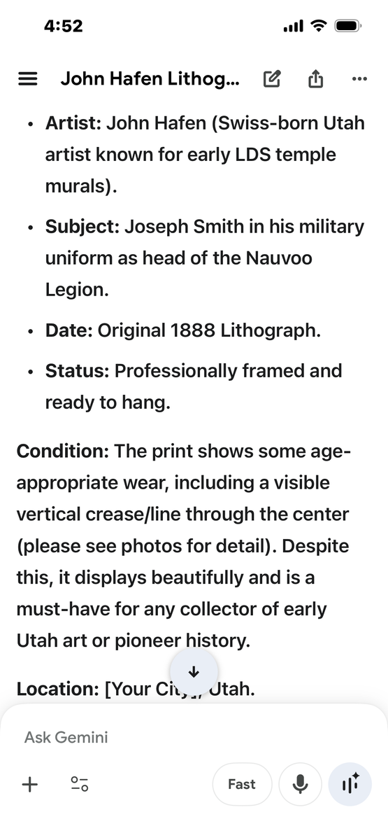 PayPalLieutenant Genreal Joseph Smith. Outside of frame measures 23" wide x 28" high. Image size is 12" wide x 38" long. Good overall condition. $80 firm.