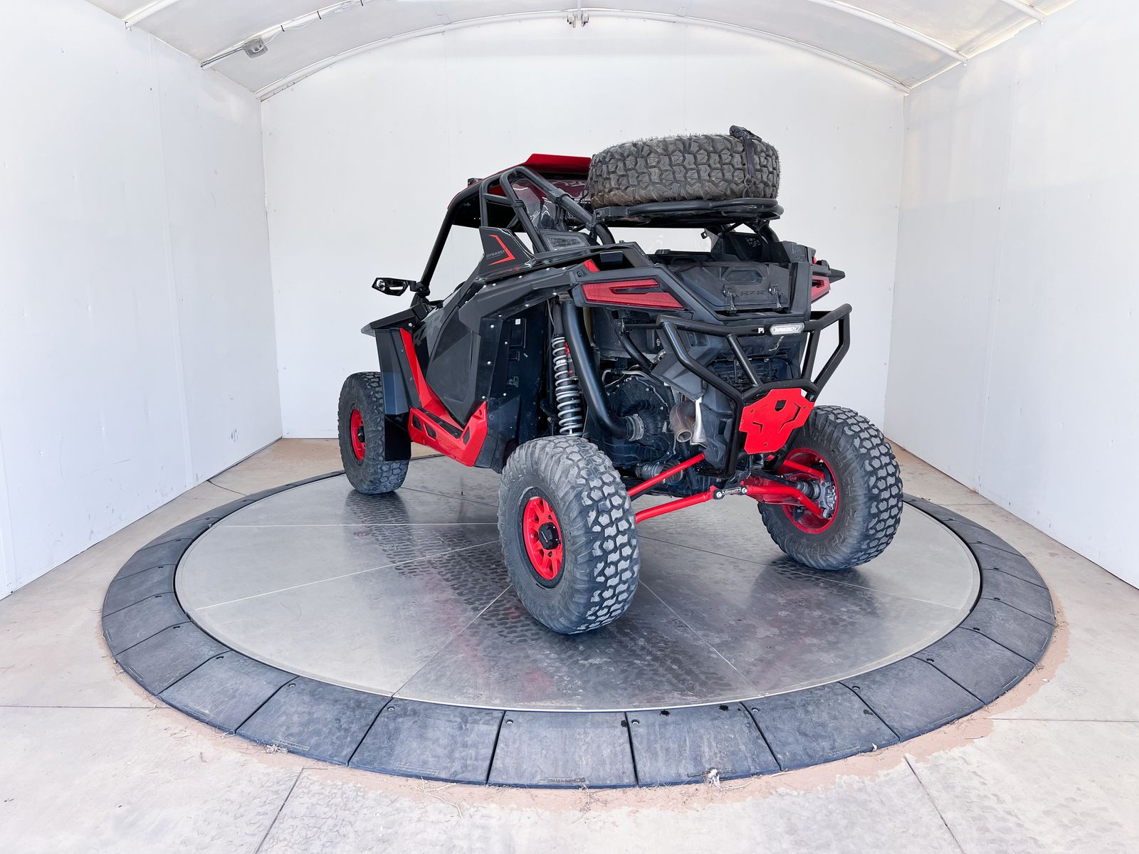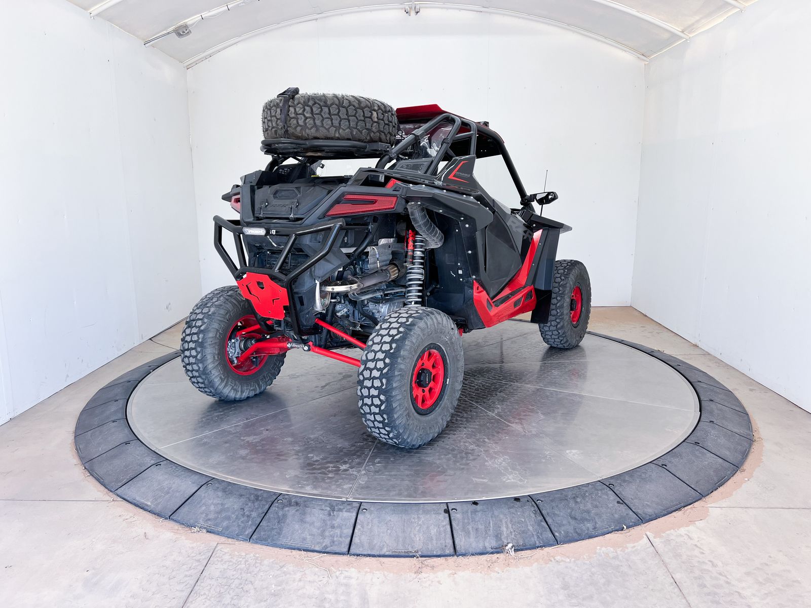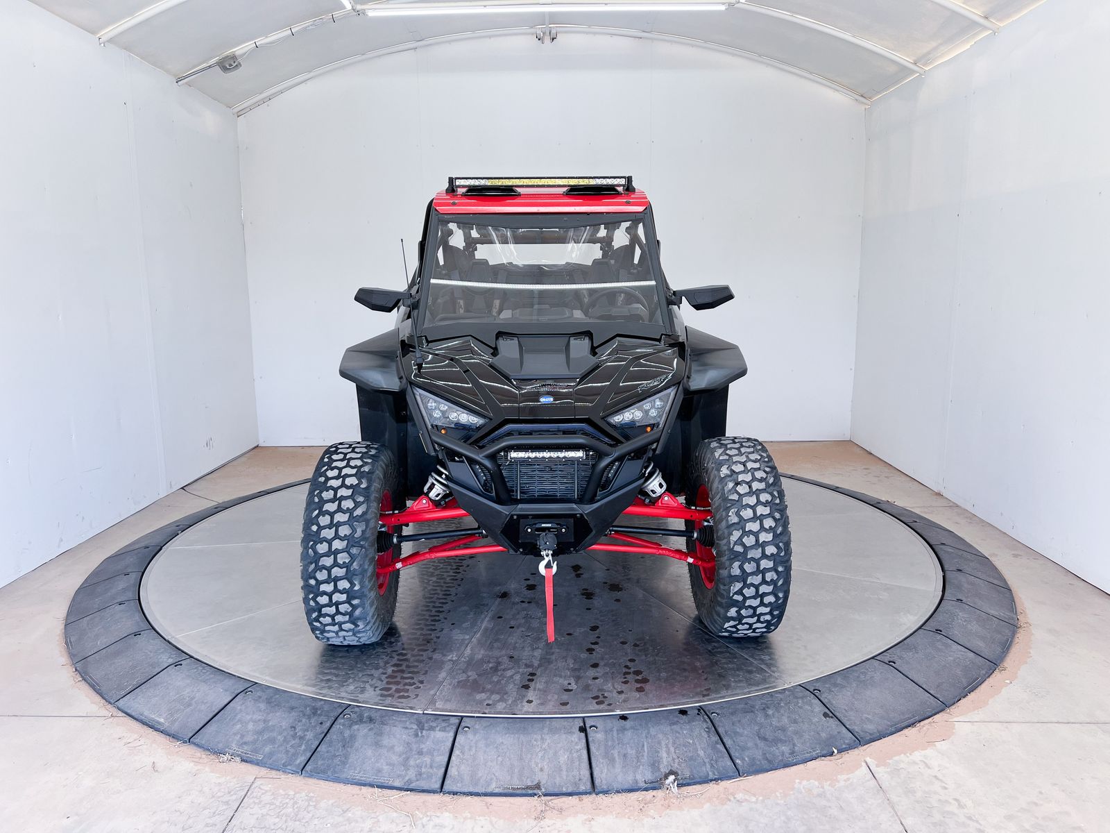 This machine comes equipped with a front bumper with a light bar, winch, street legal kit, front glass windshield, roof with a light bar, 32" tires with System 3 Beadlock rims, extended fender flares, upgraded springs, rock sliders, door bags, rear windshield, spare tire rack with a spare tire, rear bumper with light bar, rear Polaris storage and cooler box.