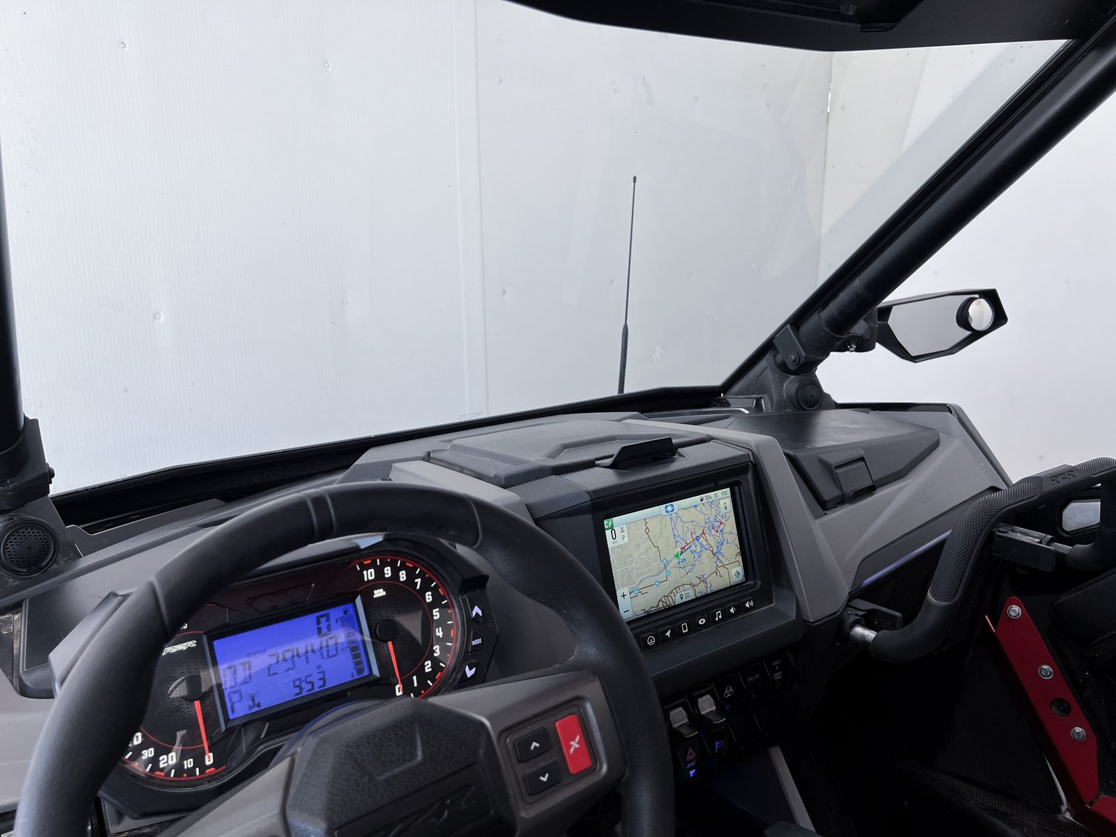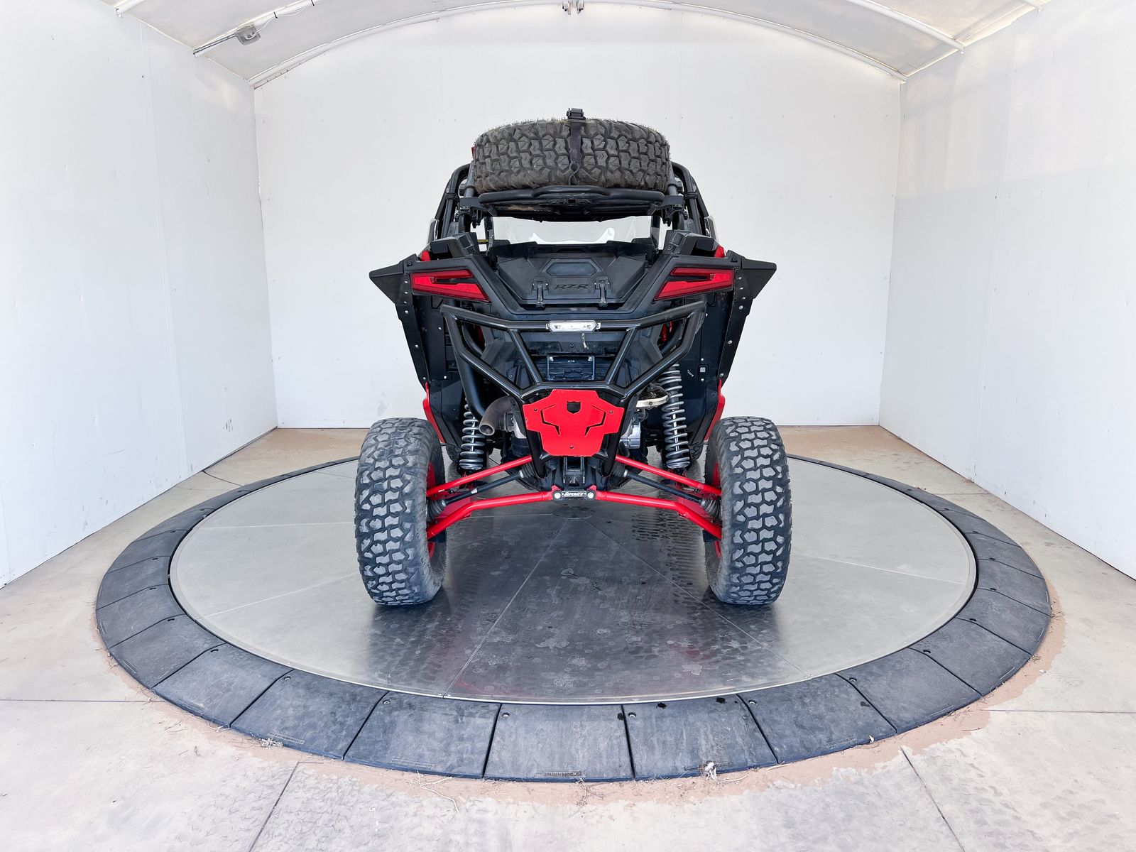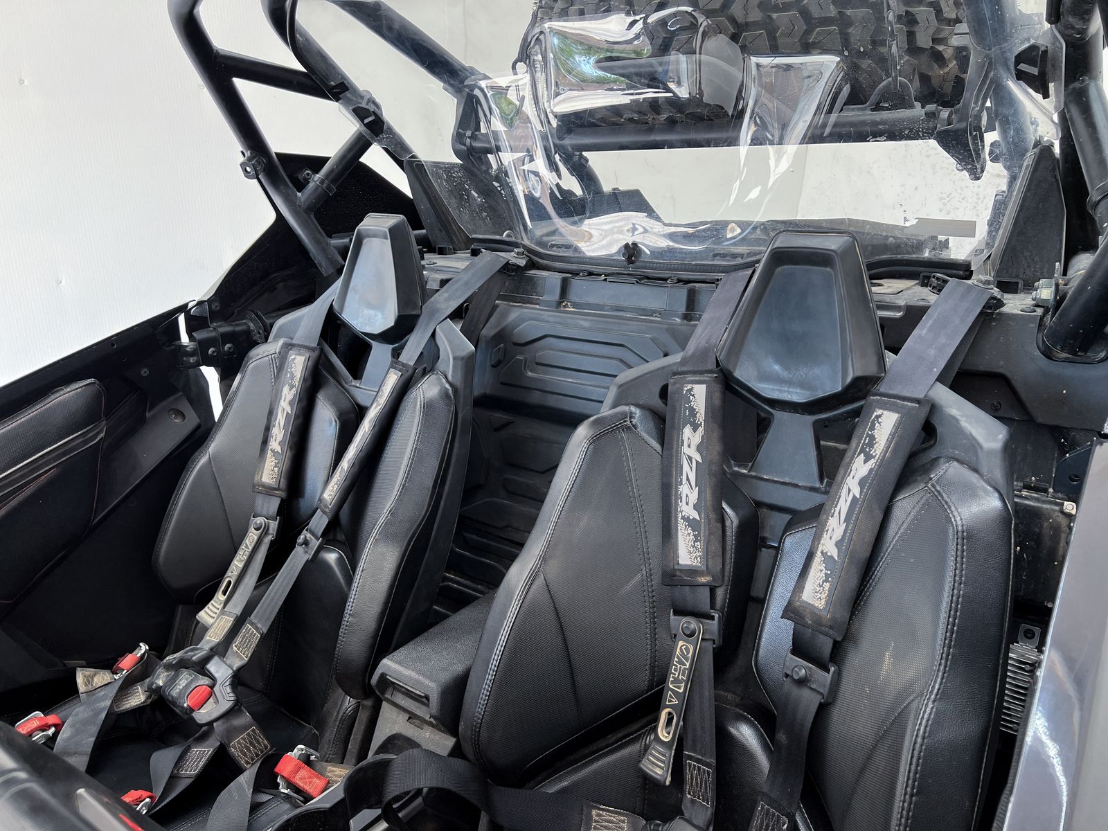 This machine comes equipped with a front bumper with a light bar, winch, street legal kit, front glass windshield, roof with a light bar, 32" tires with System 3 Beadlock rims, extended fender flares, upgraded springs, rock sliders, door bags, rear windshield, spare tire rack with a spare tire, rear bumper with light bar, rear Polaris storage and cooler box.