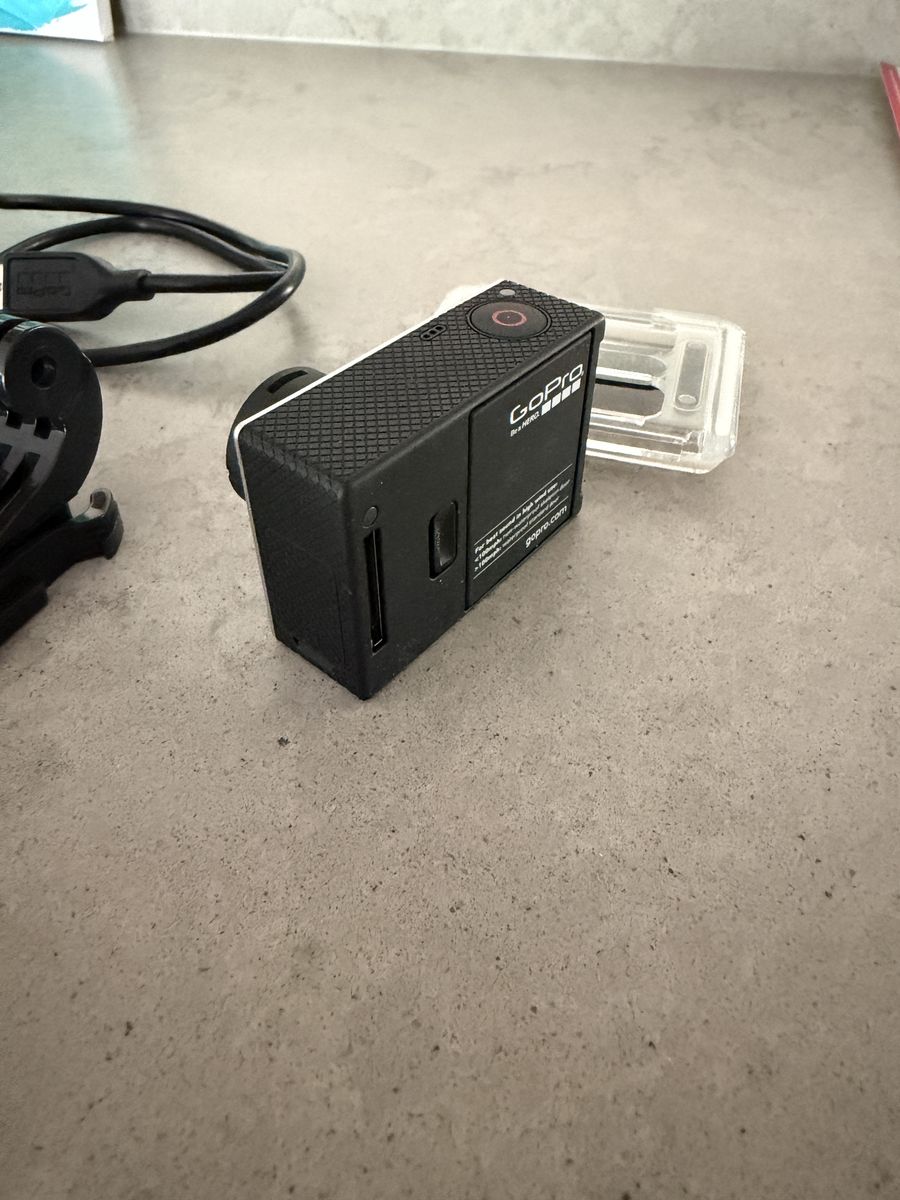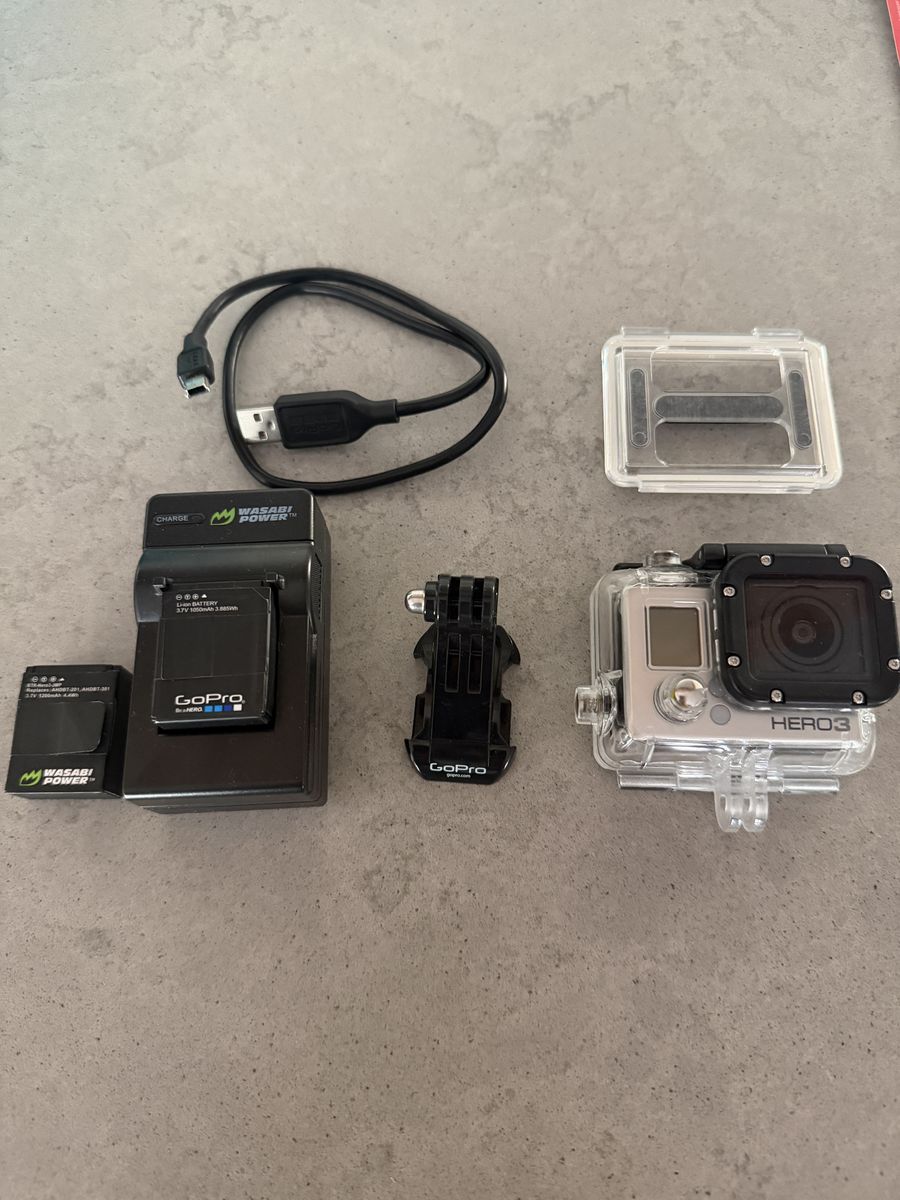 This GoPro camera kit comes with a waterproof case, charger, 3 batteries and charging cord and mounting hardware.