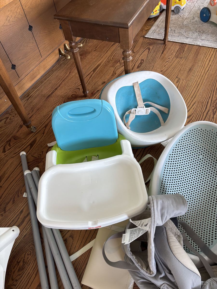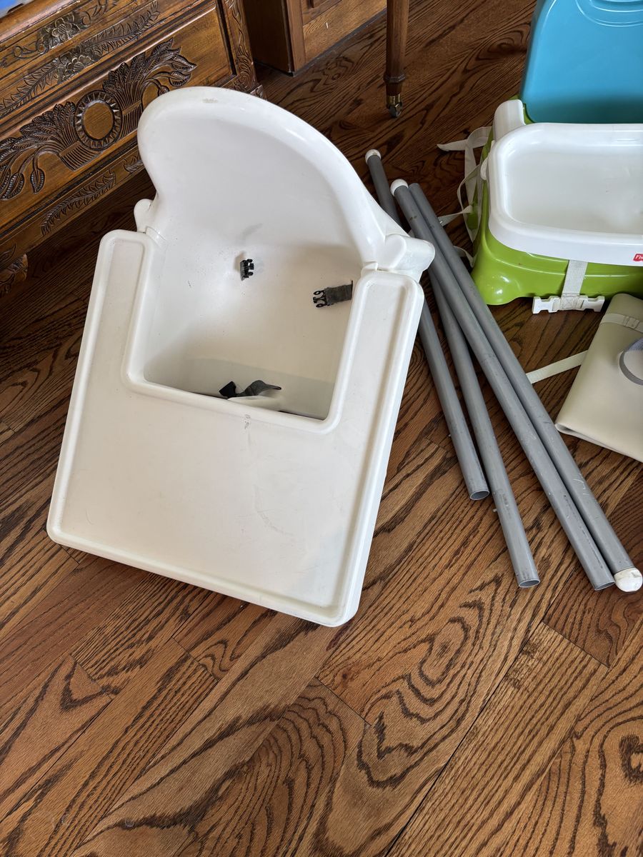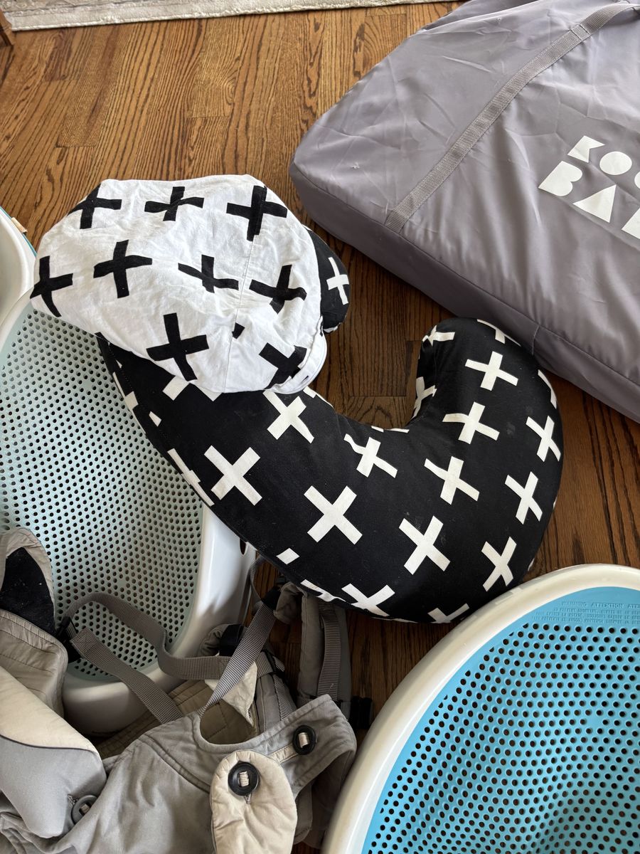IKEA high chair, nursing pillow, two baby baths, two table boosters, and two baby gates.