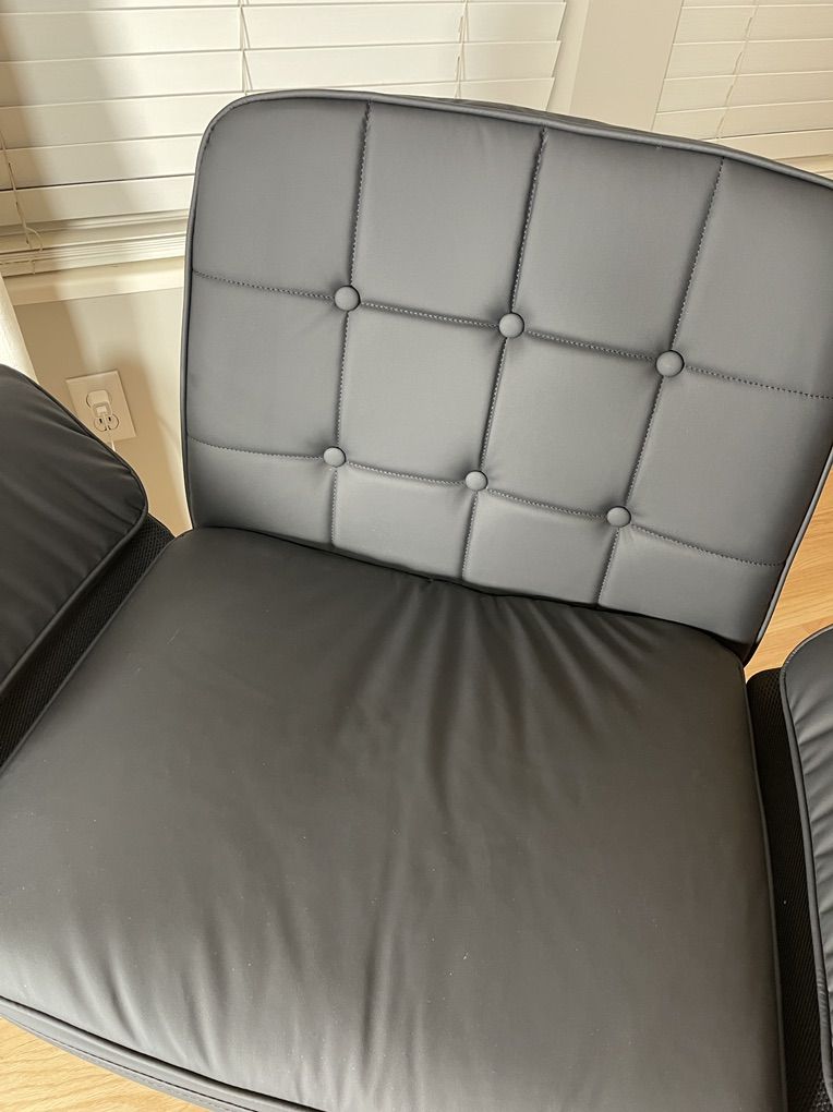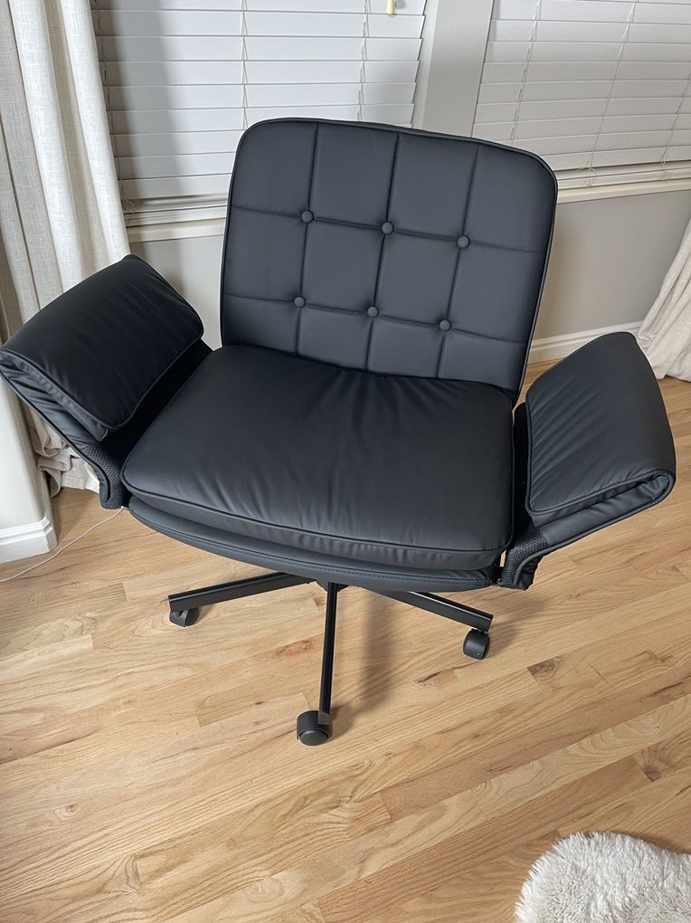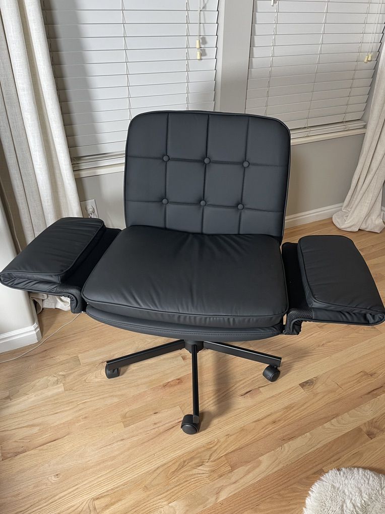 Innovative Ergonomic Armrest System: Engineered for authentic comfort, the armrests of our criss cross chair smoothly adjust from a supportive 90° position to a completely flat 180° lay-down mode, offering tailored support whether you're typing, reading, or sitting cross-legged. The gentle 30° recline allows a soothing rocking motion—optimal for quiet moments of reflection or easing into a relaxed posture after long work sessions Extended Seat for Dynamic Living: Crafted with a layered cushion of soft top sponge over supportive base padding, this criss cross office chair's seat maintains its shape and comfort through long hours of use. The widened design welcomes a range of sitting postures, whether you're immersed in work, enjoying a book, or simply taking a mindful break, ensuring you feel at ease in any scenario. The rotated outward armrests of our vanity chair can create a flat, cozy platform for pets Elegant and Resilient Upholstery: Upholstered in premium, easy-care leather that balances softness with lasting durability. Beneath this desk chair's refined exterior, a robust seat base paired with a widened foundation ensures unwavering stability and reliable support. Its textured surface resists daily wear while complementing both contemporary and cozy decor styles, making it a seamless addition to your creative studio, lounge area, or morning coffee space A Chair for Every Chapter: Designed to evolve with your daily rhythm, this office chair transitions effortlessly through each moment. The 3.94-inch smooth height adjustment bridges relaxed floor seating and focused desk work, while its gentle 30° recline gracefully shifts between productivity and relaxation. Silently rolling across any floor on 360° swivel casters, it adapts to your rhythm in a home office, living room, reading nook, or meditation corner Thoughtful Assembly and Aesthetic Design: Clear instructions and thoughtfully organized parts make setup quick and intuitive, so you can begin enjoying the cross legged chair's comfort and style without delay. The comfy desk chair's clean lines and considered details—from the tailored stitching to the muted color palette—reflect a design that supports both active engagement and tranquil repose, seamlessly fitting into your daily life