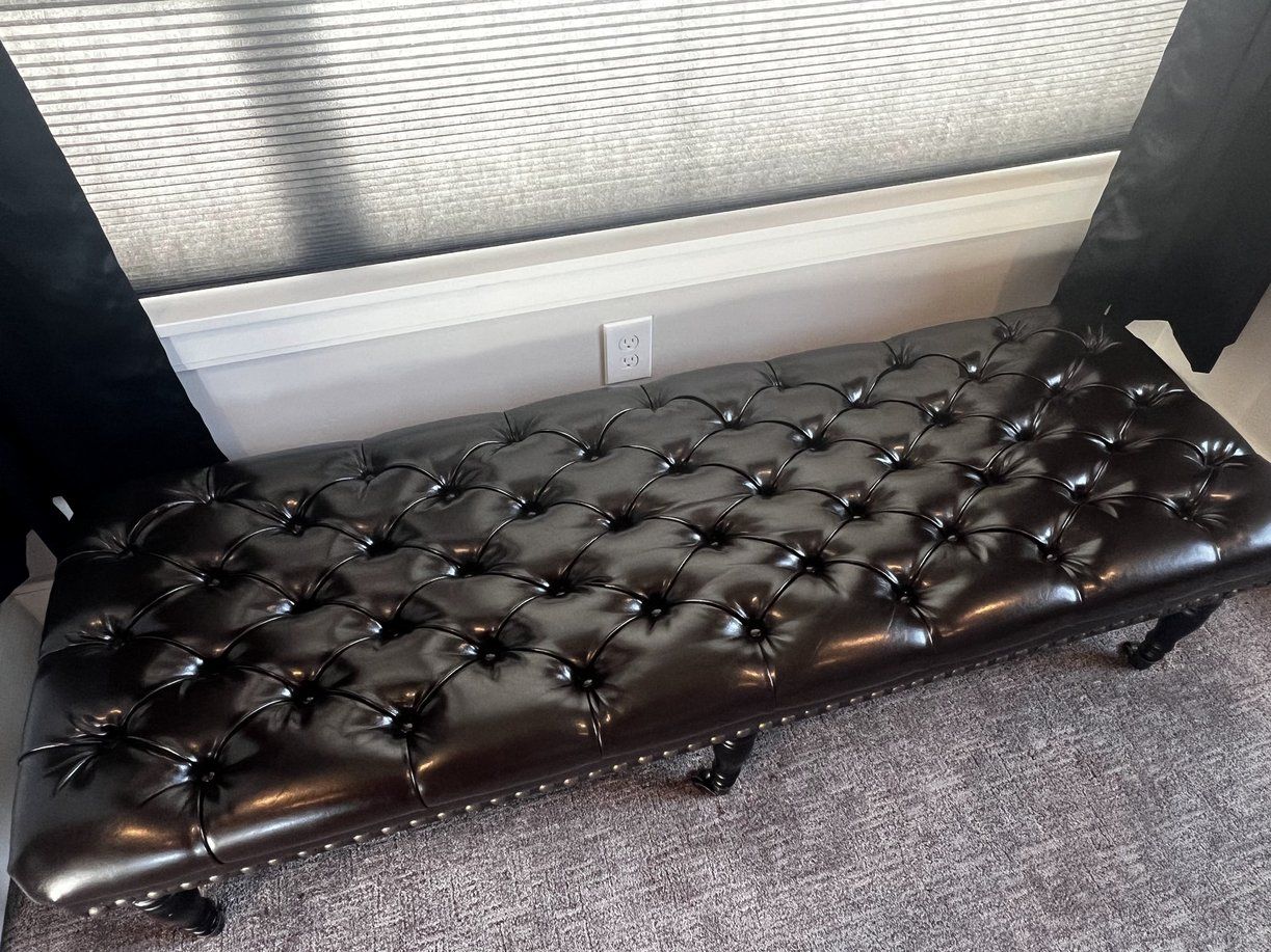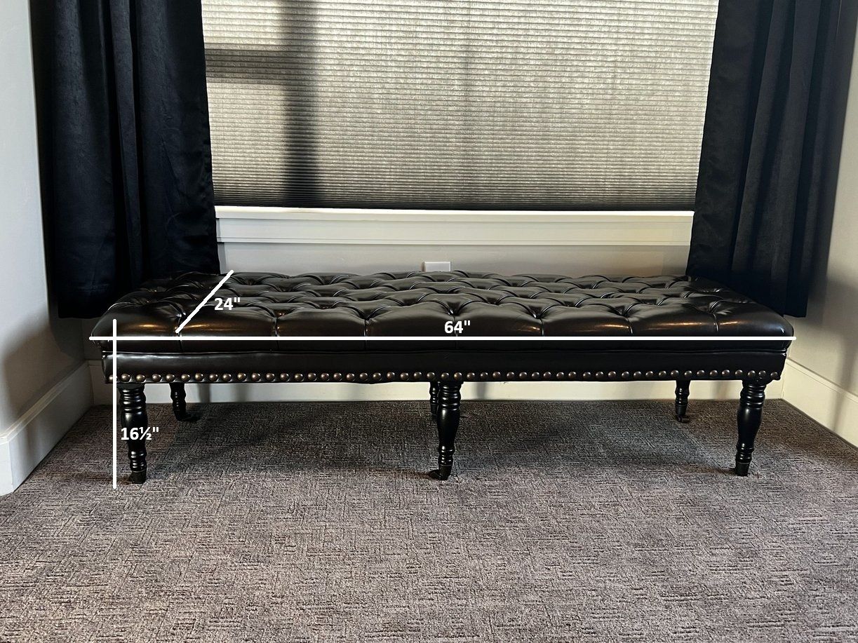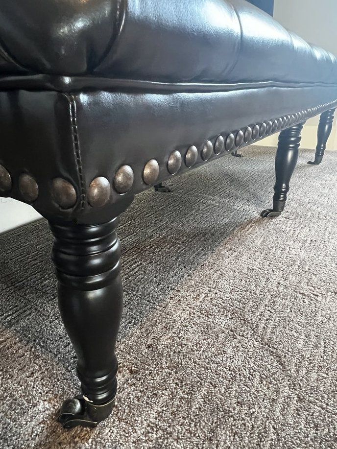 This is a plulsh leather upholstered bench with a button-tufted seat in an espresso. Turned wooden legs match the color of the bench and rest on smooth-rolling casters.