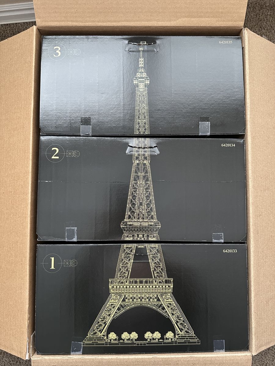 VenmoThis Lego Eiffel Tower set was built once, displayed, then disassembled using the instructions to ensure all parts were present. Set is 100% complete and bagged in ziplock bags according to the numbered bags in the instructions. The second instruction book was ripped in half but all pages are present and otherwise in great condition. See pictures. Comes with extra pieces, all instructions books, and all boxes.