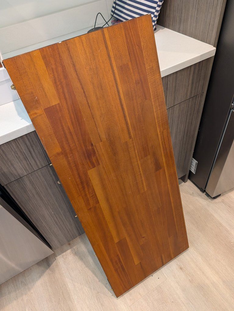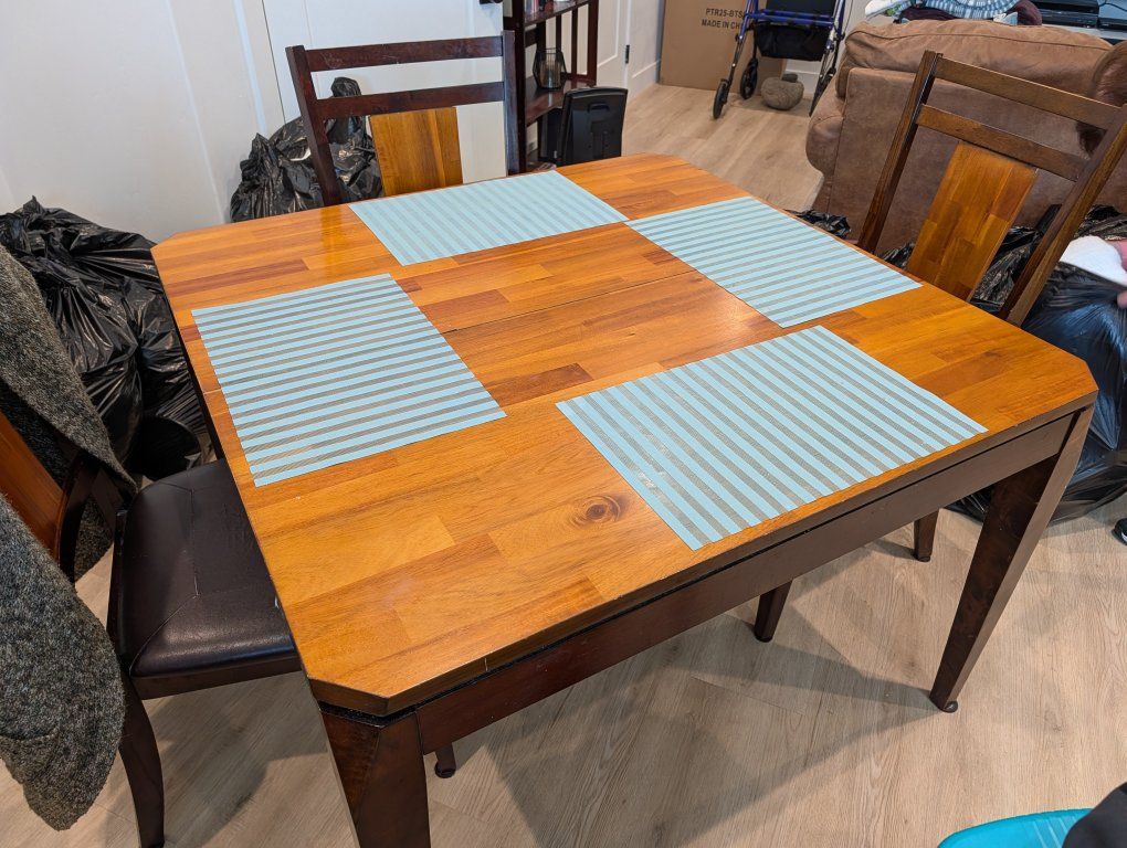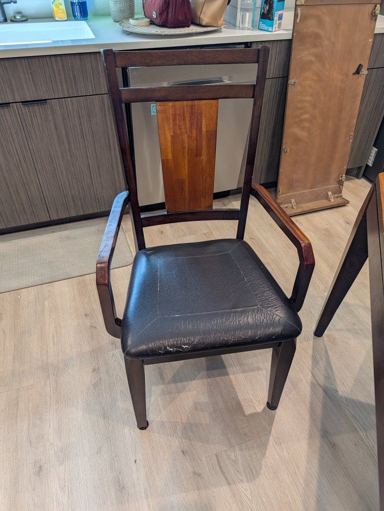 Kitchen table and 6 chairs (2 with arms, 4 without) 44" x 44" square without leaf, 44" x 52" with the 18" leaf inserted Acacia wood