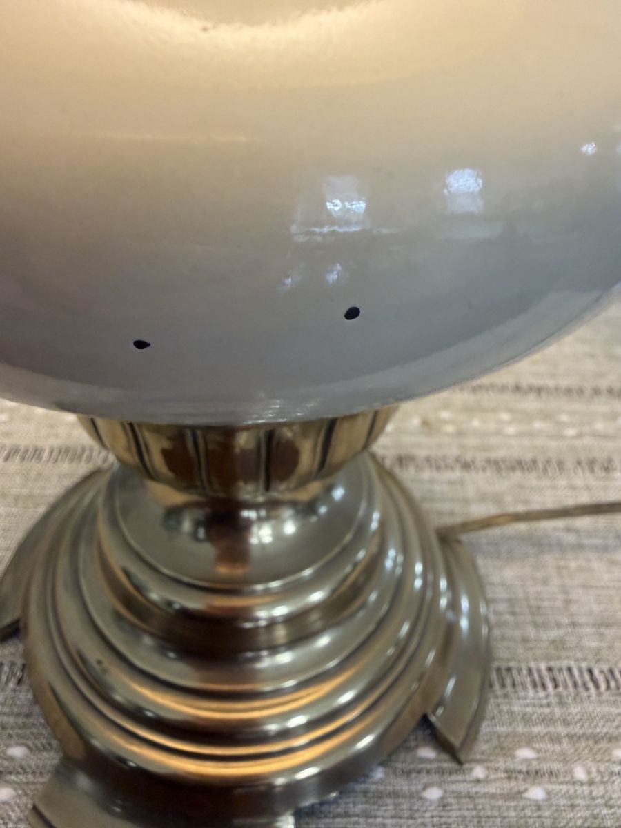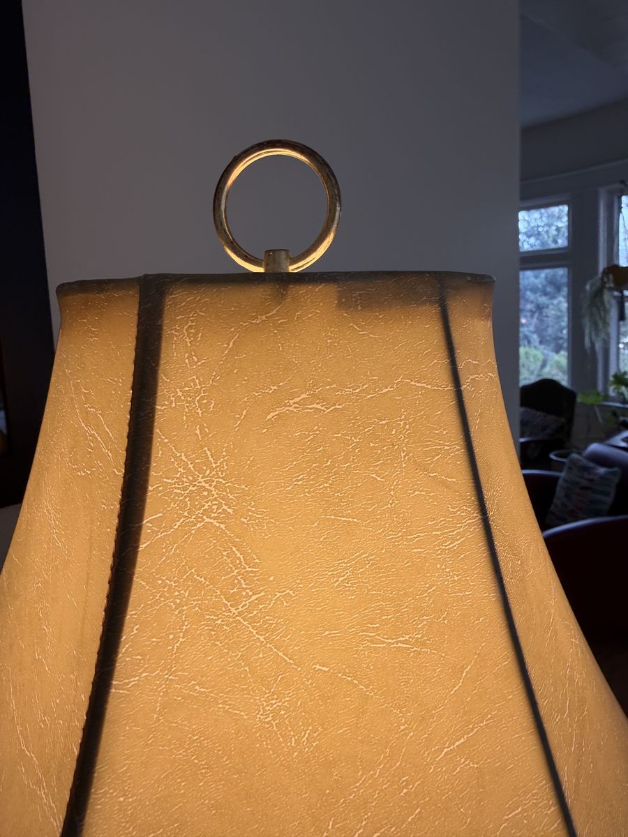 VenmoThis is a vintage brass and ceramic Mid Century lamp likely designed by Stiffel Company. It has a nice textured shade. Measure 28” H The porcelain has some little nicks on it. Nothing big but they are there. Look at pics