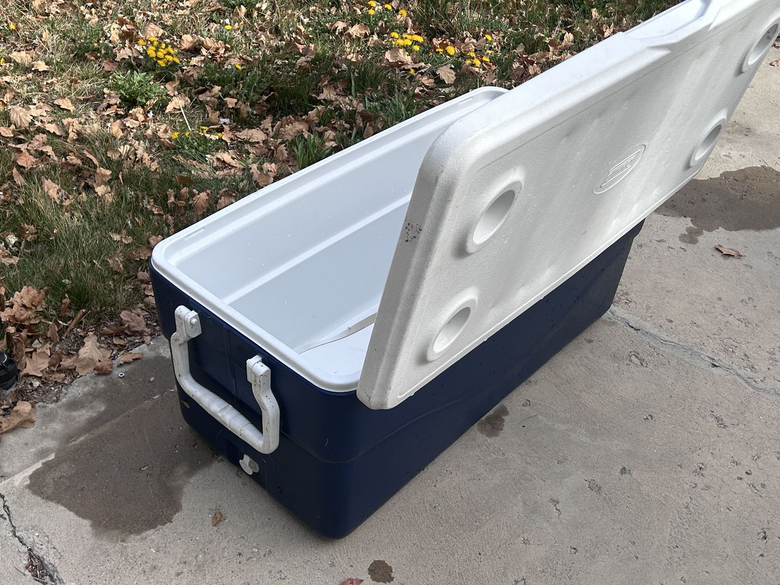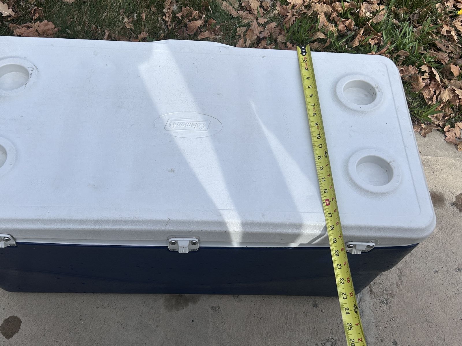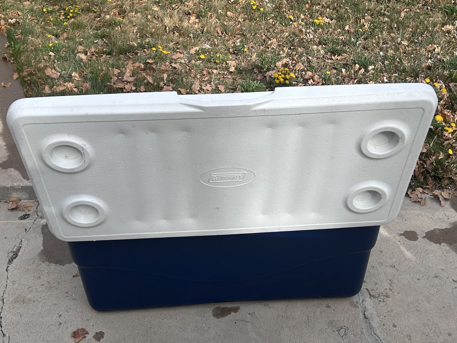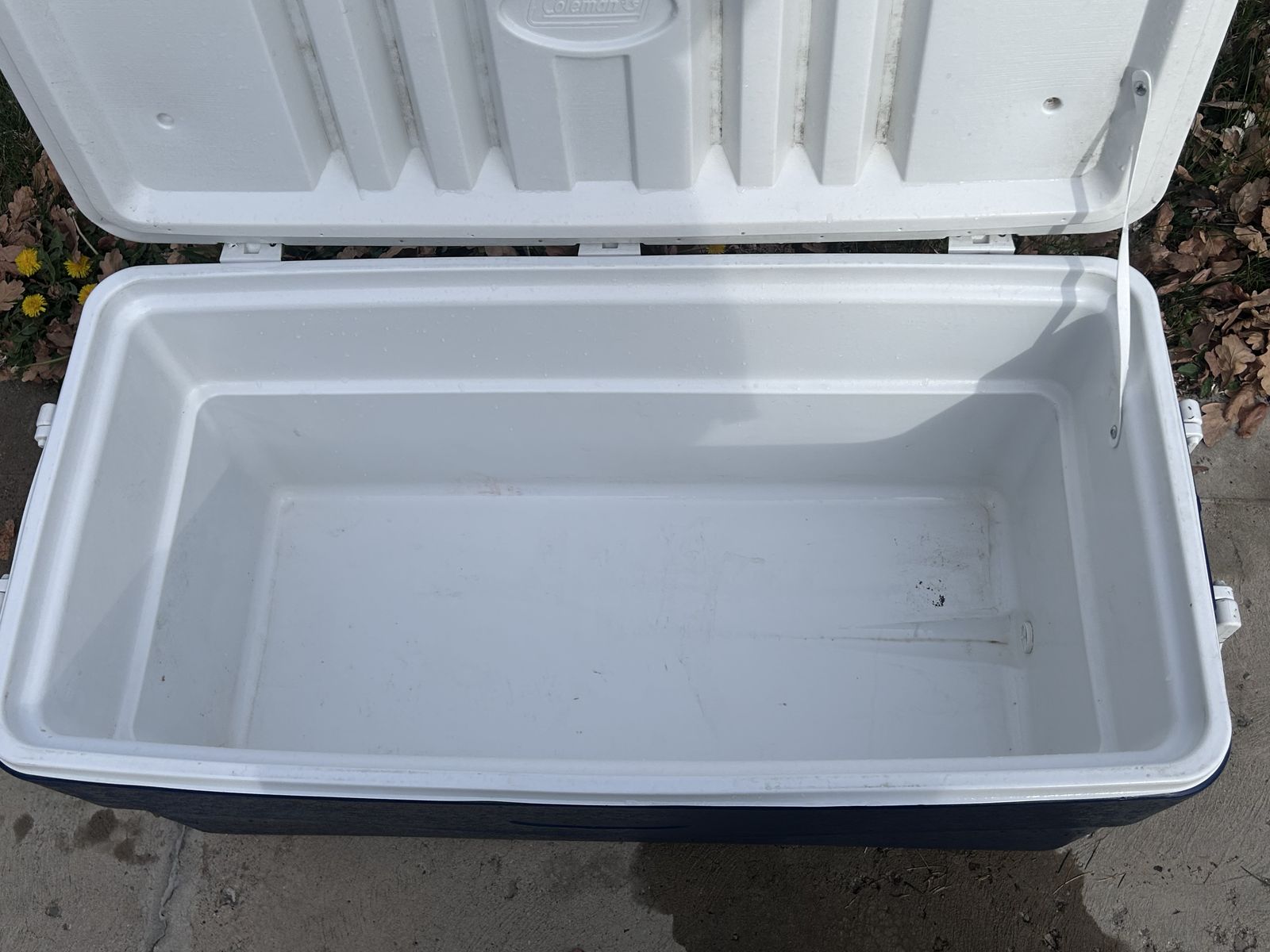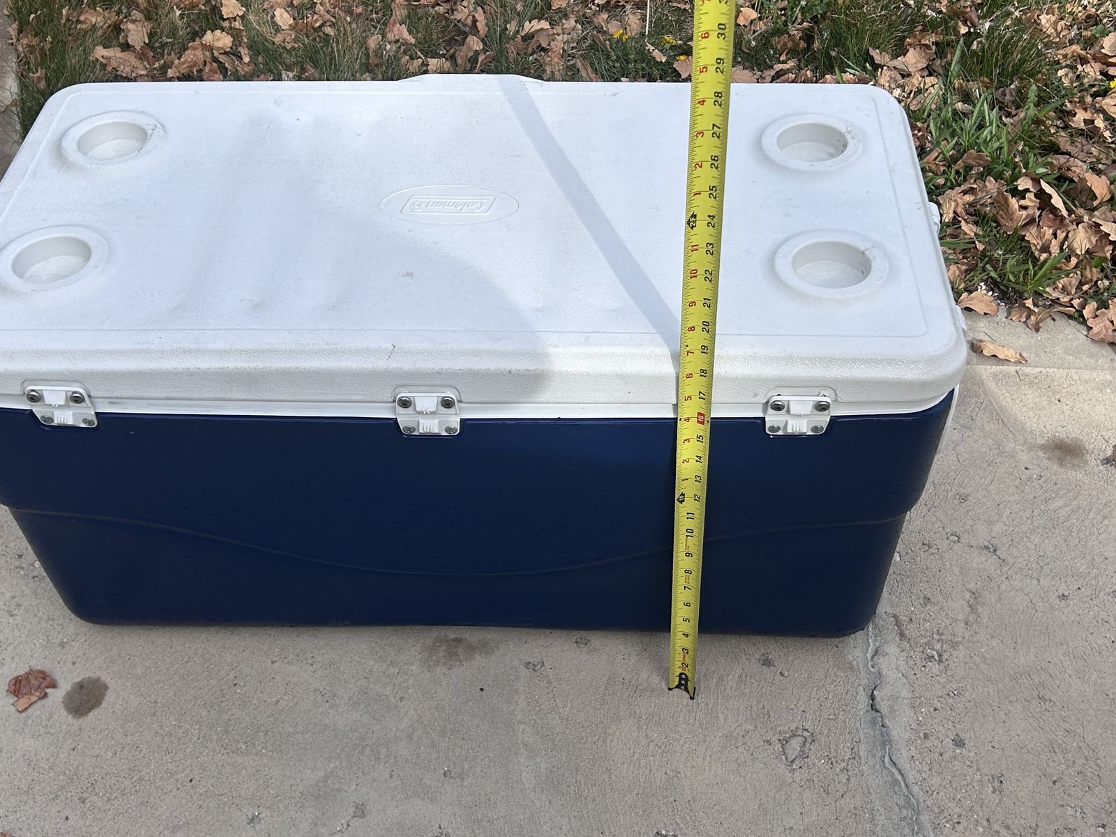 Large Coleman cooler with handles and drain feature. Reinforced hinges. Works great. Call or text Dylan 801-897-4263