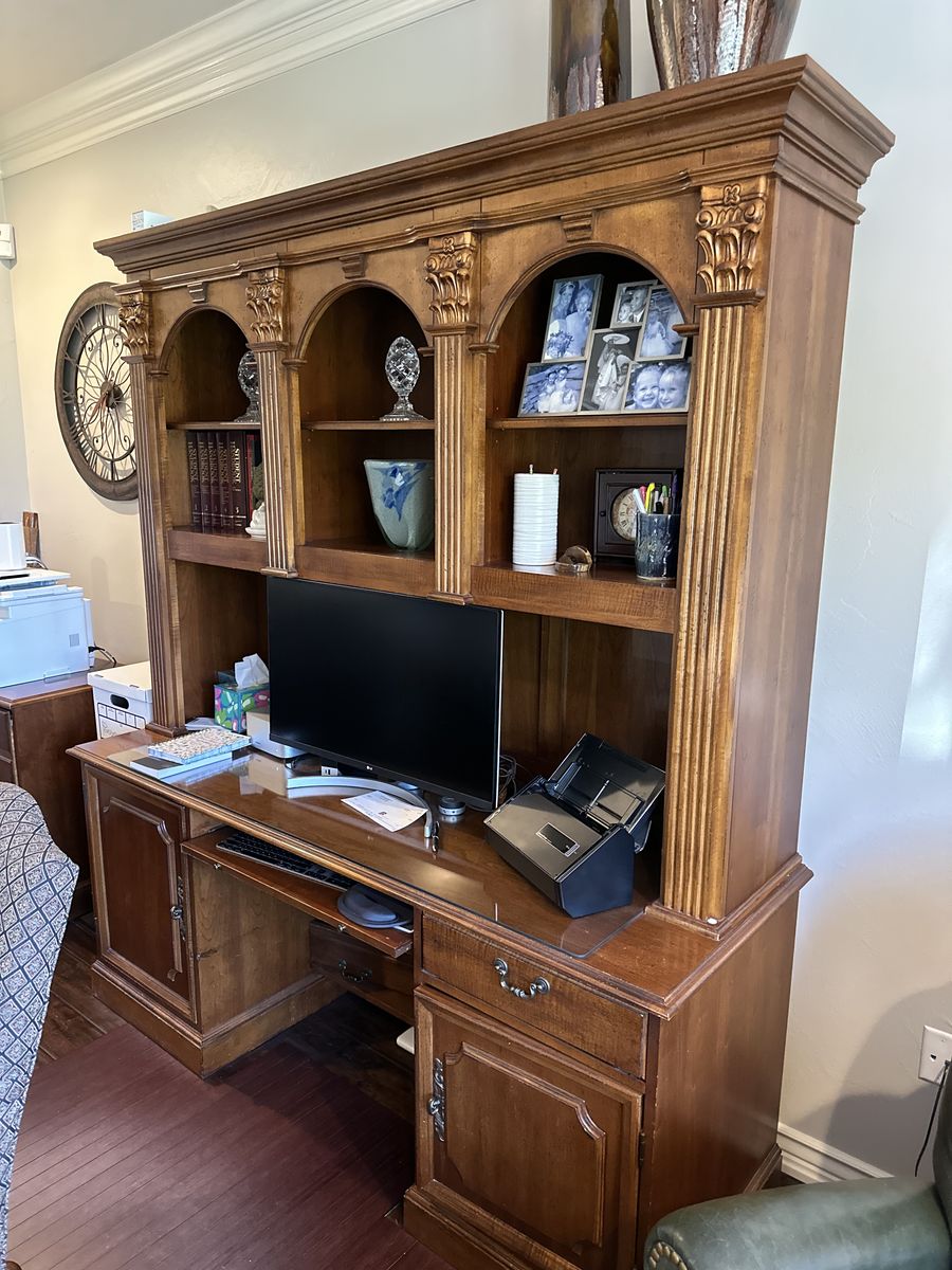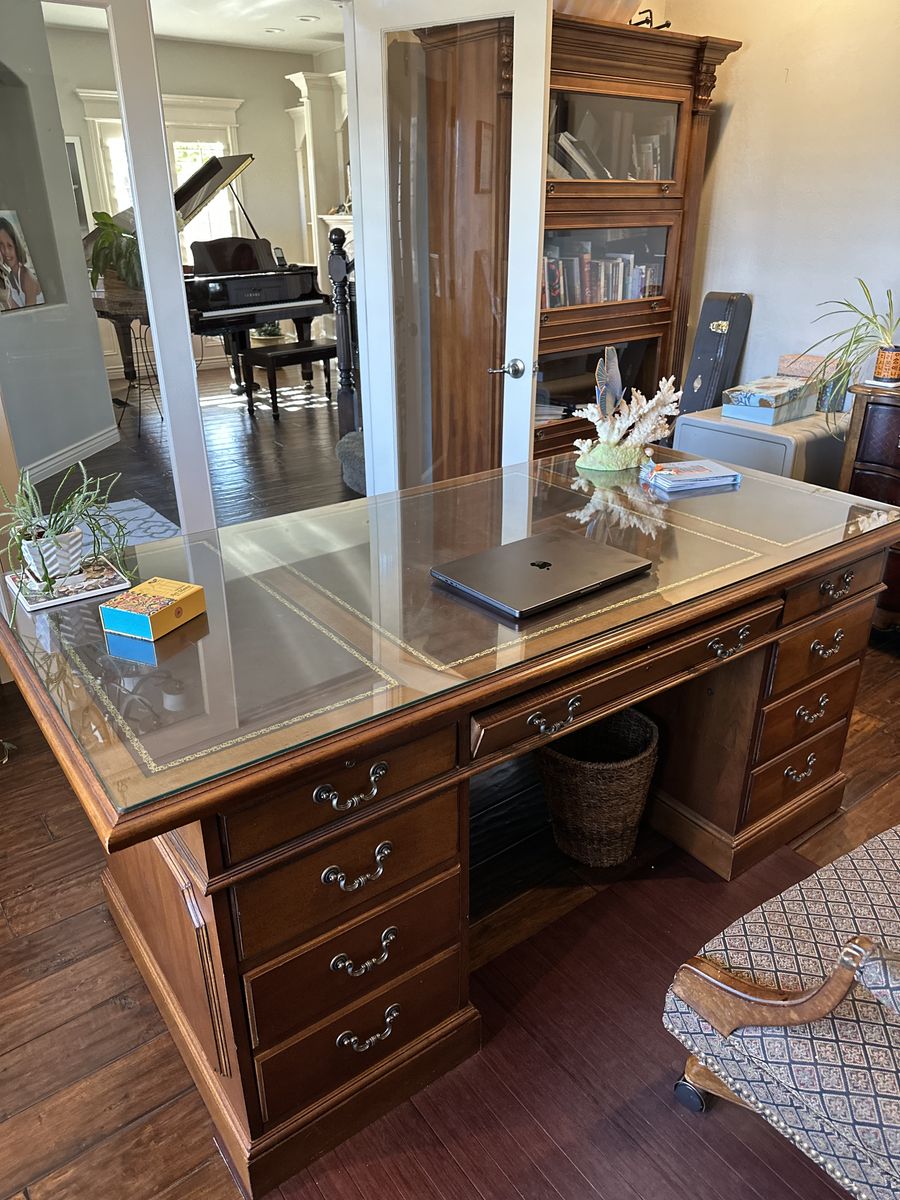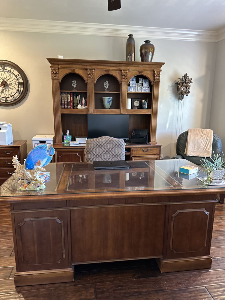 ZelleMAKE OFFER: Good condition, 2 desks with glass tops, 2 book shelves, 2 file cabinets, 1 3-drawer chest. Moving.