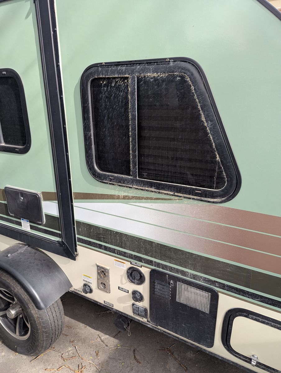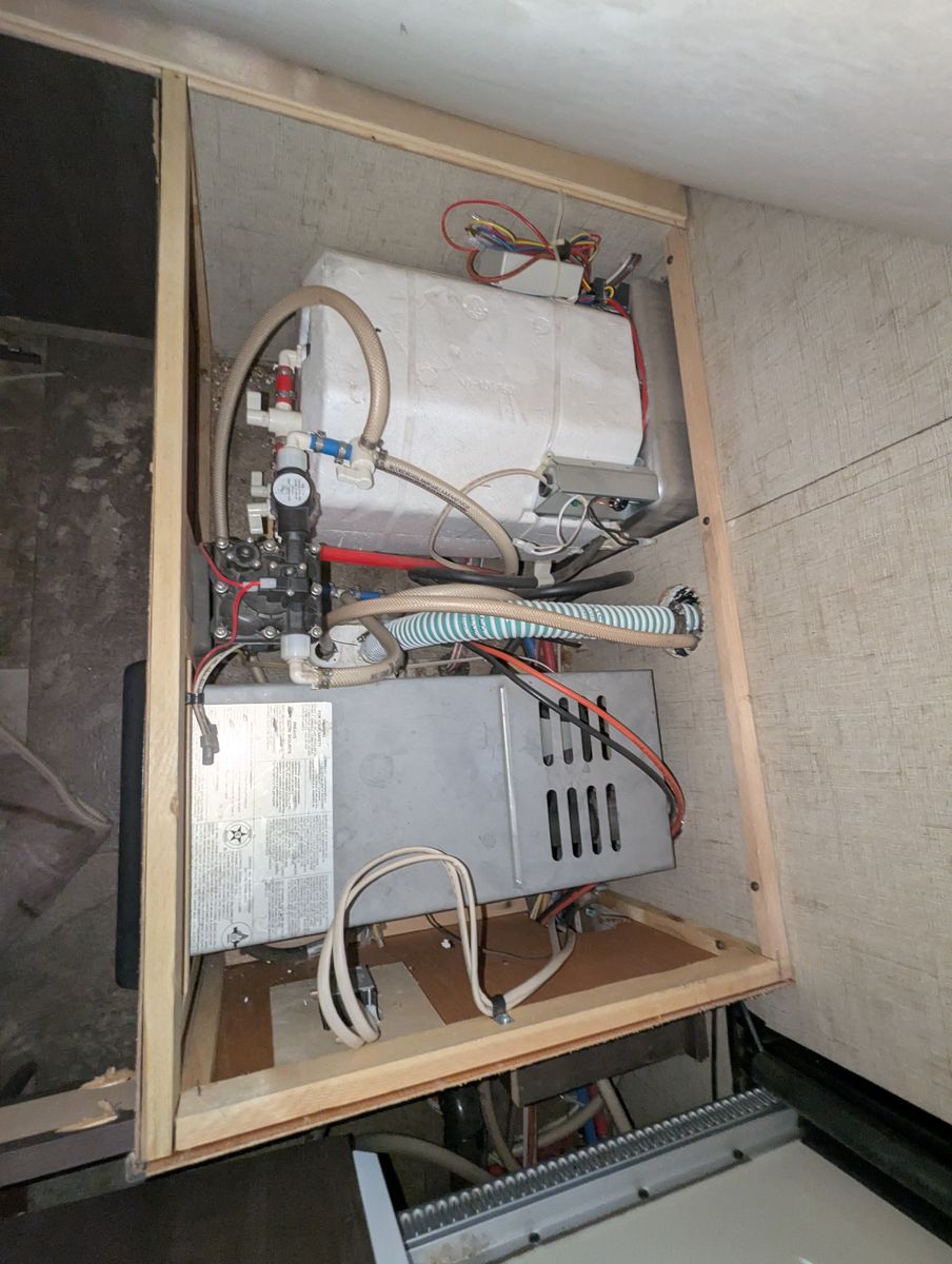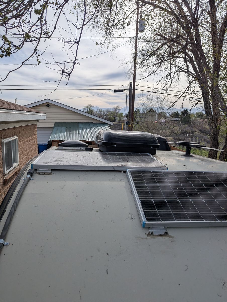 Two solar panels, dual AGM batteries. Propane stove, water heater, and refrigerator.