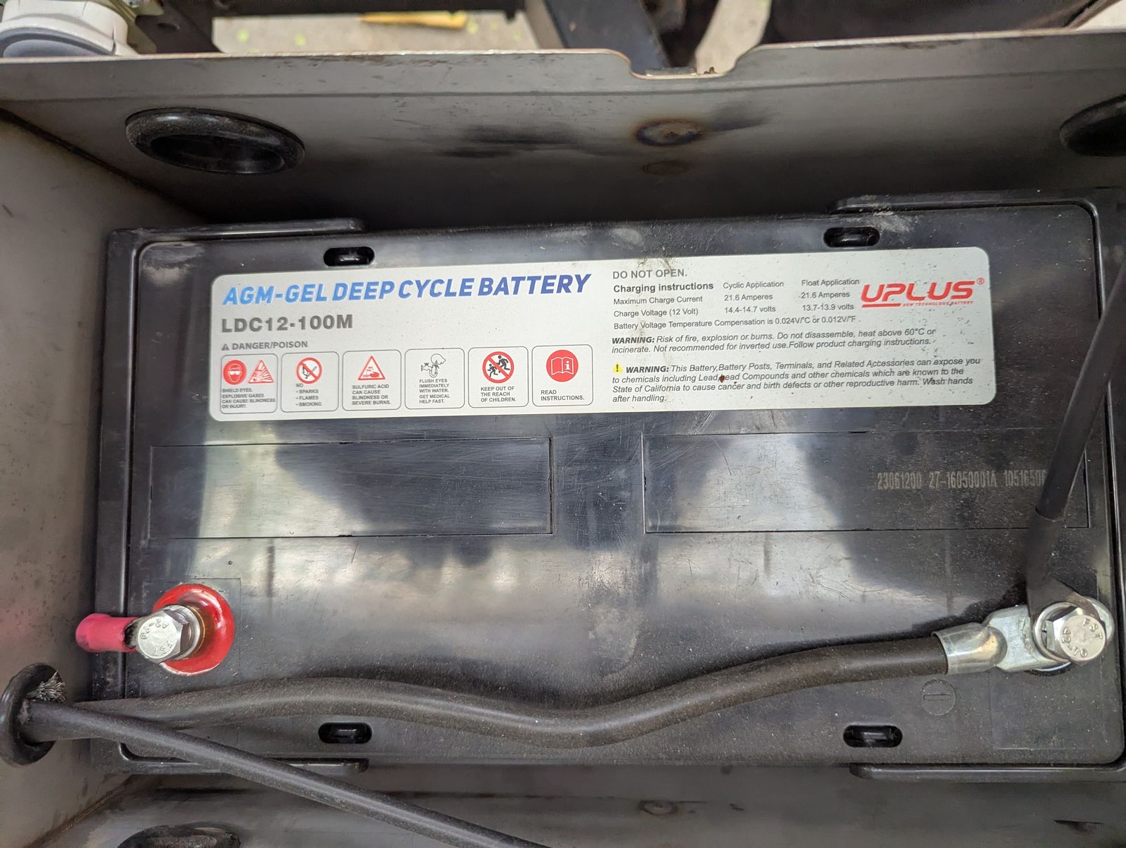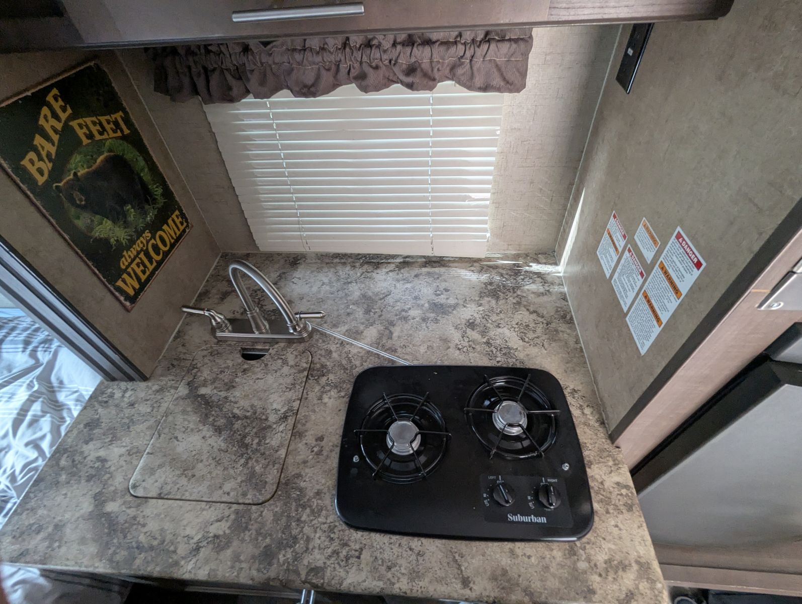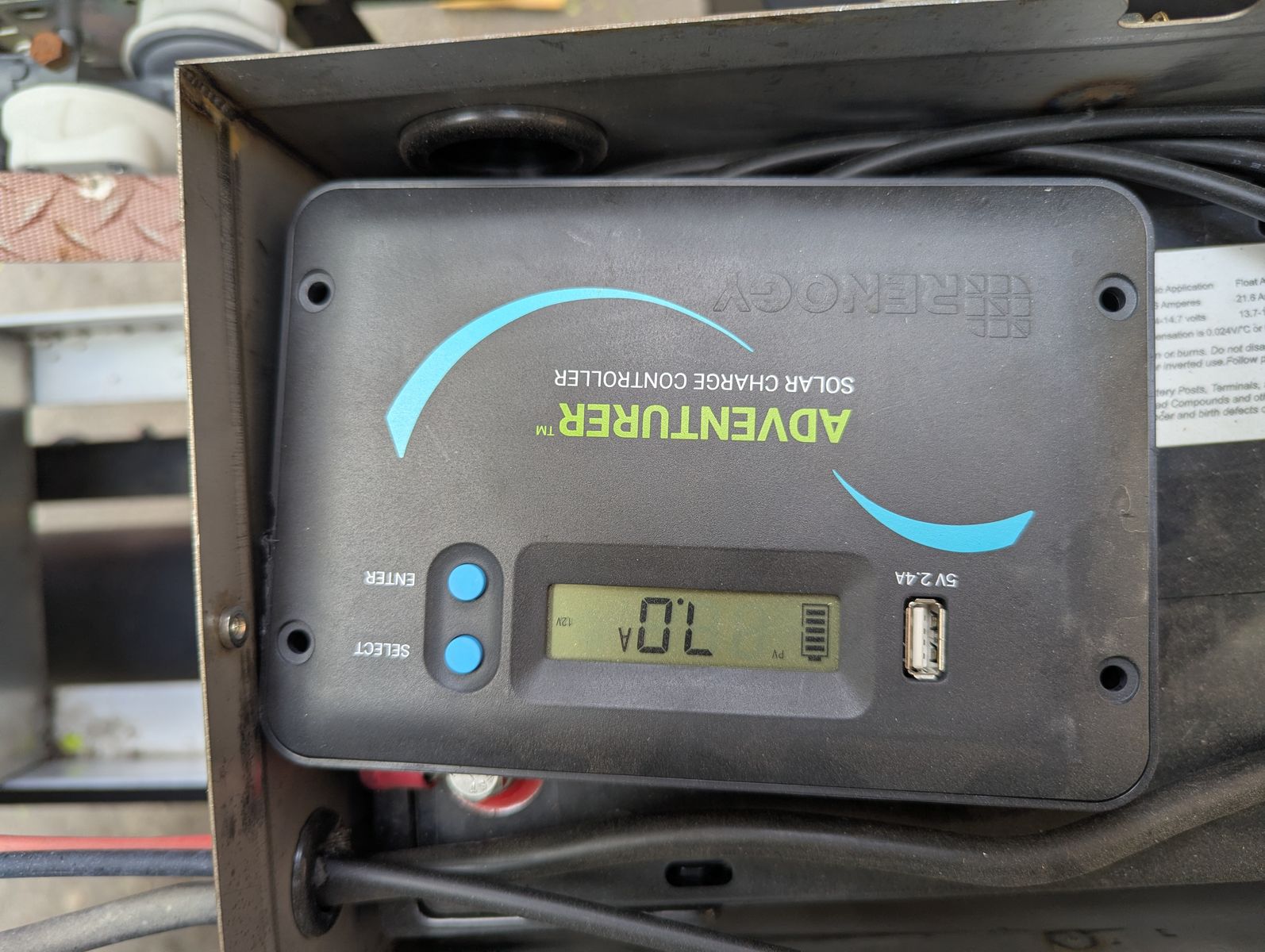 Two solar panels, dual AGM batteries. Propane stove, water heater, and refrigerator.