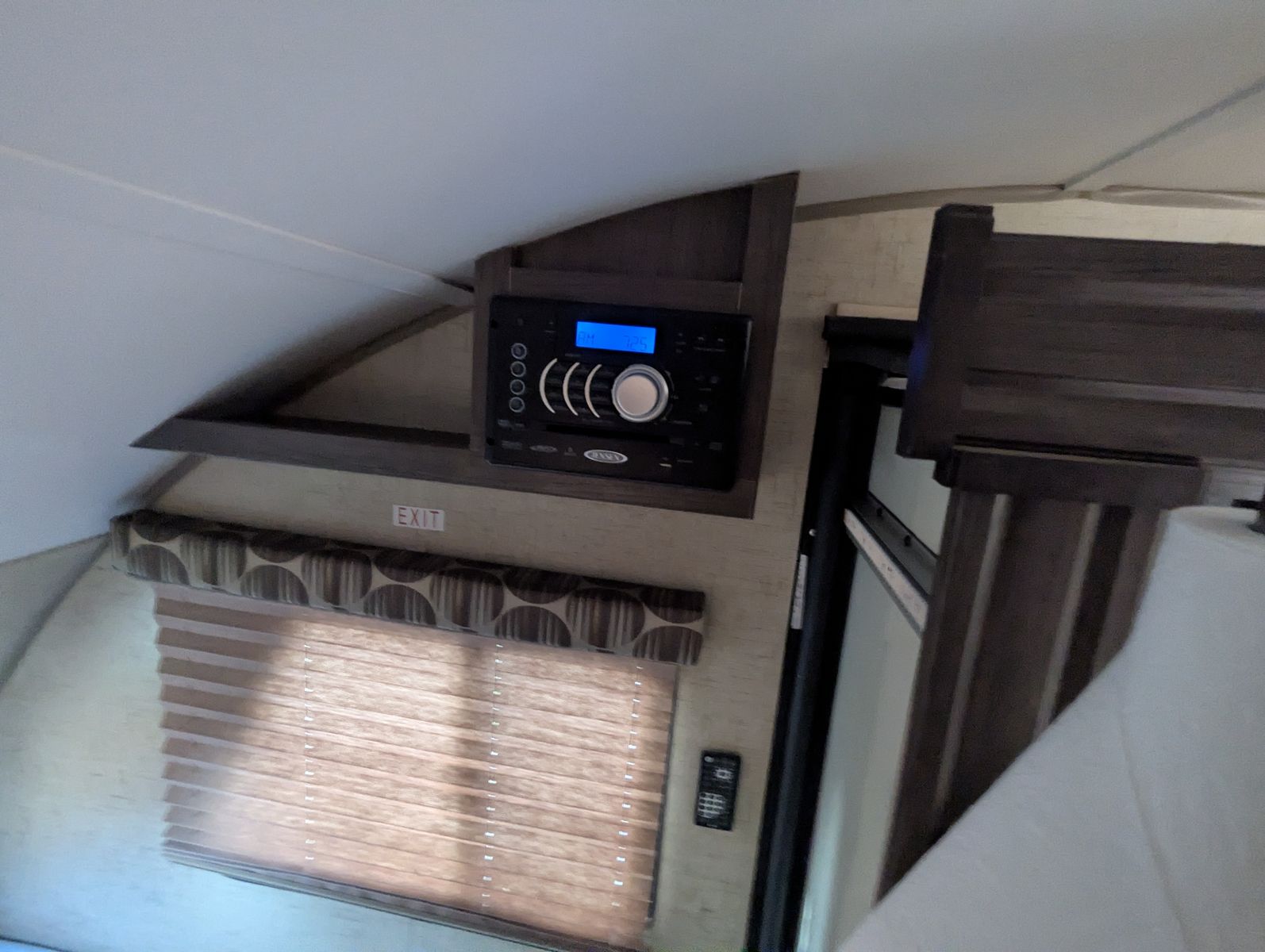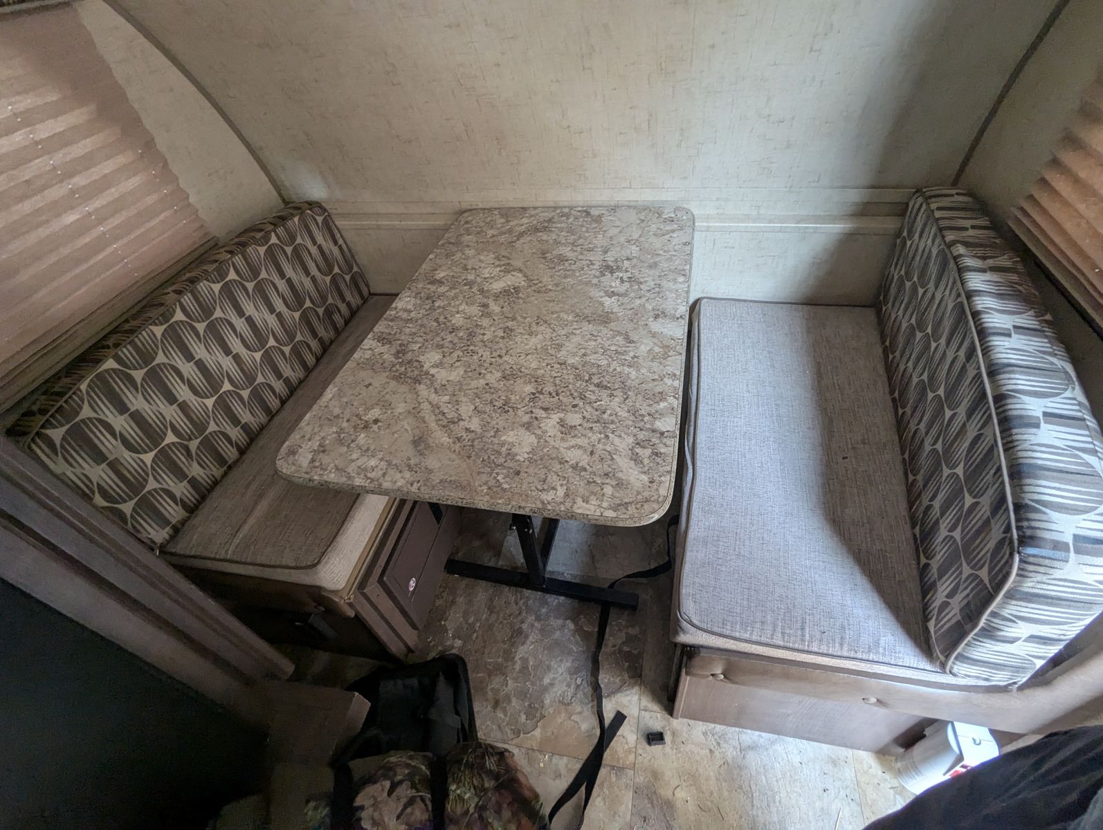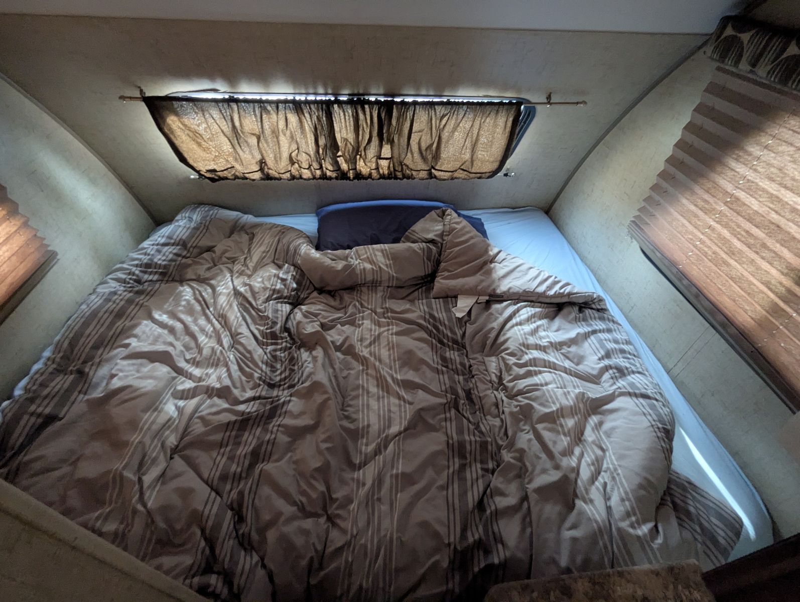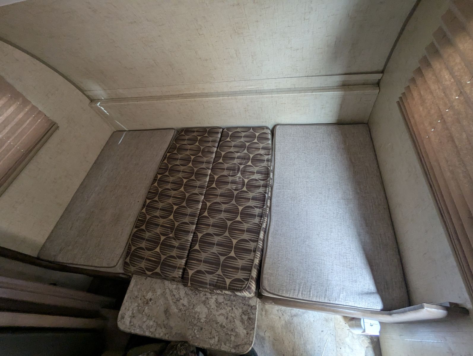 Short queen with memoy foam matress, table folds down into 2nd bed.