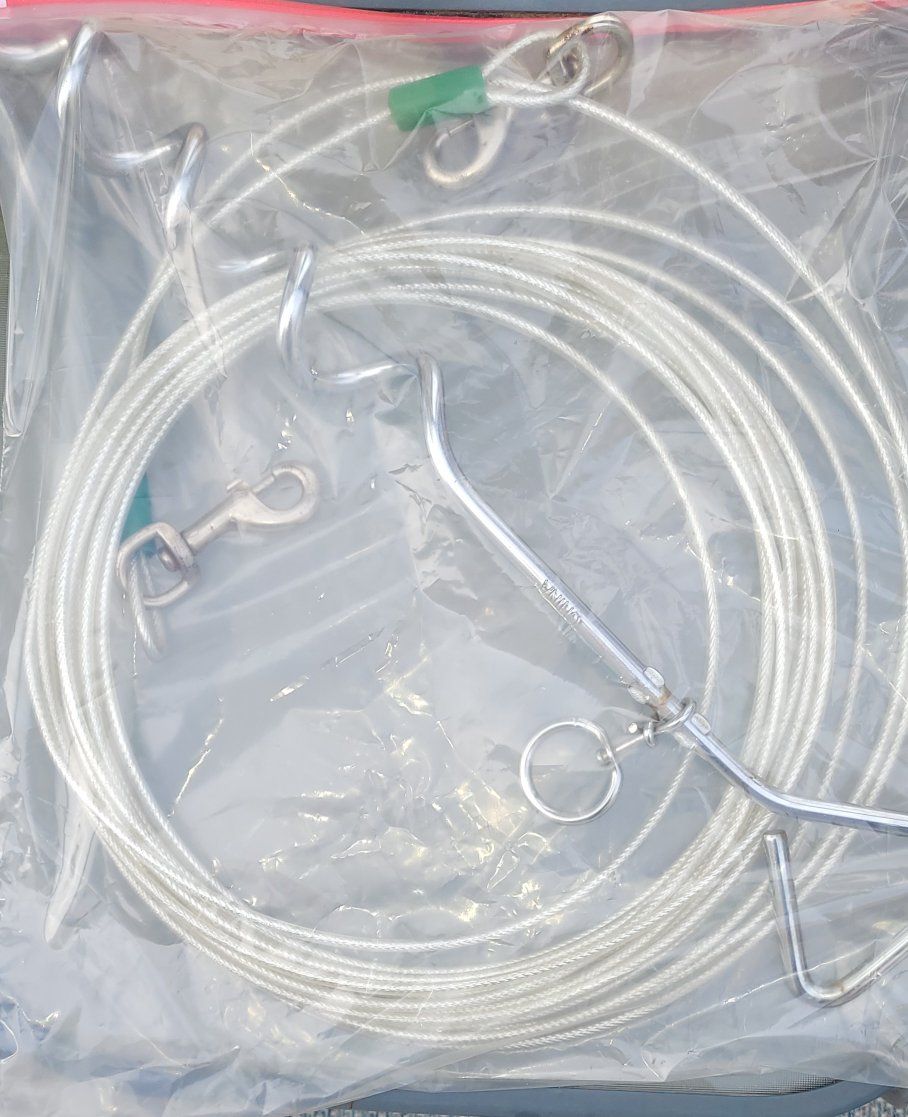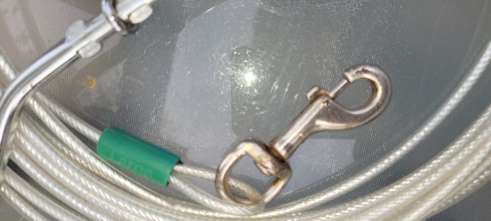 Top Paw Reflective Dog Tie Out 40ft Top Paw Spiral Dog Stake For large dog Maybe put on my dog twice, just sat out in the winter, so the clips are a little rusty but works fine.