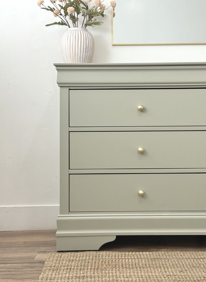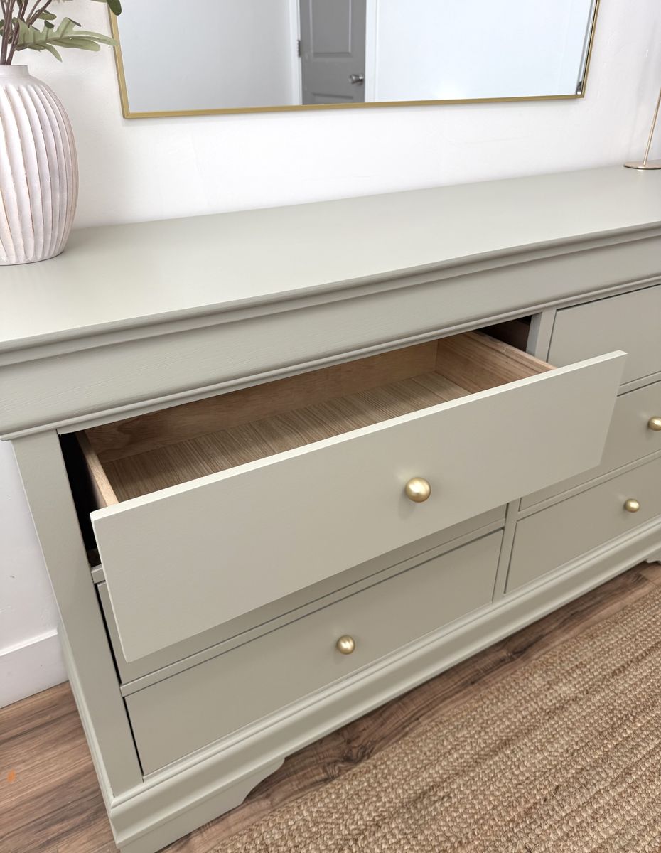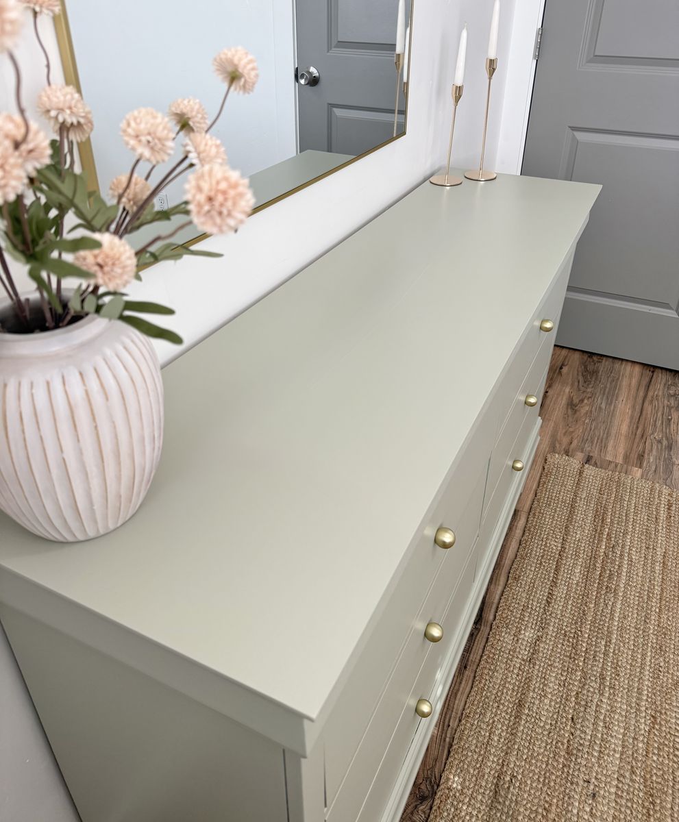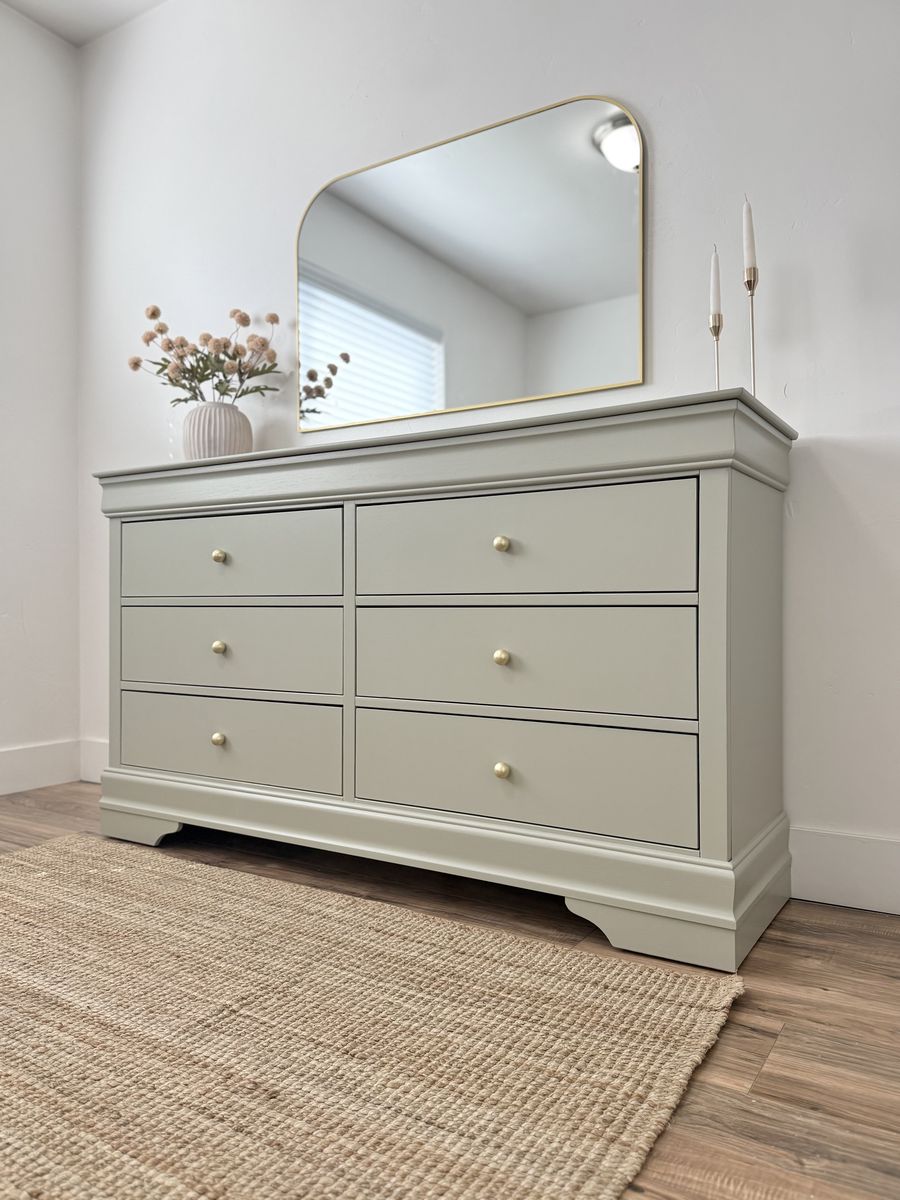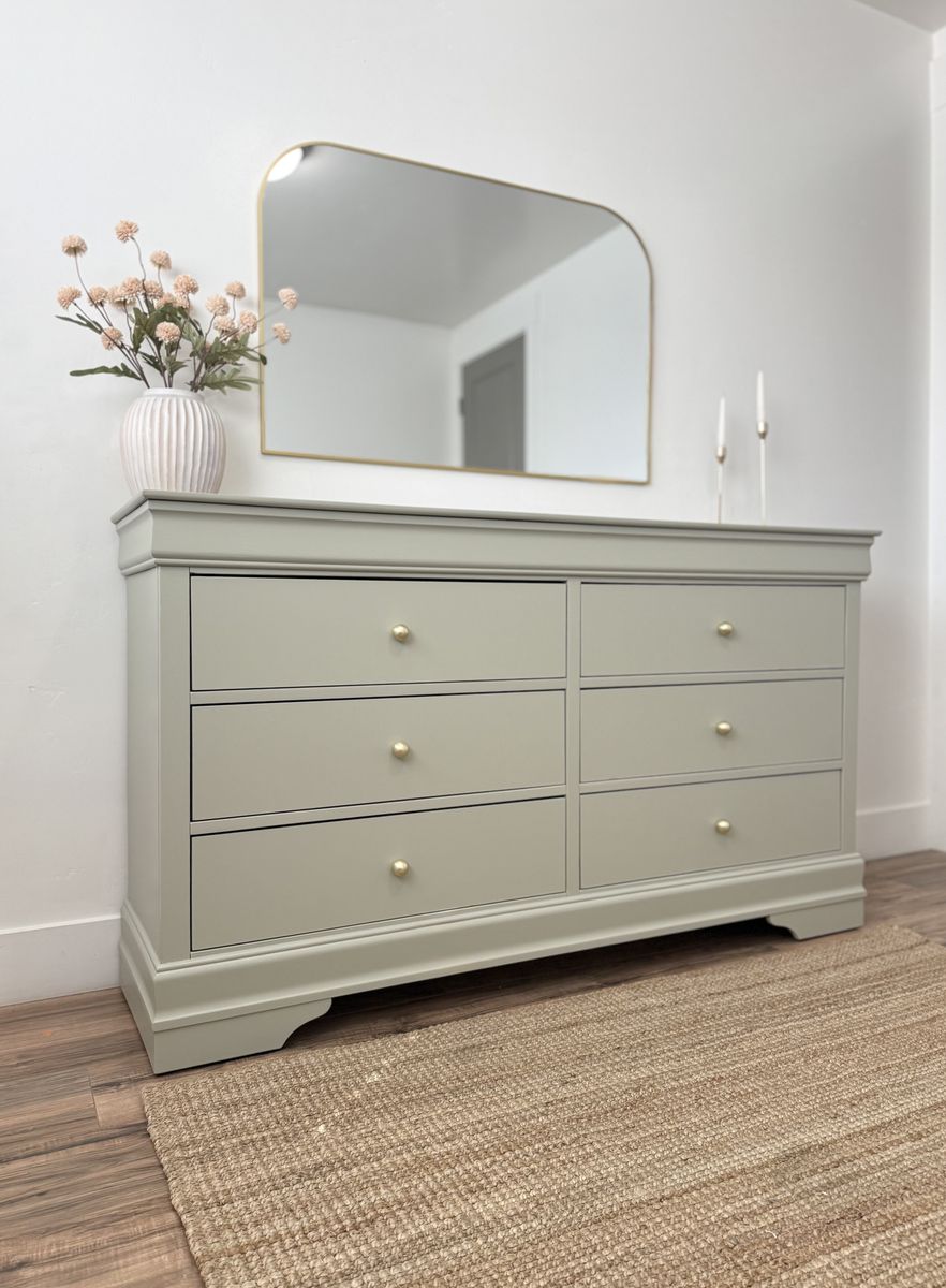 VenmoPrice firm. Beautiful six drawer dresser in a soft green tone. Light and airy! Paired golden matte round knobs and light interior. Drawers slide smoothly. Not solid wood. Delivery available for a fee.