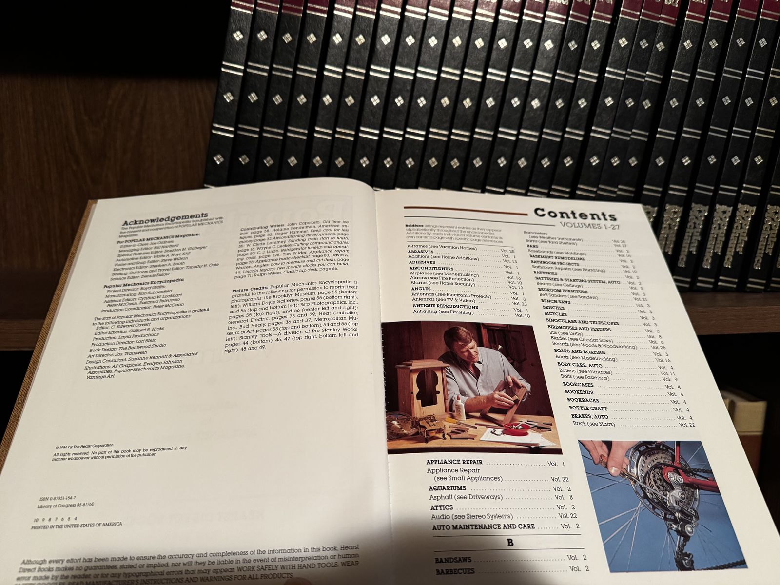 VenmoThe entire set (volumes 1-27) of Popular Mechanics Encyclopedia. Amazing resource for DIY around the house, woodworking etc. Plans for countless building projects. The books and bindings are in nearly new condition despite being a few decades old. Some of the articles are fun nod to history but the vast majority are very relevant now.