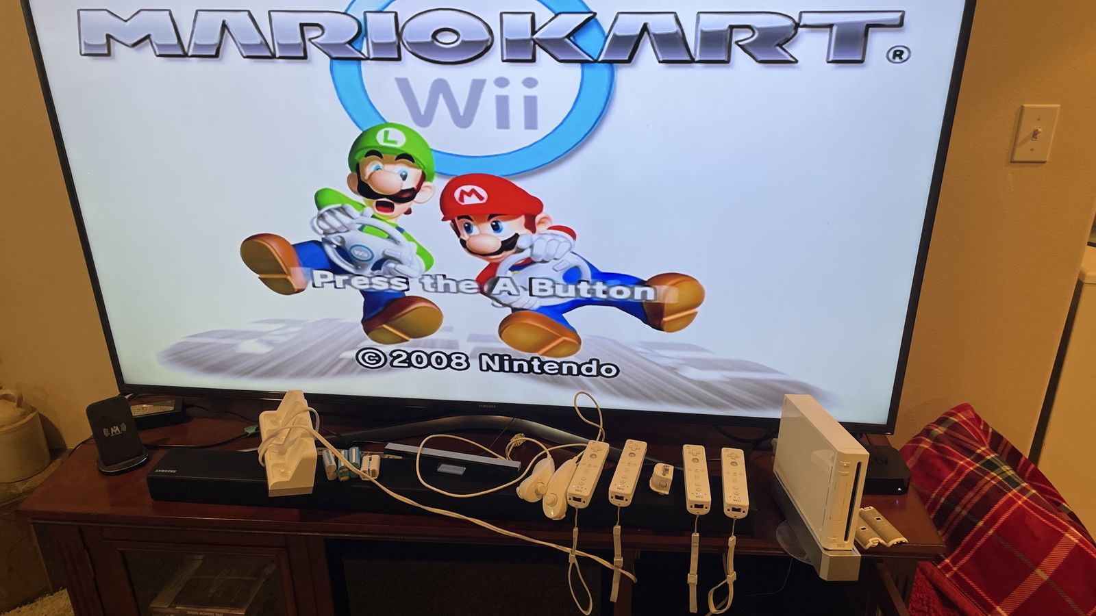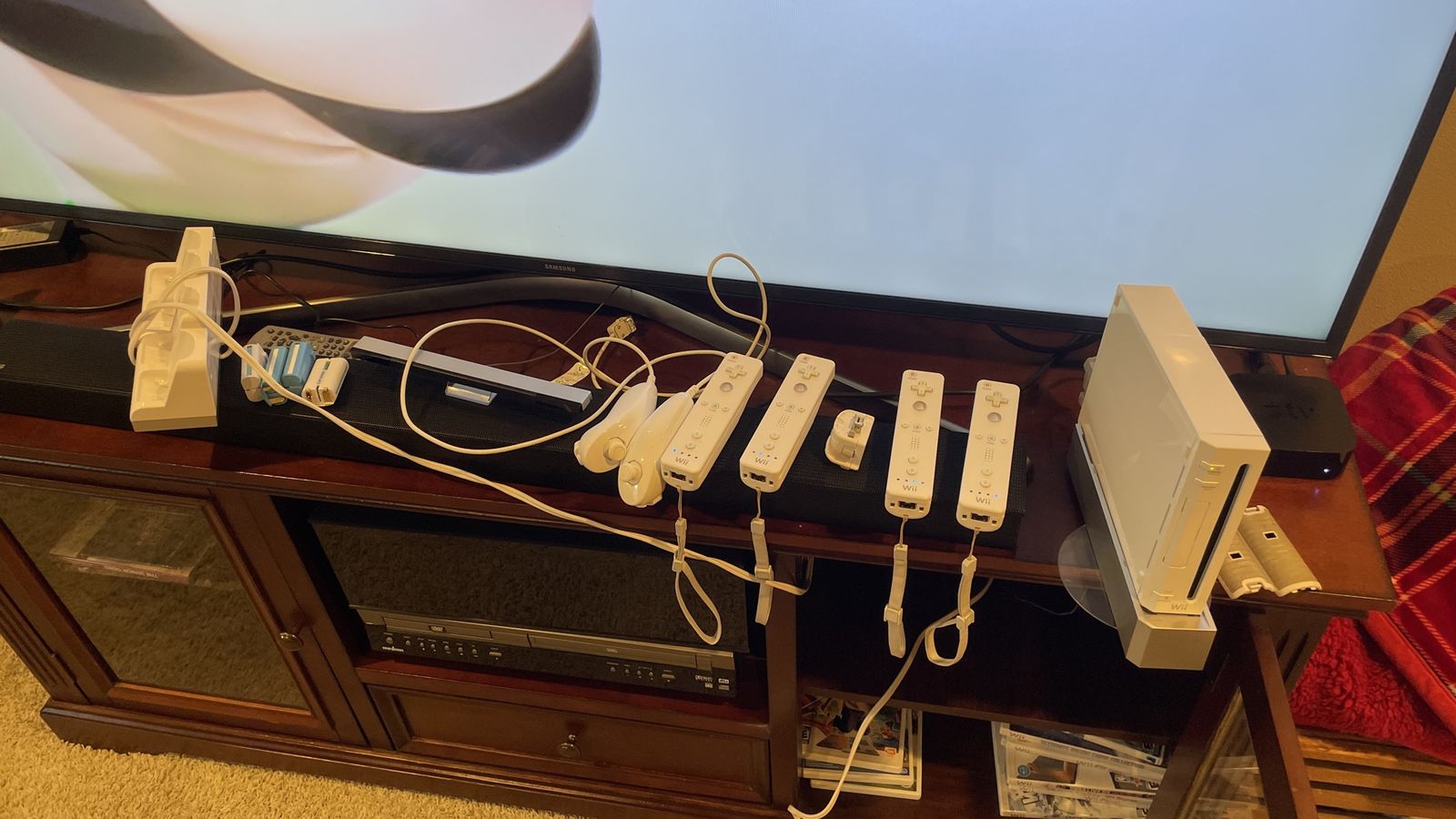 VenmoNintendo Wii game console with 21+ games. Four controllers and two nunchucks included. Also included are a 2 slot and a 4 slot battery recharger, step-up pad for exercise games, pad used for Wii “outdoor challenge” game, Zumba game with 2 belts, extra flexible plastic holder for controllers, one wheel for driving games. Some game titles are; Mario kart, super Mario, Galaxy, Wii ski, Wii sports resort, several hunting games, Wii play, M&M‘s cart racing, cook or be cooked, big brain academy, Wii sports, big buck Hunter, Mario party 8, super swing golf, game party, ultimate board game collection, and many others. All cables included.