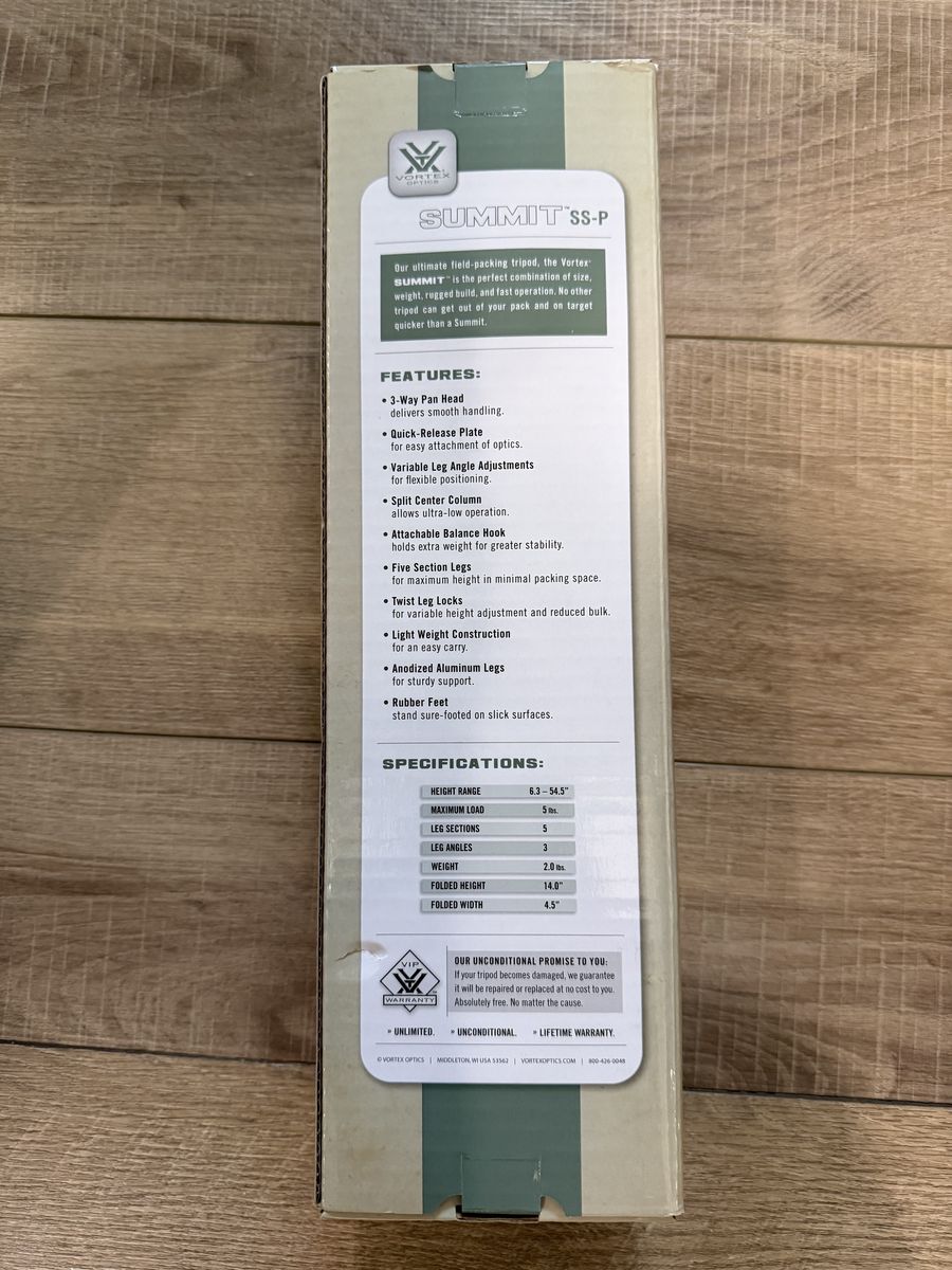 This is a new Vortex Summit SS-P Tripod. I was given in a few years ago and have just had it in storage. I never used it in the field and only had it out of the box to look at it. Message me with any questions.