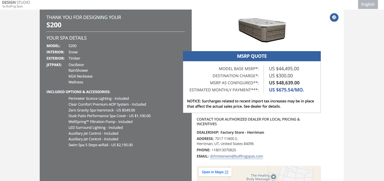 GooglePayThe best swim spa on the market! I purchased at Christmas so this is only 3 months old. This is great exercise for adults and great fun for children. It has every accessory you can buy including the stairs, hammok (still in box), cover, and splashpad sprayers. This was brand new and NOT a refurb unit A promotion at work has me moving out of state so unfortunately I have to sell this spa. I have included a screenshot from the Bullfrog website, if you purchase this new it will cost you $48k. This is perfectly clean and I will get it ready to move and pay for the crane to bring it to you. DO NOT buy new when you can save thousands on this brand new spa!