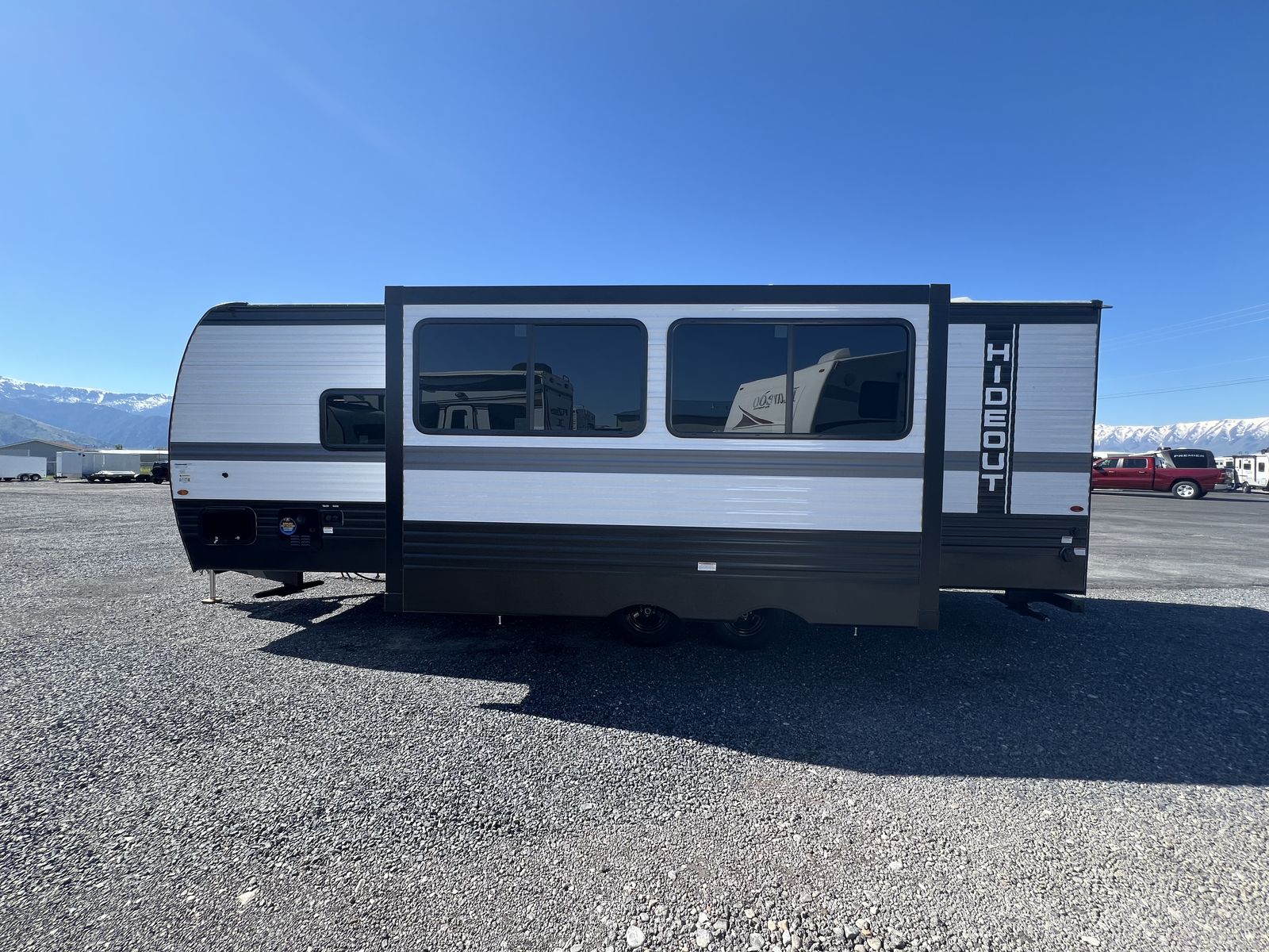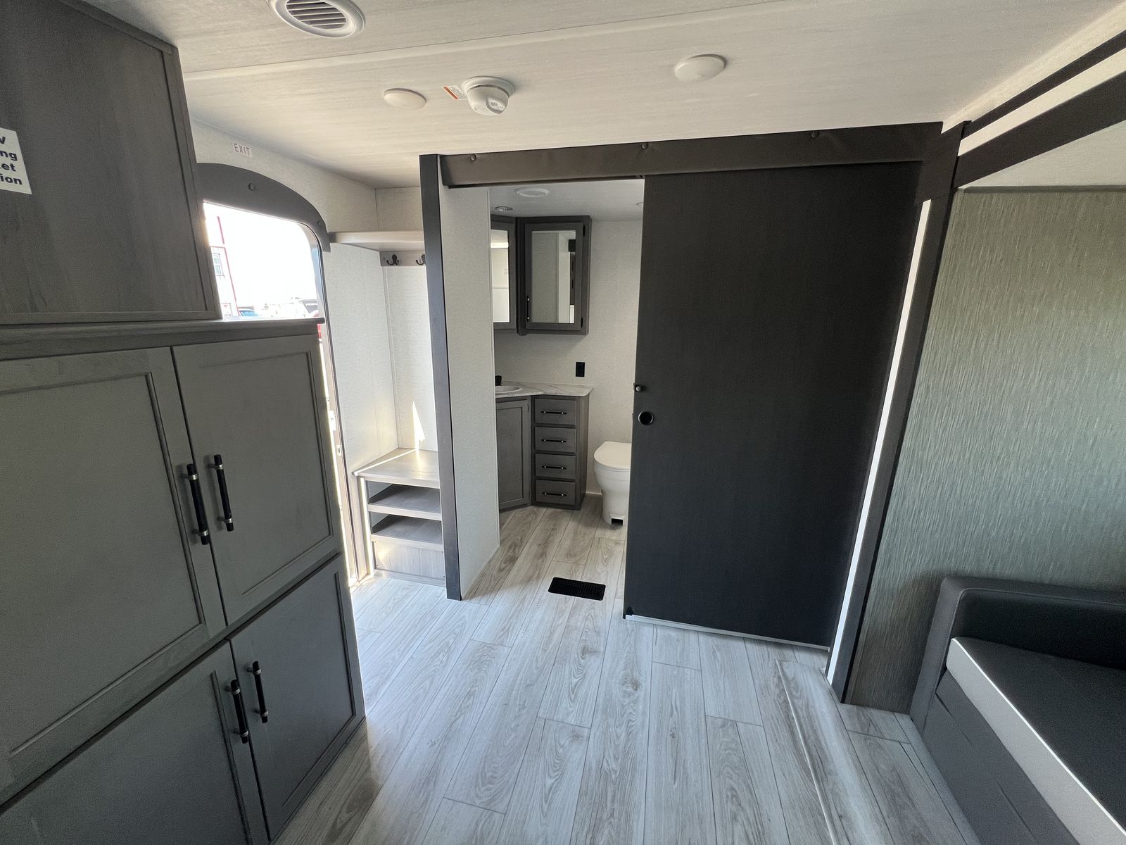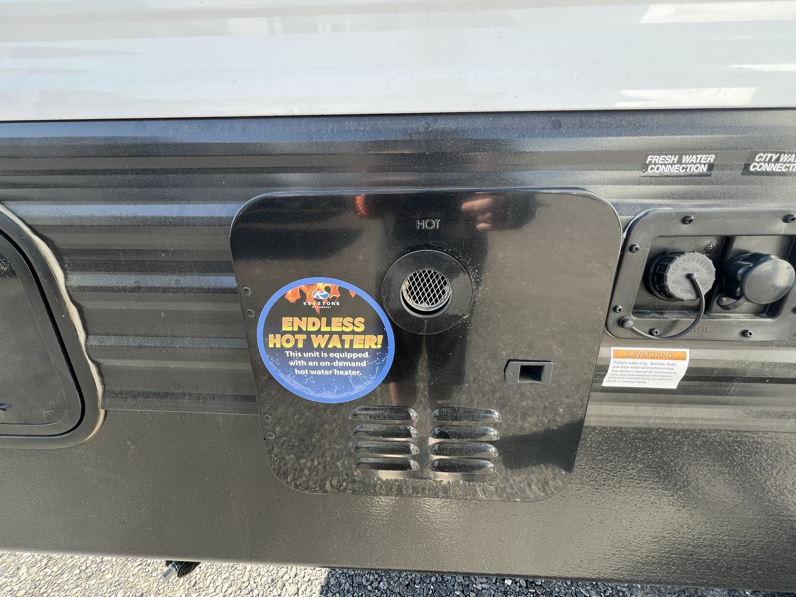 This rear bath floorplan is perfect for camping. Fully loaded with a tankless water heater, solar, power tongue jack and so much more.