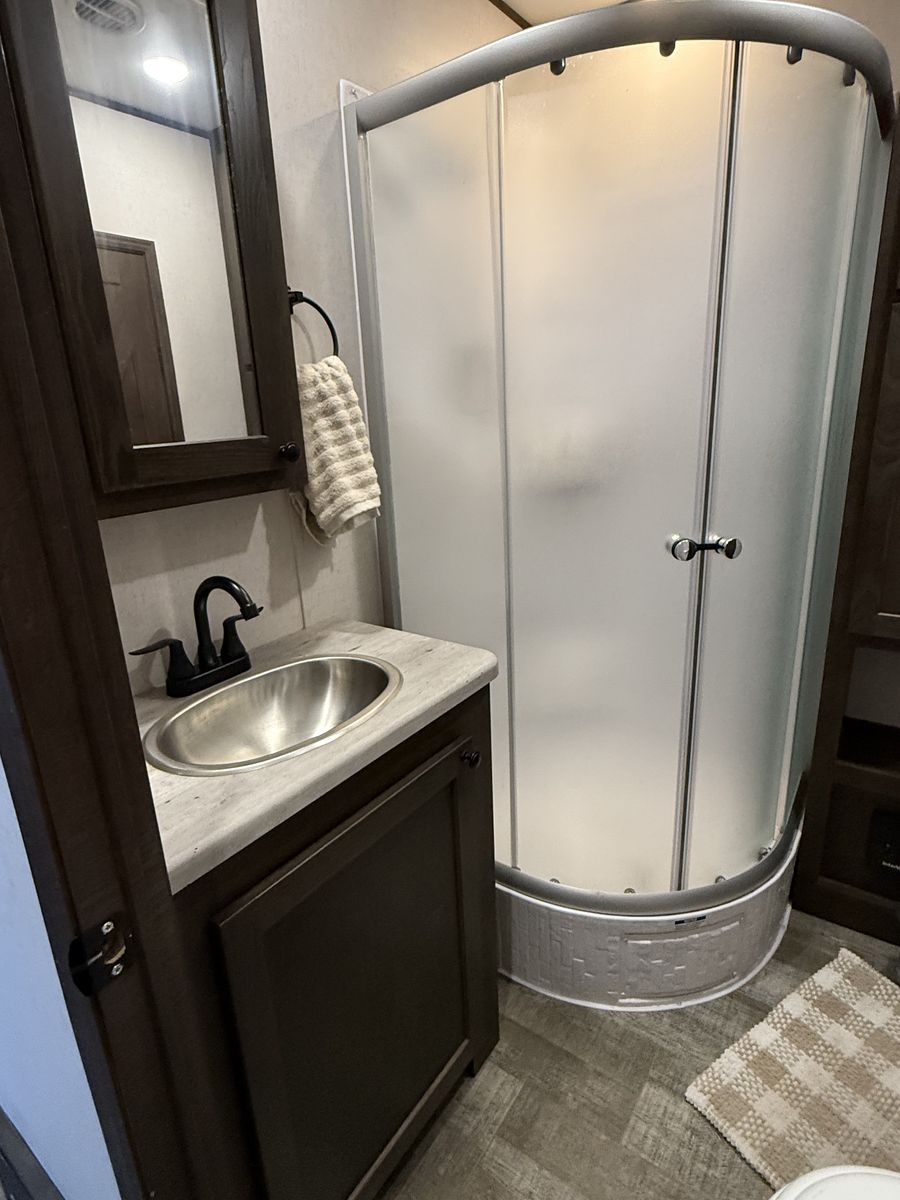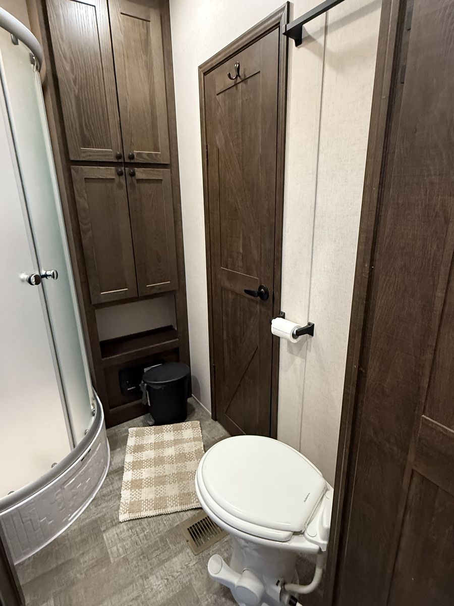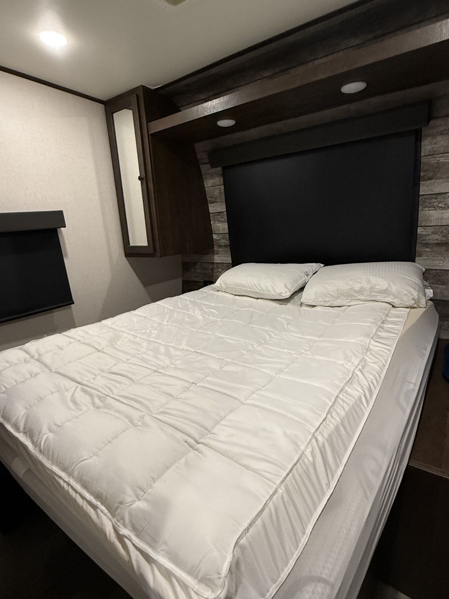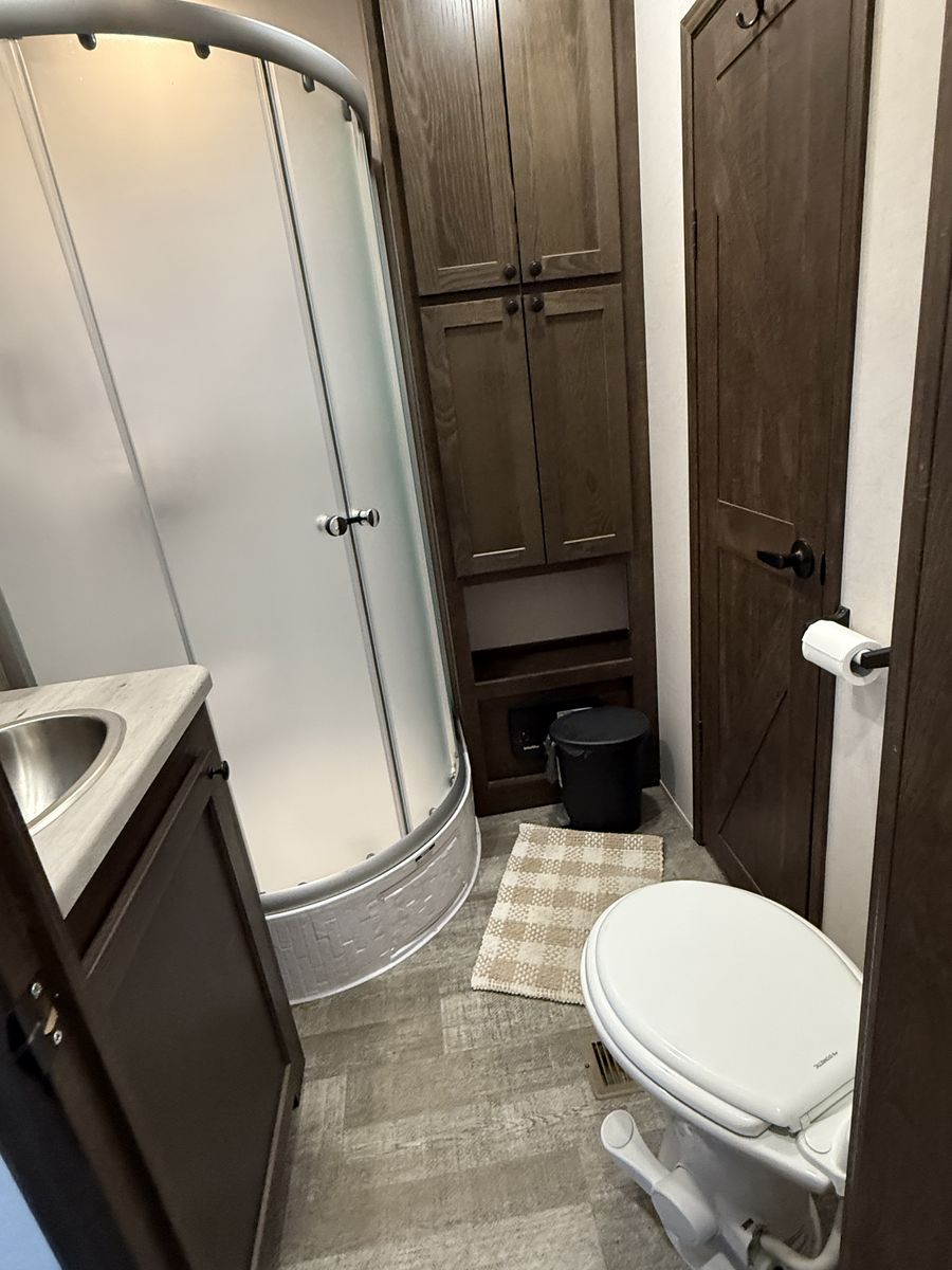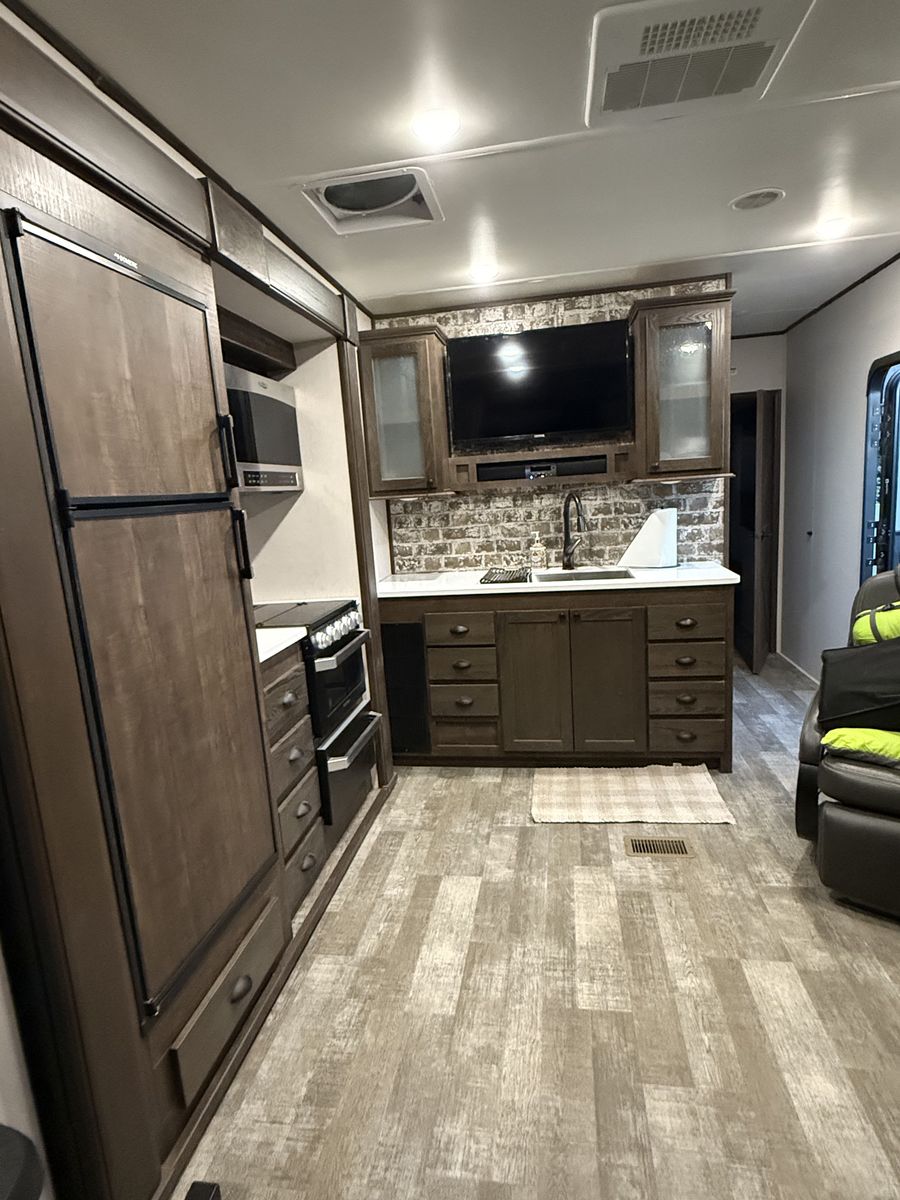 Key Features: Dry weight 7750 lbs 102 gallon fresh water capacity, 20 gallons of gasoline (shared between the generator and fuel pump for toys) 32'4 total length, 28' interior length 15' Garage Area with ample space for ATVs, motorcycles, or gear Private front bedroom with a queen bed and storage Queen electric bunk above the rear dinette – lowers for sleeping, raises for hauling Convertible dinette/sleeper adds flexible sleeping space Full kitchen – 3-burner stove, microwave, fridge Central Vacuum system for easy cleanup Rear ramp can be used as a patio with screen to keep bugs out Power tongue jack Full dry bath with shower, toilet, and sink 15,000 BTU A/C and furnace Power awning, LED exterior lighting, outdoor speakers Onboard fuel station for toys 74” Interior width with kitchen slide-in