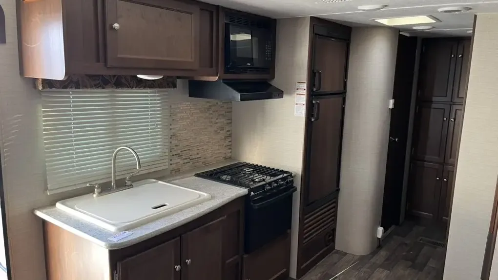 You’ll love the convenient upgrades, including an electric awning, electric tongue jack, aluminum wheels, a spare tire, and tons of extra storage throughout the trailer. Inside, enjoy an upgraded, comfortable queen mattress, day/night shades, and plenty of windows that bring in natural light. There’s generous cabinet space in the kitchen, bedroom, and bathroom, giving you room for all your gear.