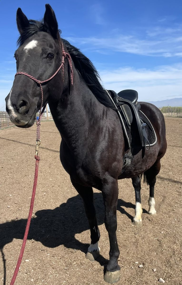 19 year old, 15.3hh mare. Lovely to ride with an extensive history of experience and training. She does prefer a rider who is soft and balanced as she can be forward at times, so not for beginners. Had time off to produce Oldenburg foals and recently came back into work. Can go English or Western. Message for current videos of WTC under saddle!