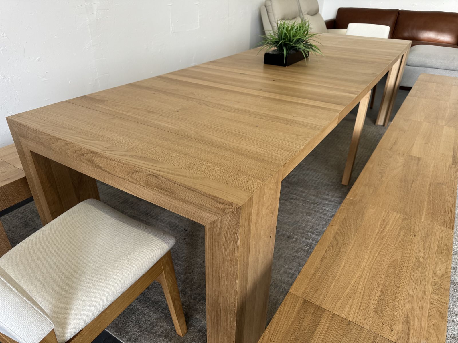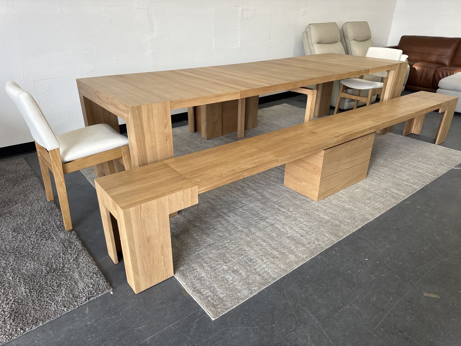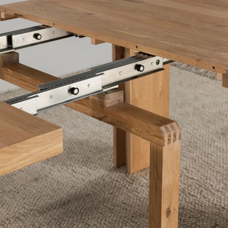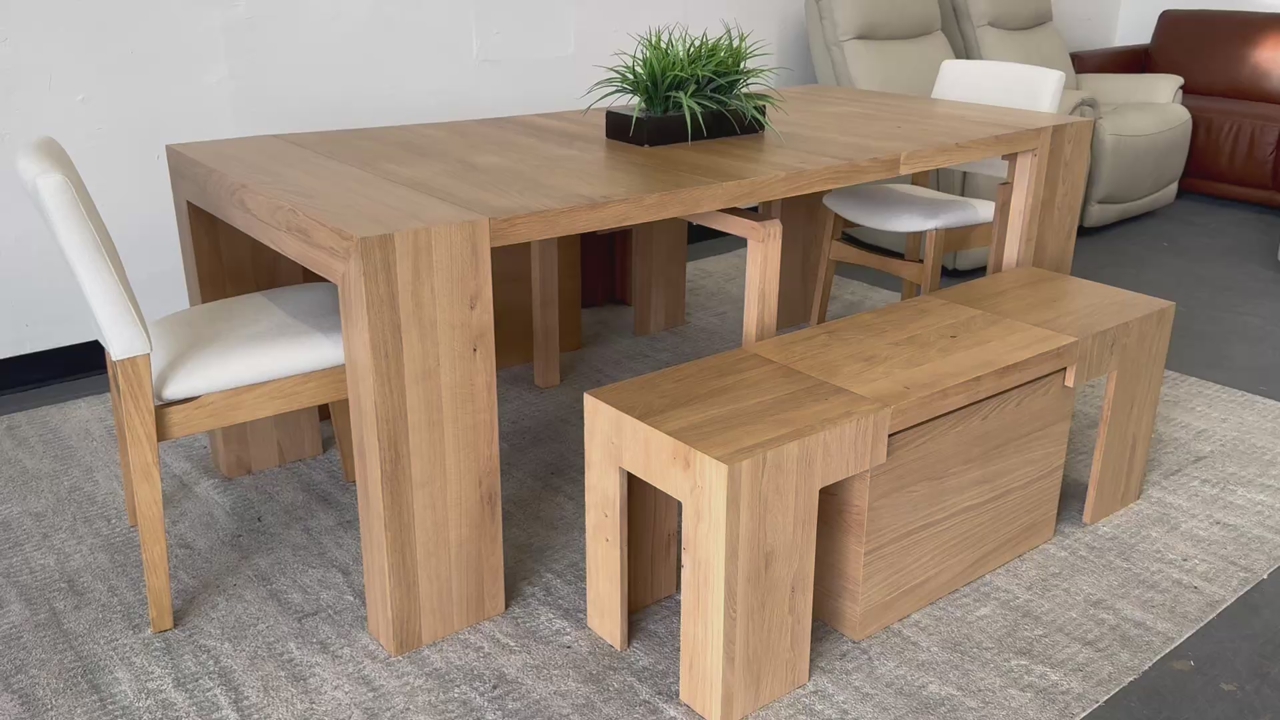 Features: Made of natural wood - Scandinavian Oak Solid oak table with panels crafted of engineered hardwood Extendable Table and Bench Up to 6 Different Lengths Table Seats up to 12 People, Bench Seats up to 6 People Patented Innovative Ball Bearing Mechanism Includes Table, 2 Benches and 2 Chairs