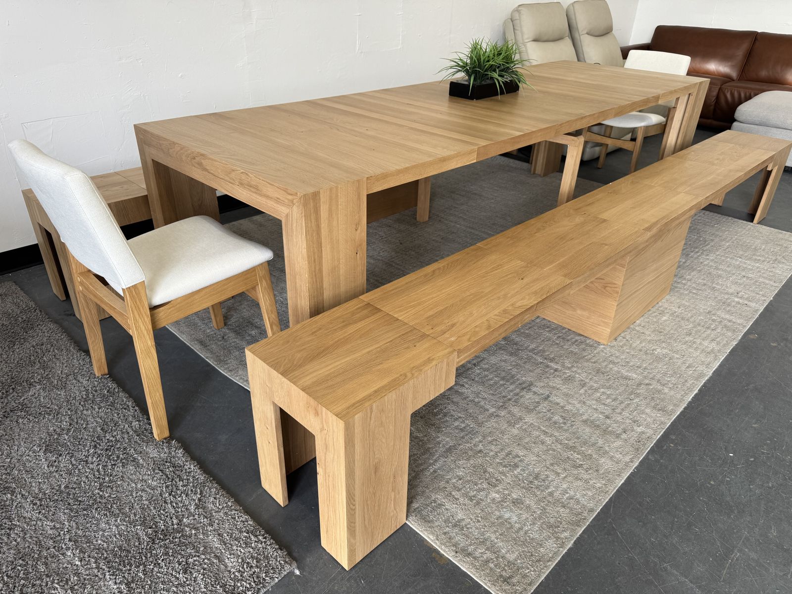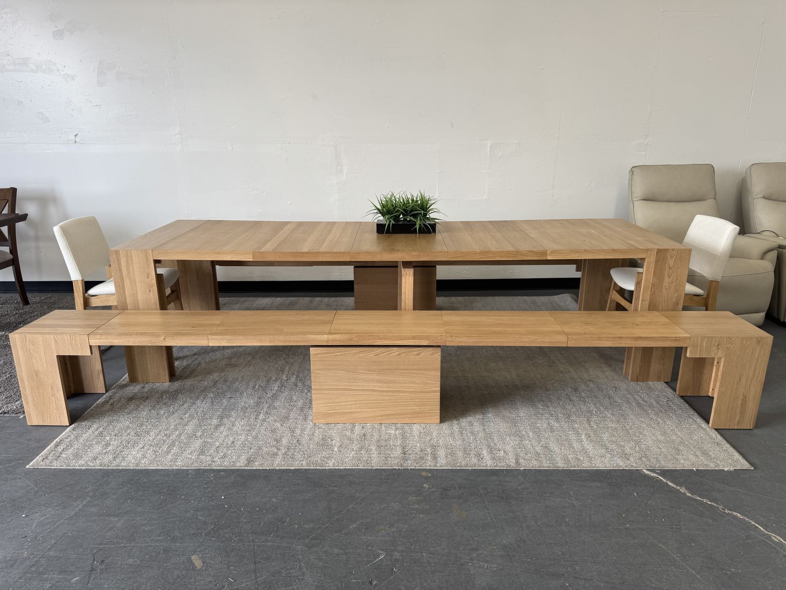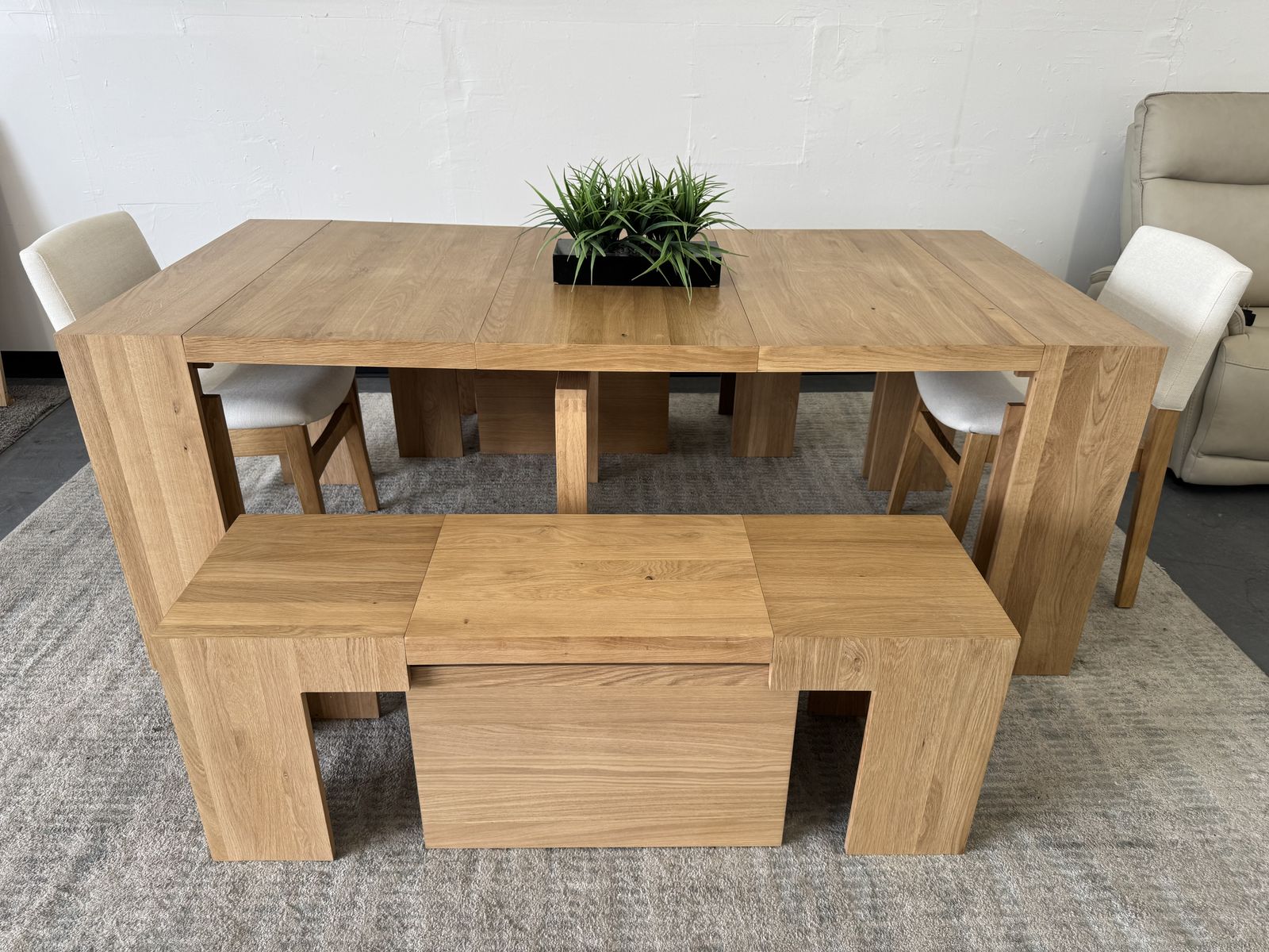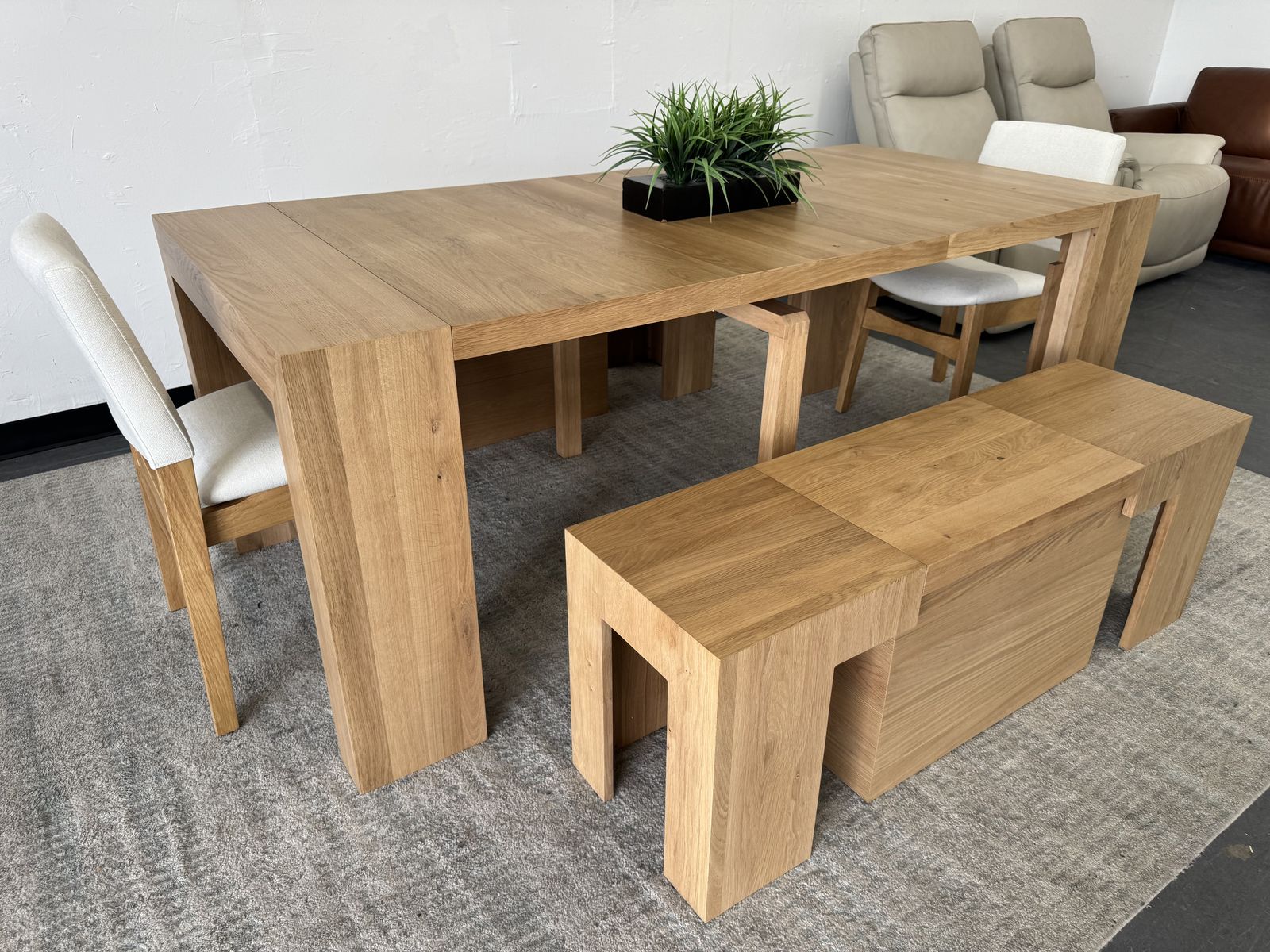 Features: Made of natural wood - Scandinavian Oak Solid oak table with panels crafted of engineered hardwood Extendable Table and Bench Up to 6 Different Lengths Table Seats up to 12 People, Bench Seats up to 6 People Patented Innovative Ball Bearing Mechanism Includes Table, 2 Benches and 2 Chairs