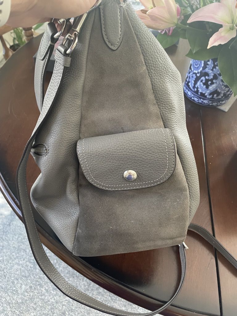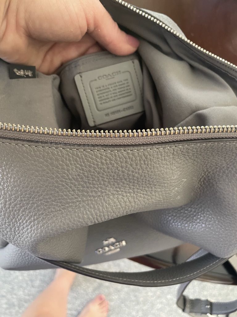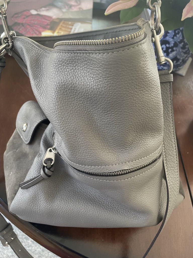 ApplePayLight gray leather bag. Use like new. $100 OBO.