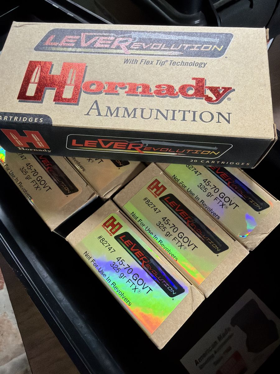 VenmoBrand new — 140 rounds (7 full 20-round boxes) of Hornady LEVERevolution .45-70 Government 325 grain FTX ammunition (#82747). These feature the polymer-tipped Flex Tip Expanding (FTX) bullets designed specifically for lever-action rifles — safe for tubular magazines, with improved ballistics, flatter trajectory, and excellent expansion on game. Muzzle velocity around 2000–2050 fps. Stored indoors in perfect condition with holographic seals intact. Ideal for hunting deer, bear, or hogs with your Marlin, Henry, or similar lever gun.
