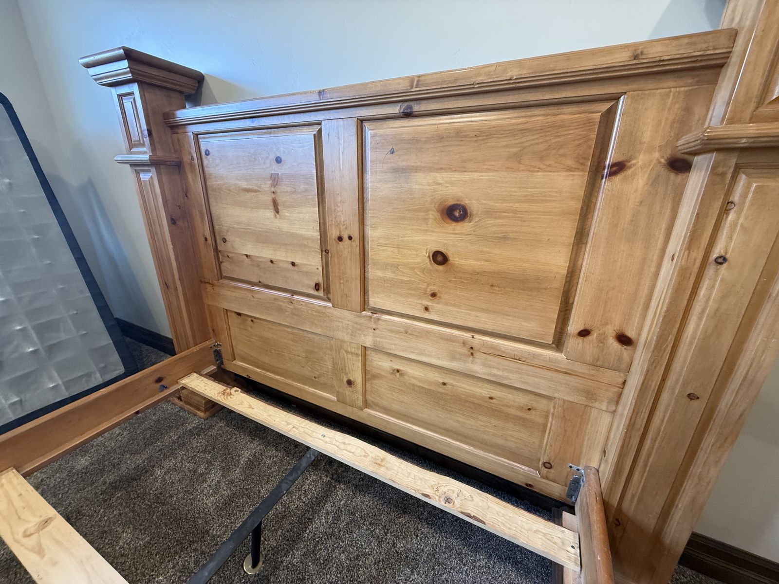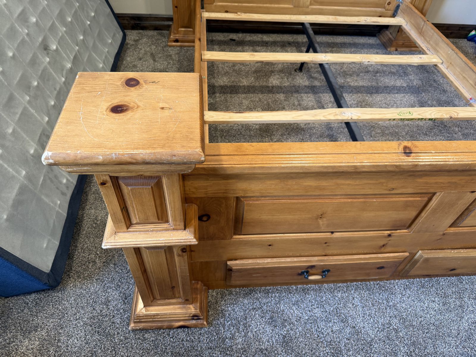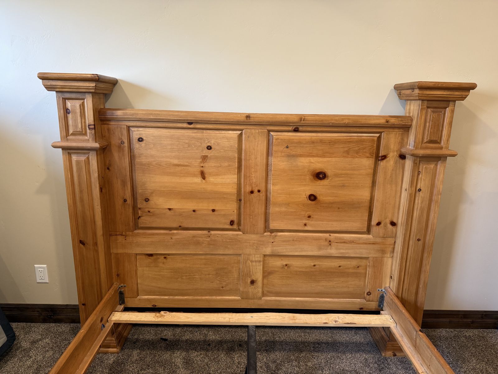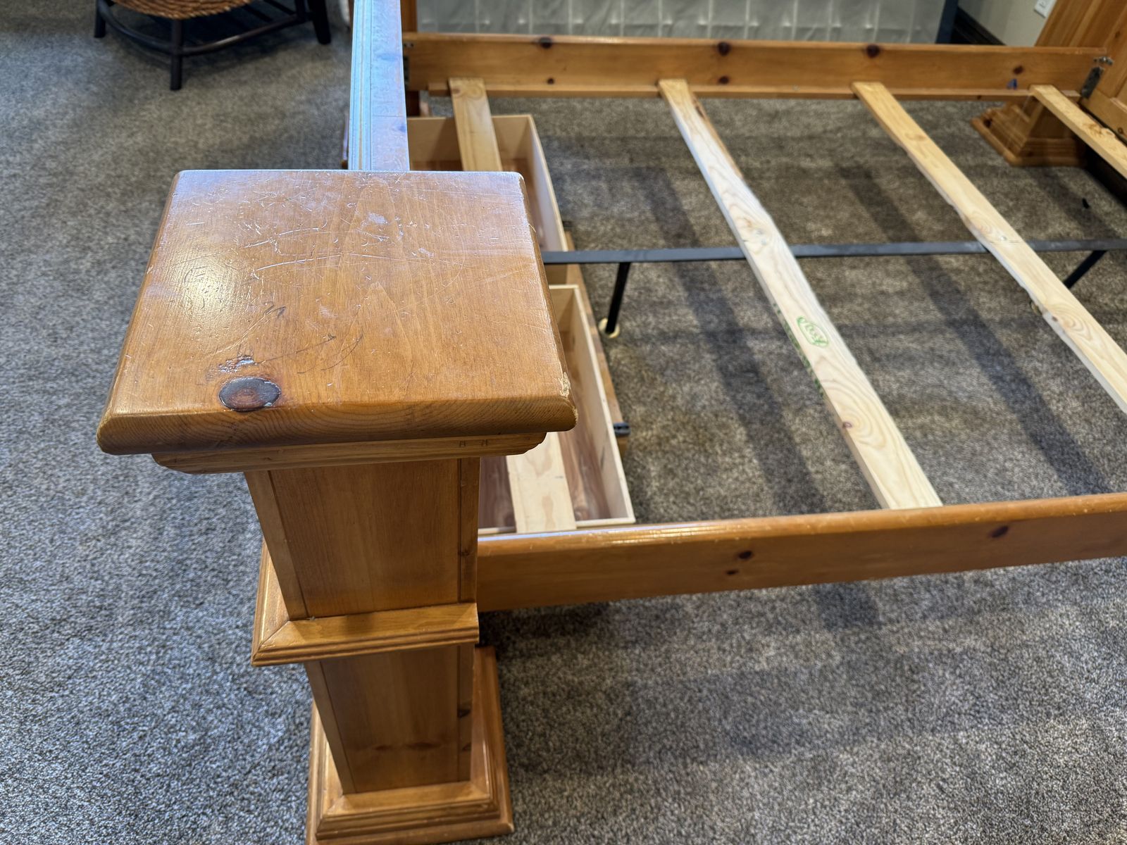 Queen bed Structurally sounds. Has its bruises and blemishes for used furniture but one could do wonders to make like new fairly easy.
