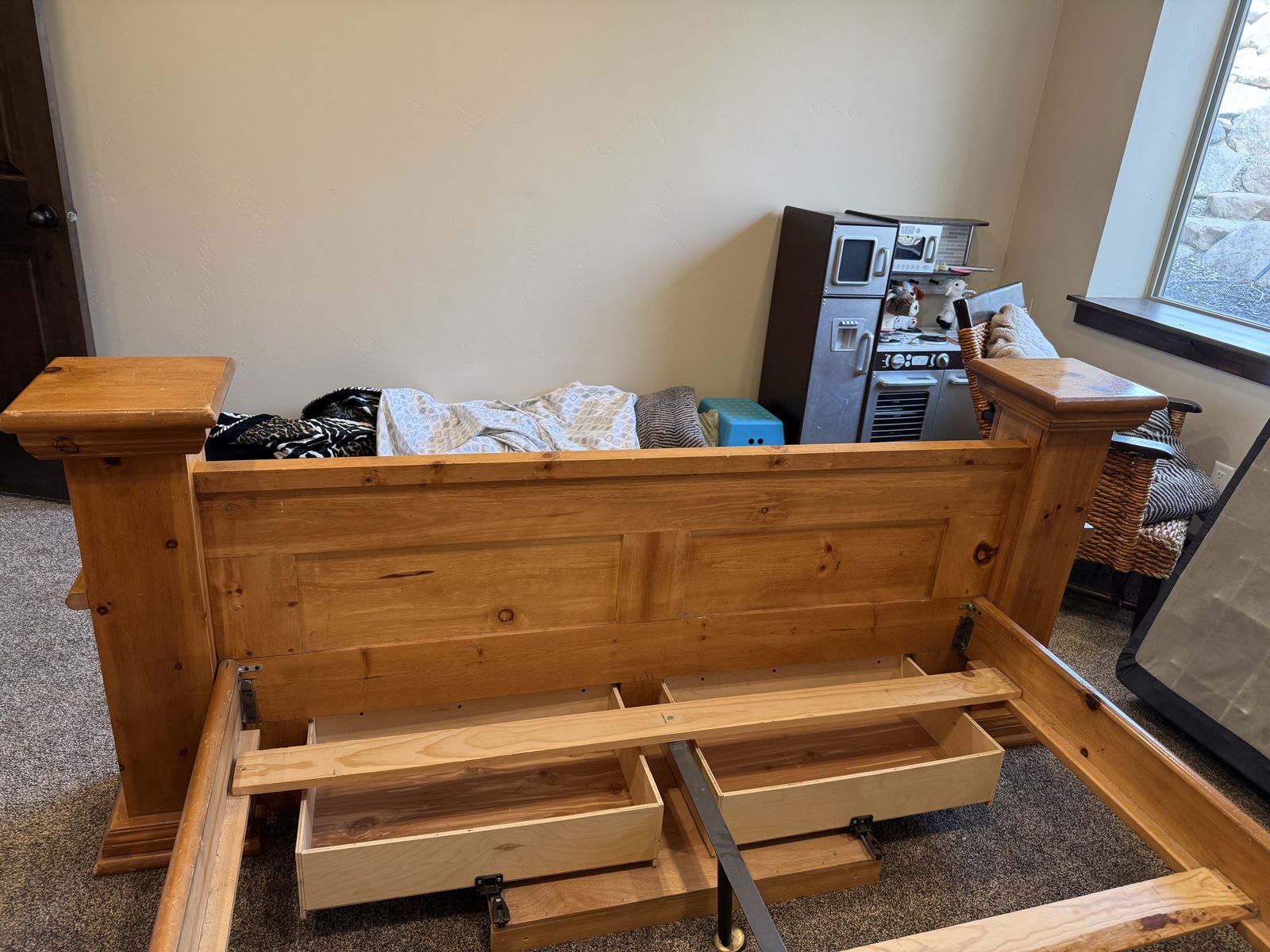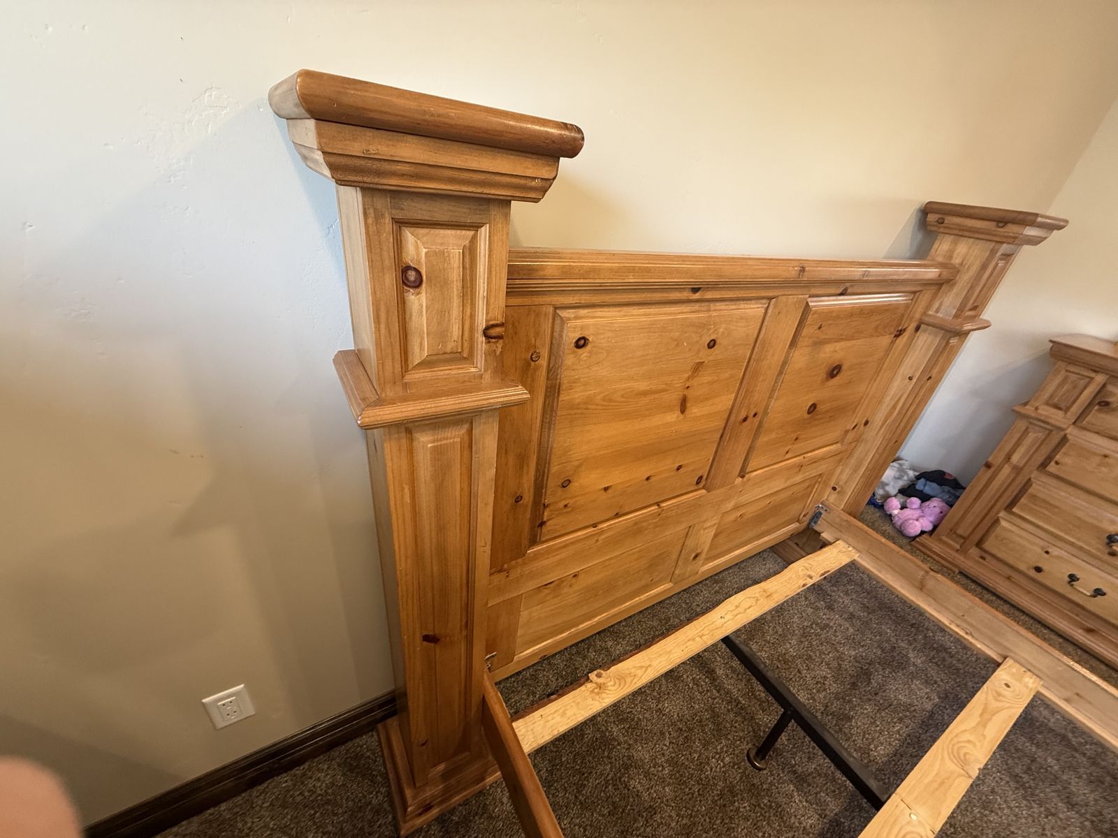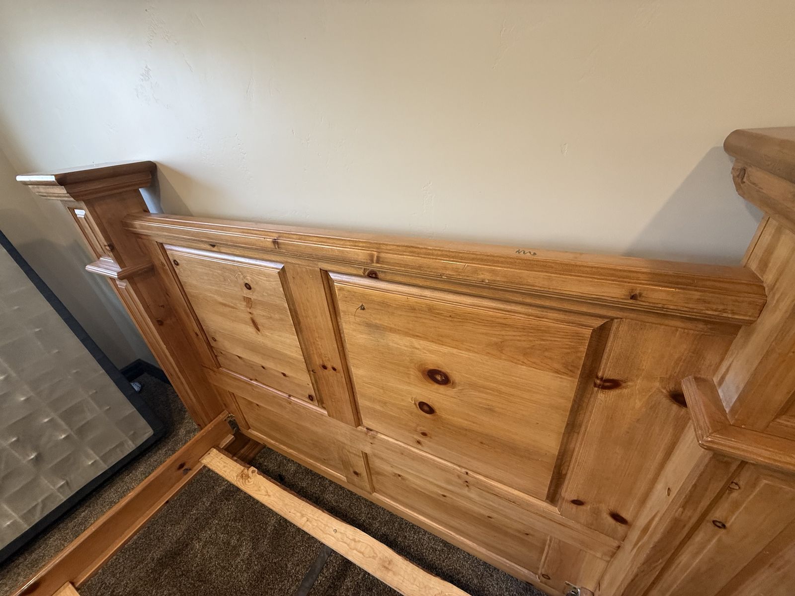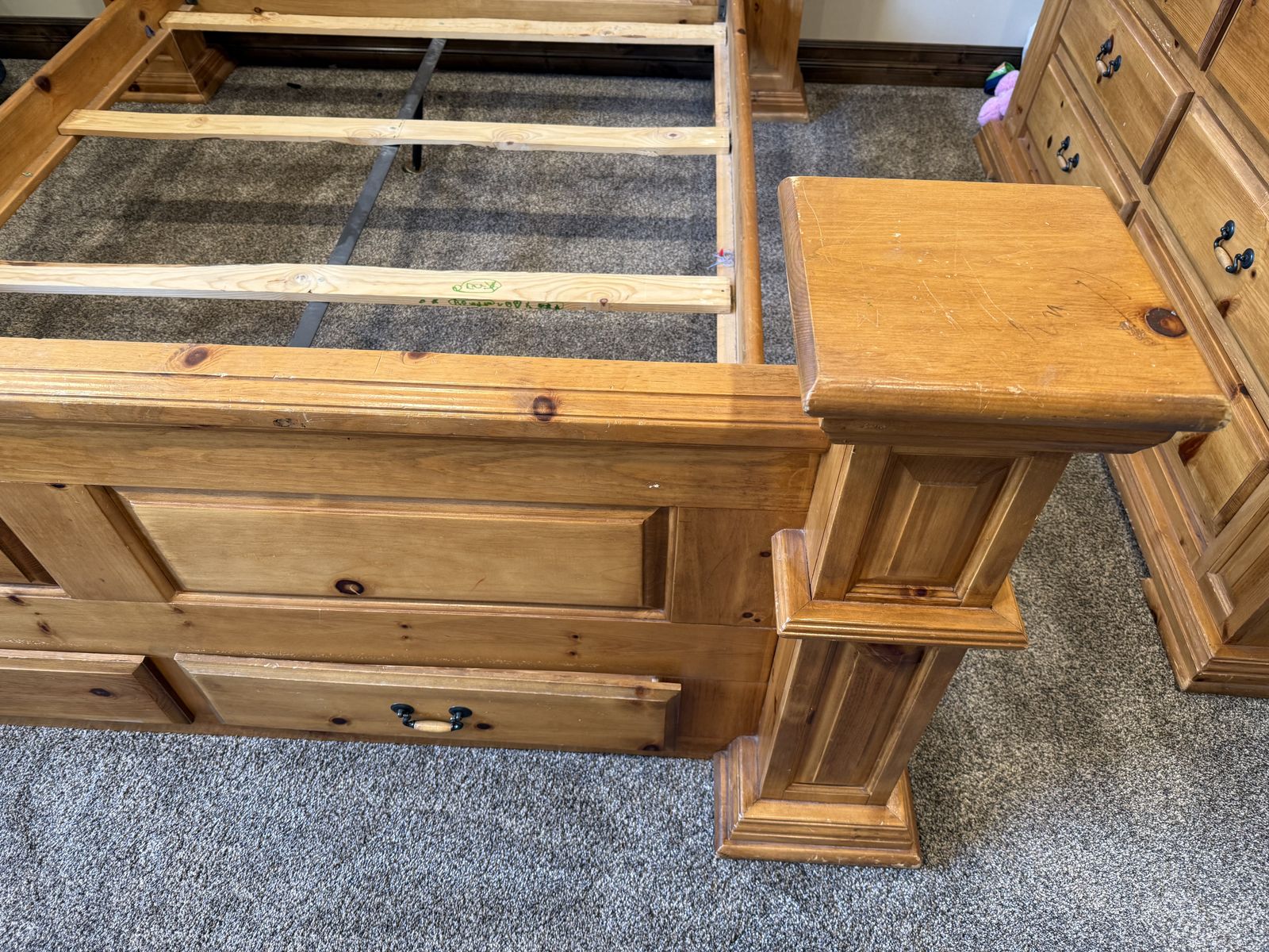 Queen bed Structurally sounds. Has its bruises and blemishes for used furniture but one could do wonders to make like new fairly easy.