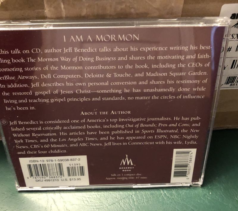 Venmo$5. I Am A Mormon, talk on CD by Jeff Benedict. This is a talk on CD about Jeff Benedict's experience writing his best-selling book "The Mormon Way of Doing Business." He shares the motivating and faith-promoting stories of the Mormon contributors to the book, including the CEOs of JetBlue Airways, Dell Computers, Deloite & Touche, and Madison Square Garden. He describes his own personal conversion and shares his testimony. The Church of Jesus Christ of Latter-day Saints, LDS. Cash preferred. Pick up only in southwest Orem.