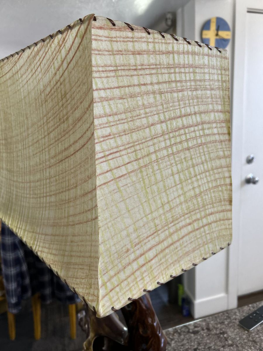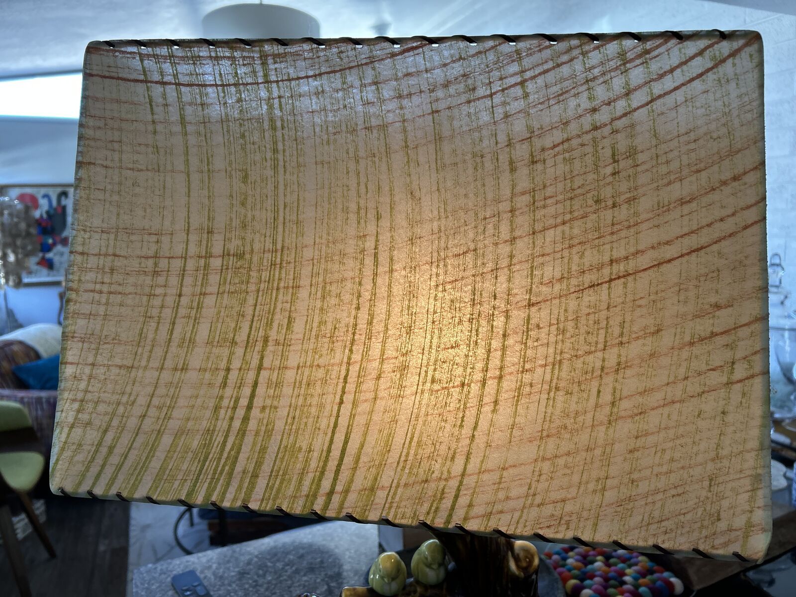 Organic mid-century design with strong California pottery influence. Includes original laced rectangular shade.