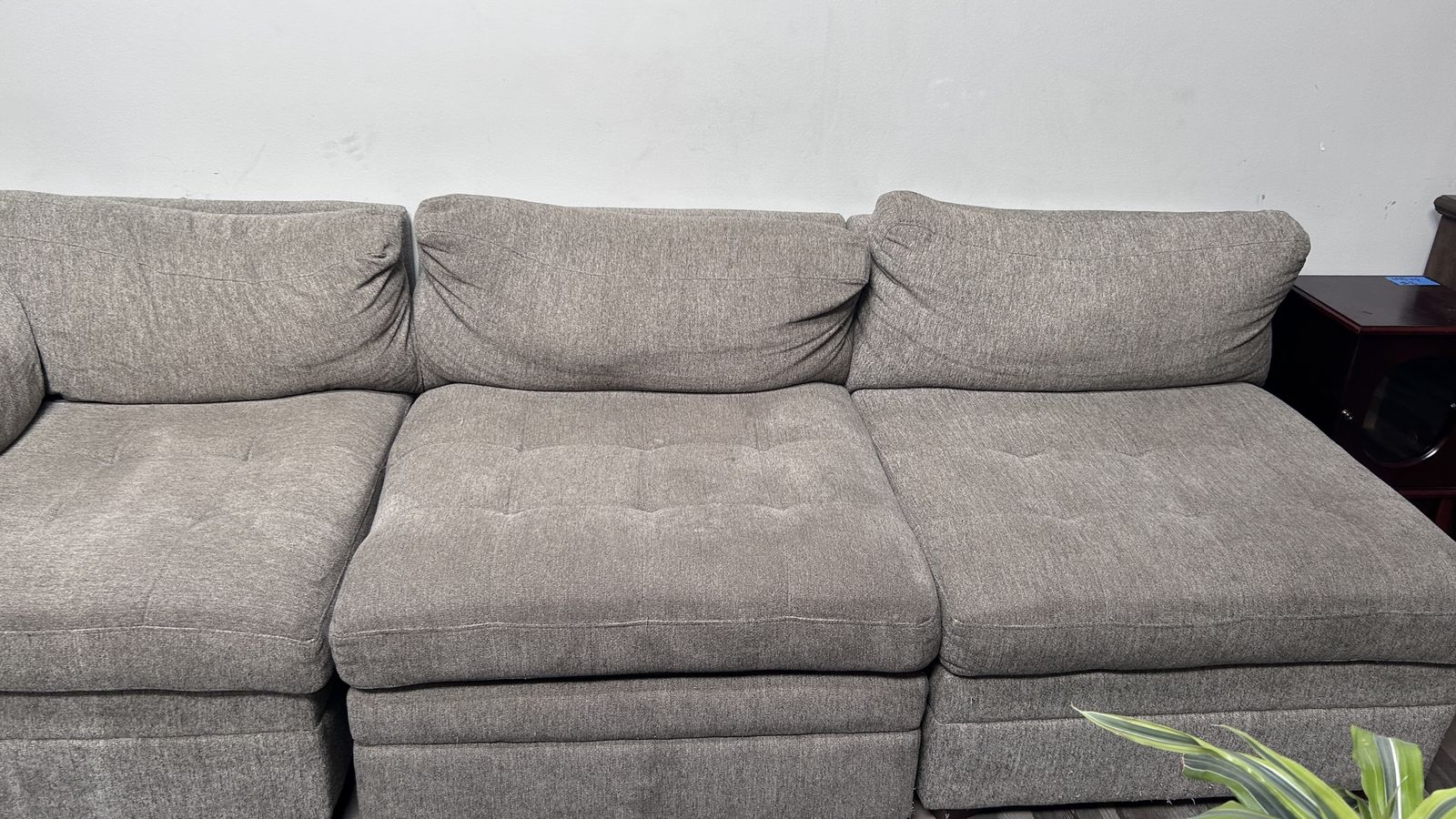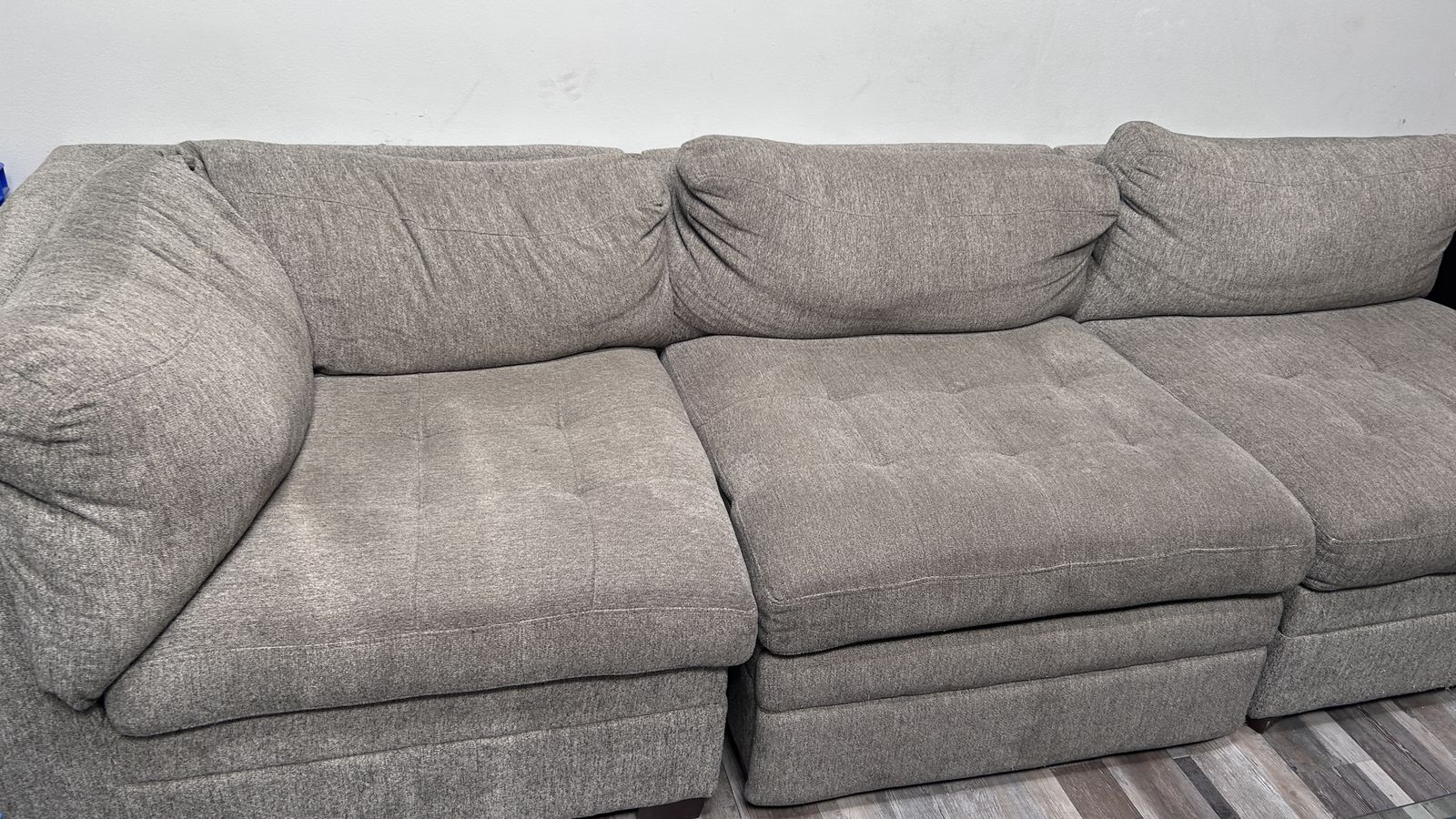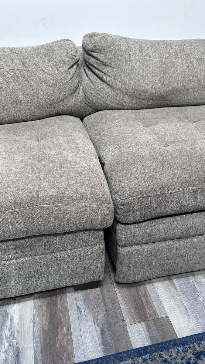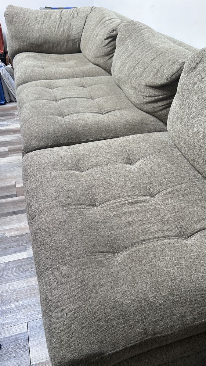 Three Piece Sectional Couch, Sofa, Davenport, in a soft light brown color. In good used condition.