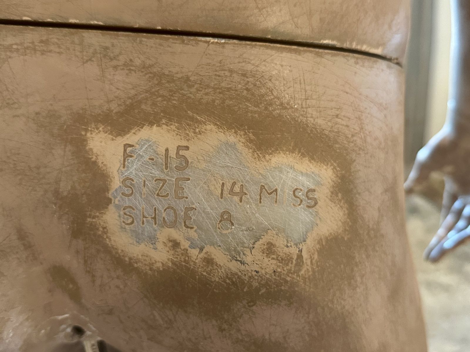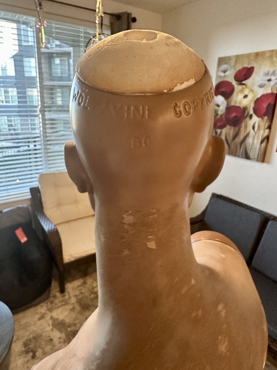RARE 1986 Wolf & Vine Vintage Mannequin - High-End Studio Piece Price: $175 (Or Best Offer) Calling all vintage collectors and boutique owners! This is a genuine, heavy-duty fiberglass mannequin from the iconic Wolf & Vine (Greneker) studio. Dated September 15, 1986, this is a true "glamour era" piece with a stunning, high-fashion facial sculpt reminiscent of 80s supermodels. The Details: • Maker: Wolf & Vine (Los Angeles) — highly sought after for superior craftsmanship. • Era: Mid-80s (Date stamped 9/15/86). • Size: Marked "Misses Size 14" (Vintage fit) with a size 8 shoe mold. • Condition: Authentic "Project" condition. She has beautiful "crazing" and surface wear that gives her an incredible industrial/artistic look as-is. Some professional filler (Bondo) has been applied to the hip for structural reinforcement—she is solid and ready for paint or display. • Bonus: Includes original hands and heavy-duty glass/metal base (hard to find!). Why buy this? Modern mannequins are cheap plastic; this is professional-grade fiberglass meant to last a lifetime. Whether you want a striking piece of home decor, a high-end display for your vintage shop, or a restoration project, this is a rare find with all its original markings intact.