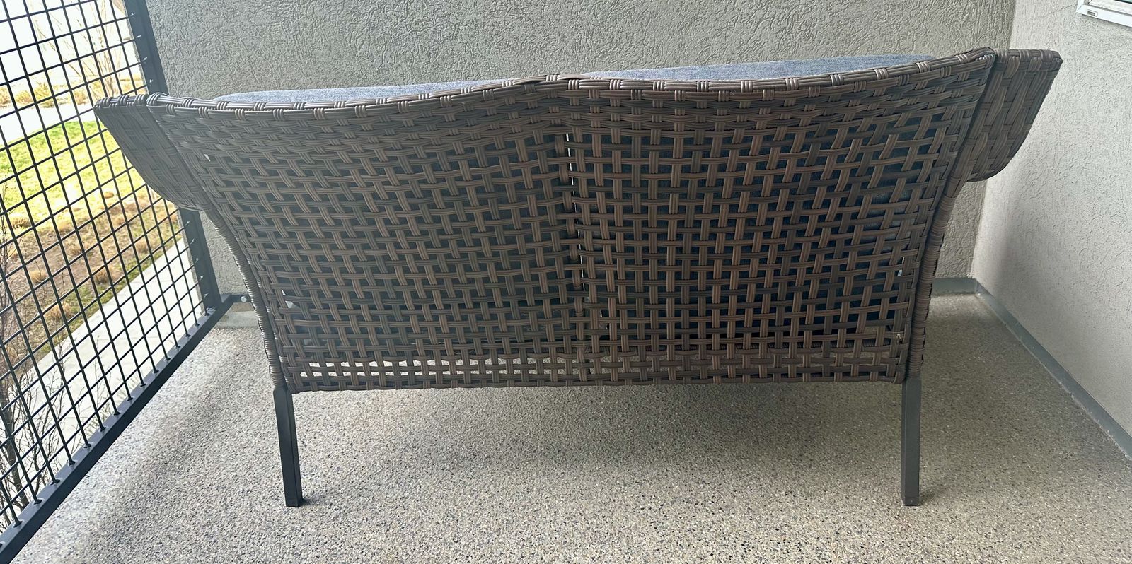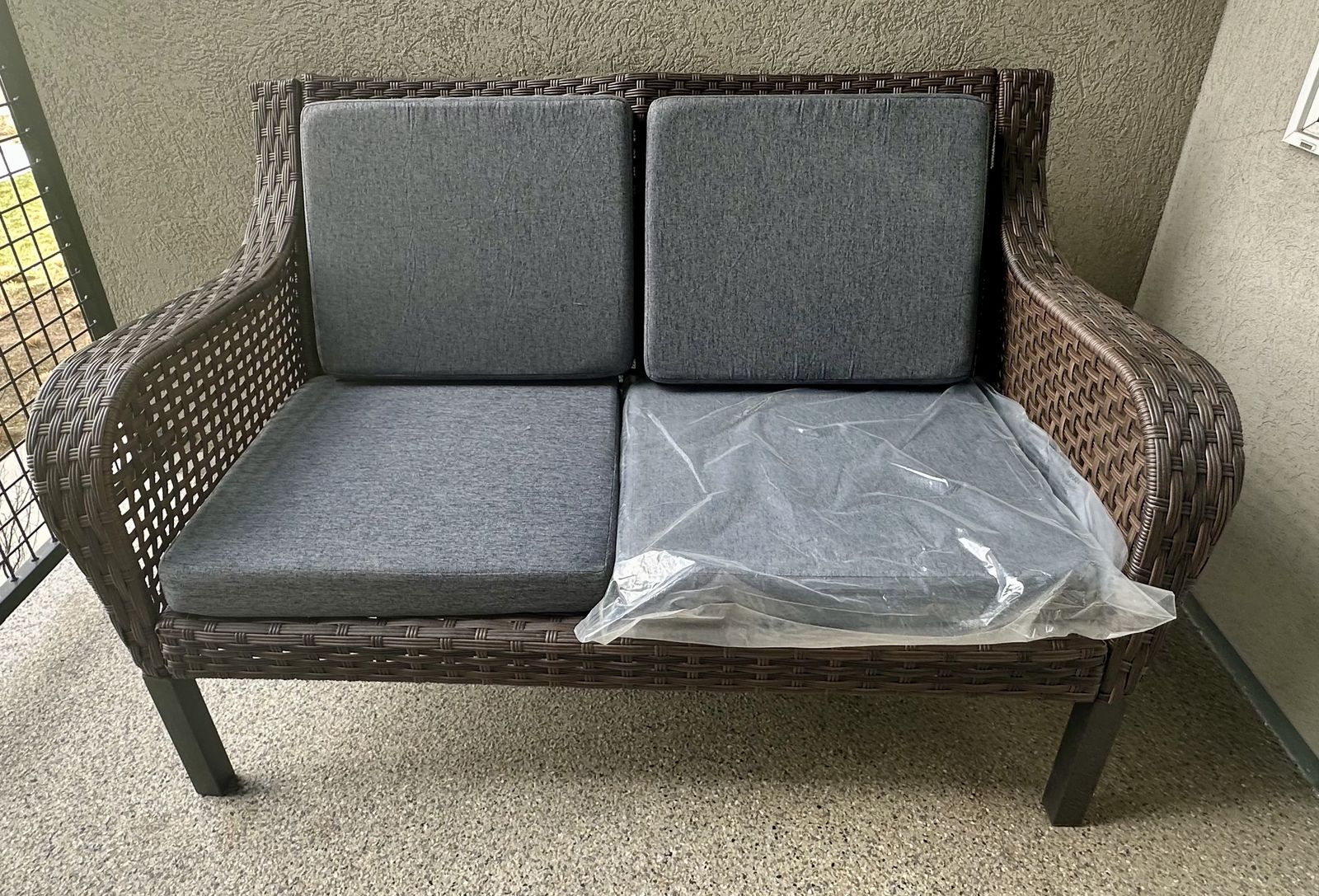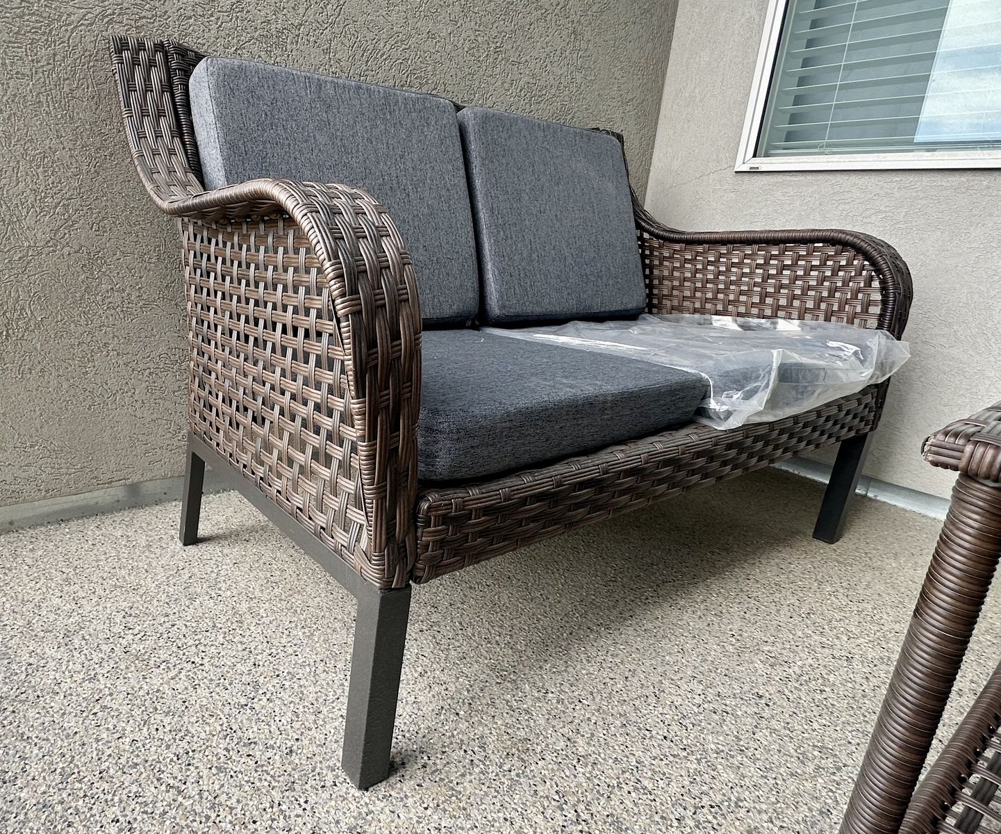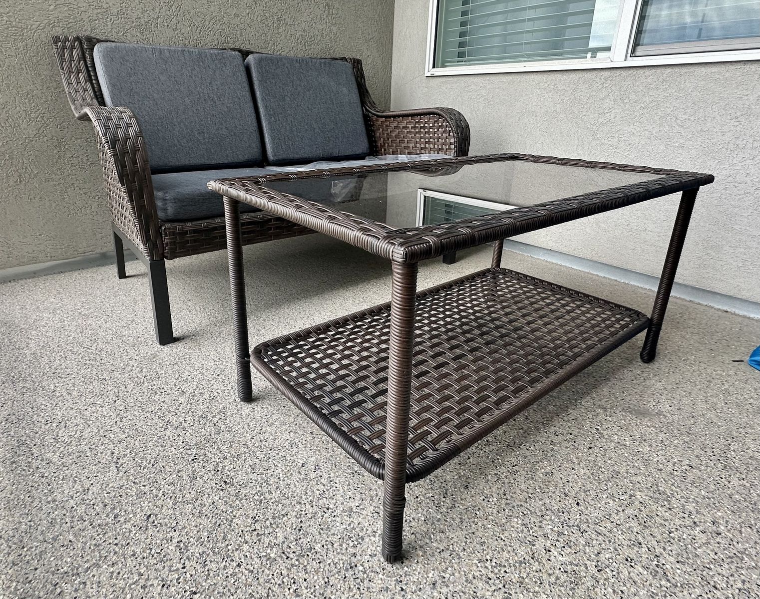 Beautiful brand new wicker loveseat with built-in side table and lower shelf—perfect for patios, balconies, or outdoor spaces.